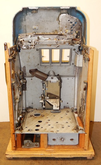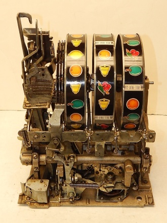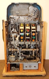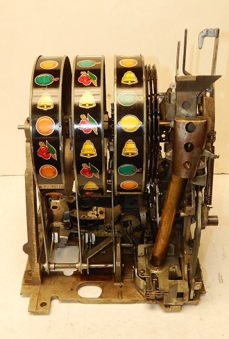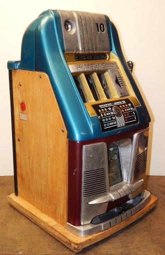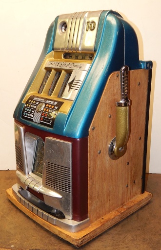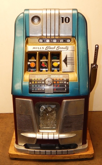 Mills Black Beauty 10 cent, in original condition, original reel strips, front load Jackpot, original back door, original cash box, all locks are Mills locks with one key. Front loader lock and back door locks are keyed alike. If you are looking for a nice original machine untouched here you are. This machine has been cleaned, lube and adjusted . Ready for many years of trouble free play.