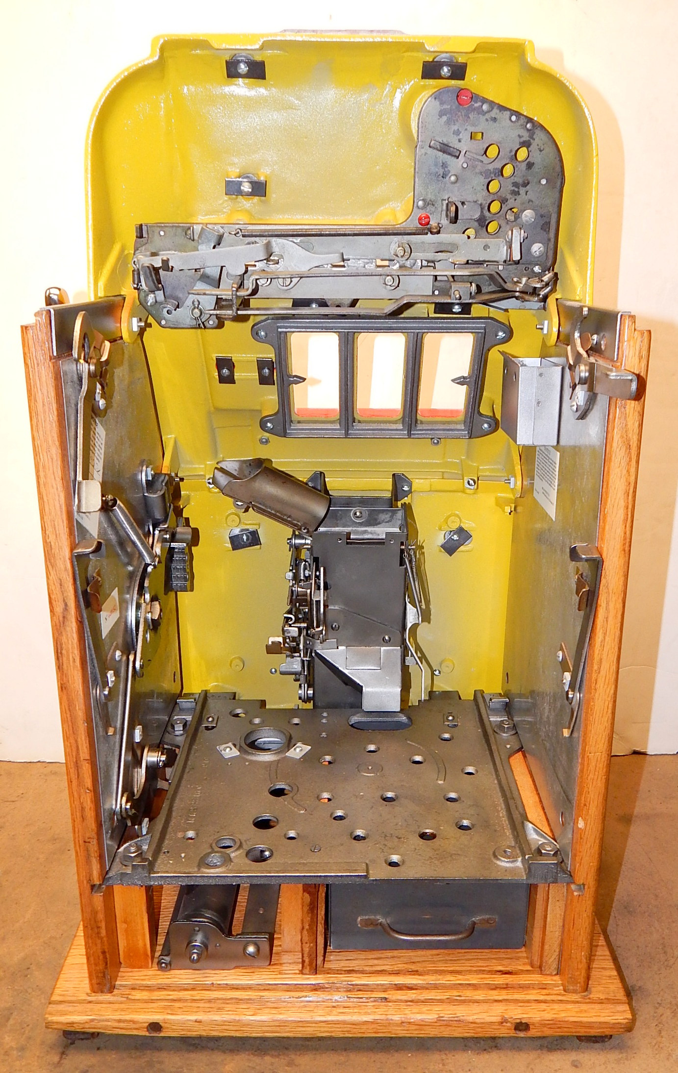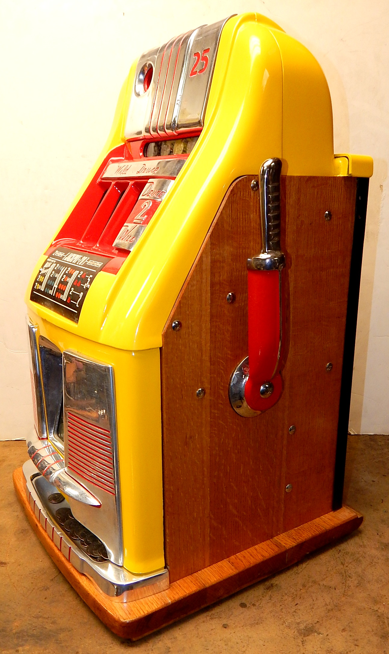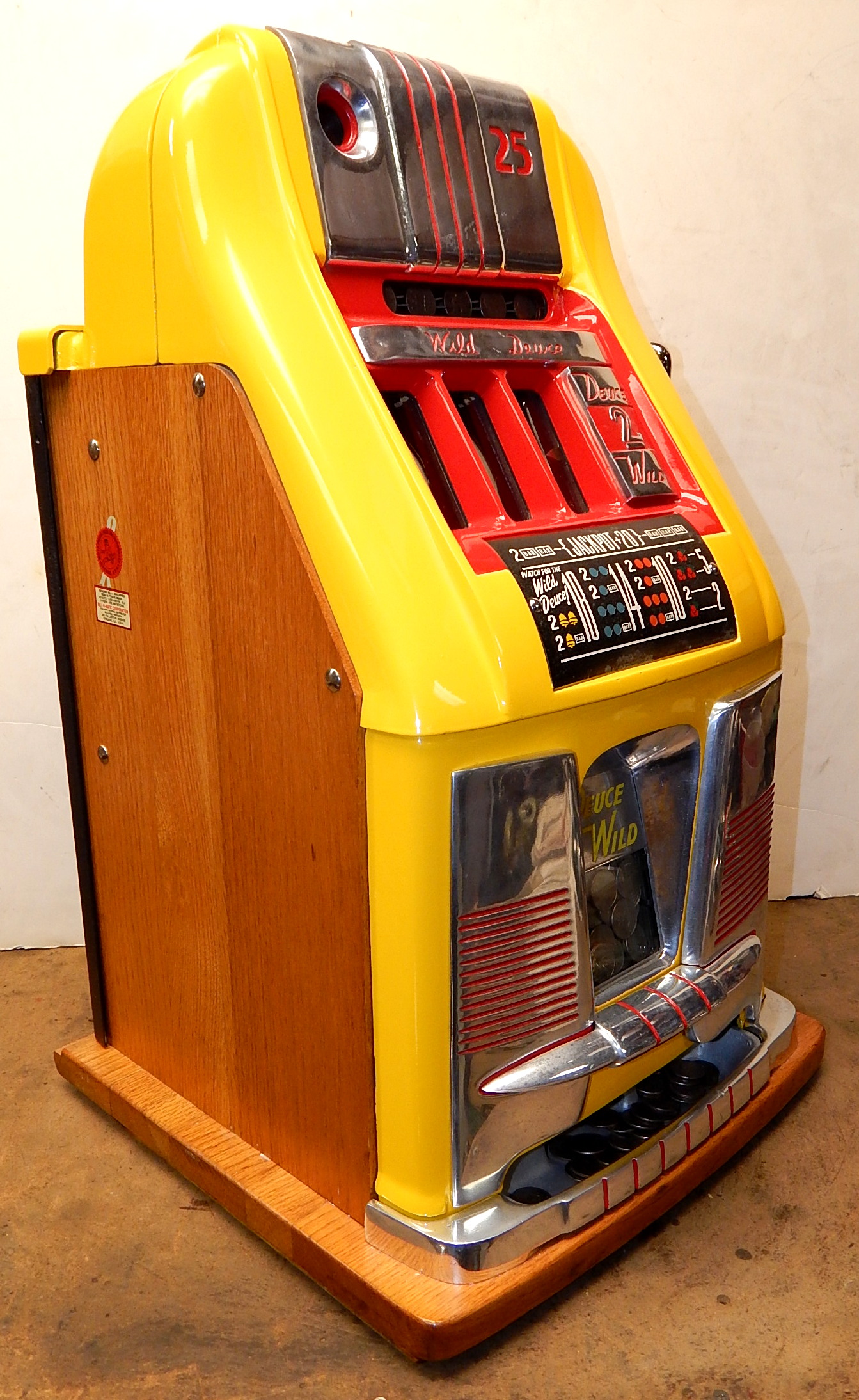 Mills 1959 Deuce Wild 25 cent, This is a very nice previously restored machine. Colors Yellow with Red. Mint condition original award card, Jackpot with reserve, original back door with original Mills lock with one key, original cash box. Oak cabinet Play easy.