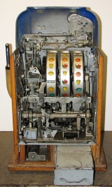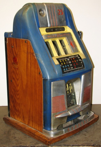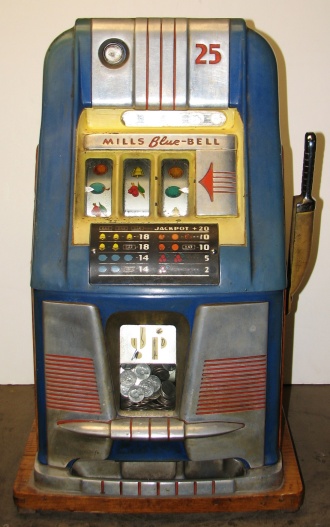 Mills 1949 Blue Bell Hi-Top 25 cent, in original condition in line to be restored. Original award card, original reel strips, Jackpot with reserve, original back door with Mills lock with one key, original cash box. Still has the original paper inspection tag and serial number on the inside of the cabinet. Plays very easy, 2-5 pay out.