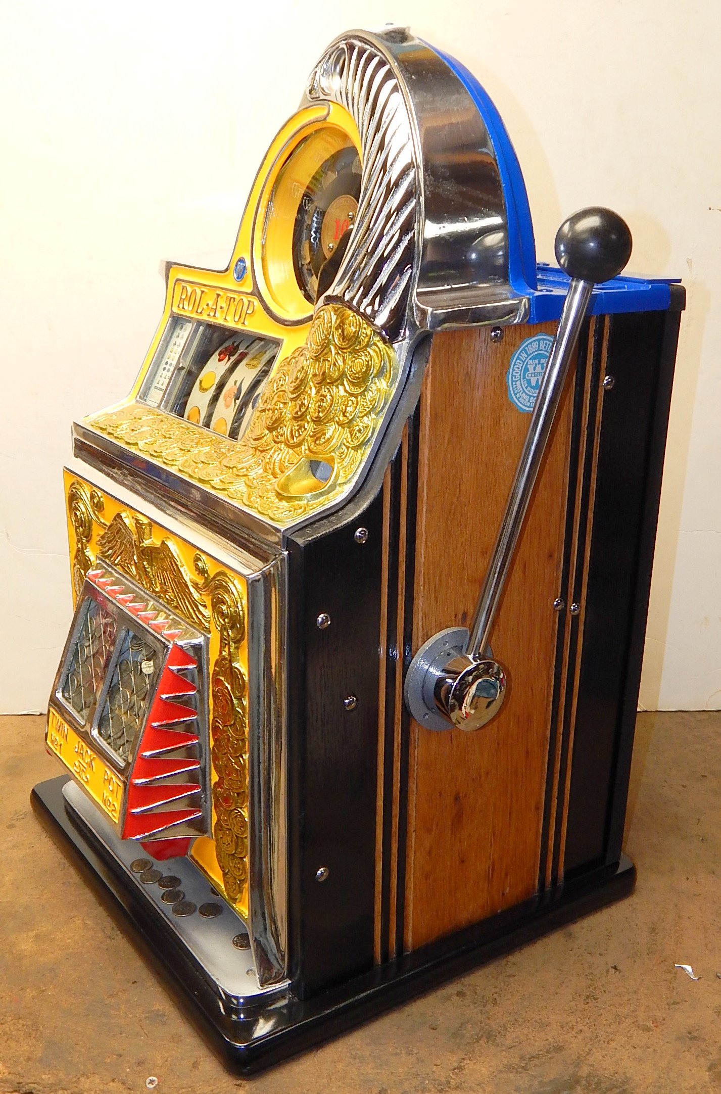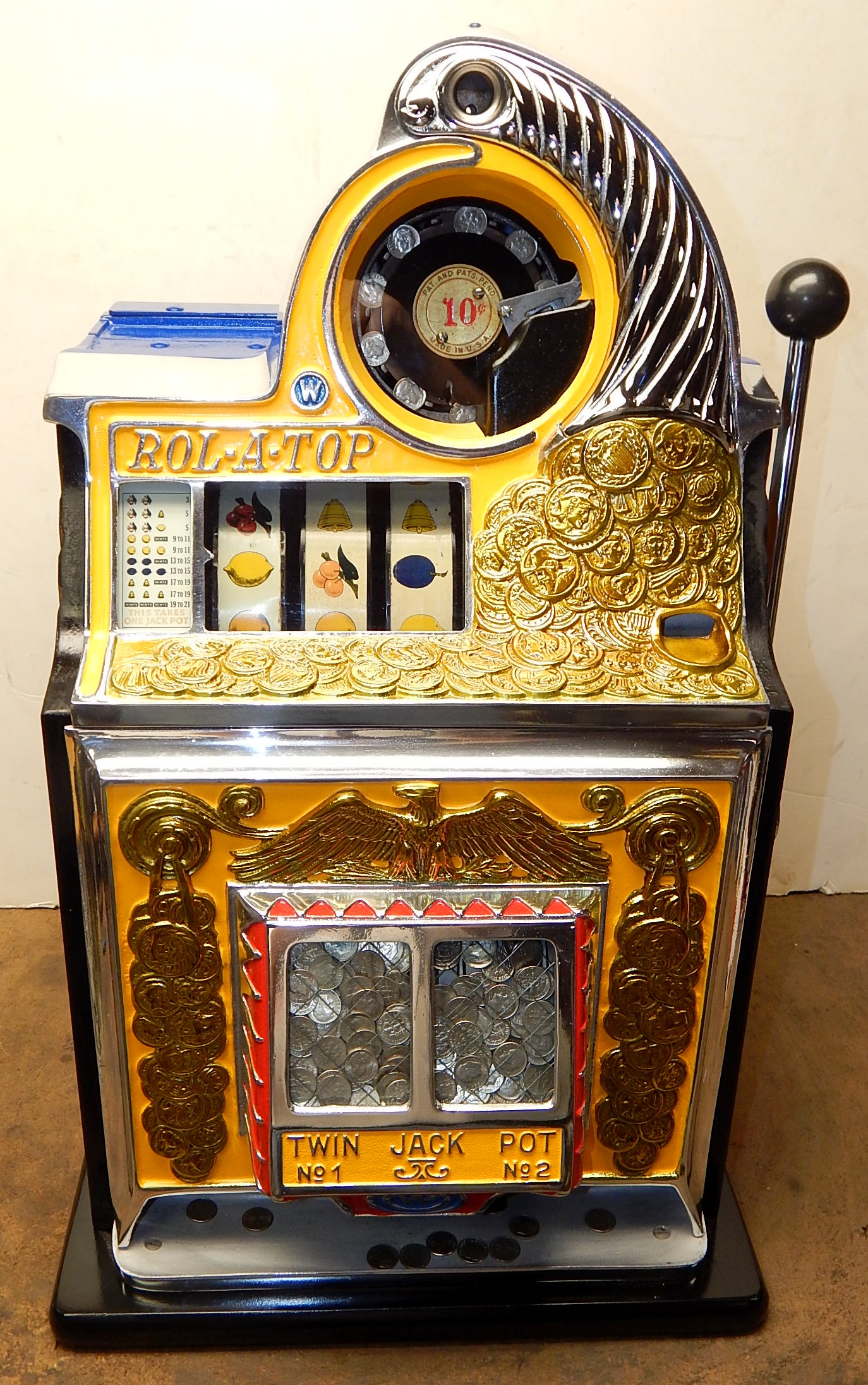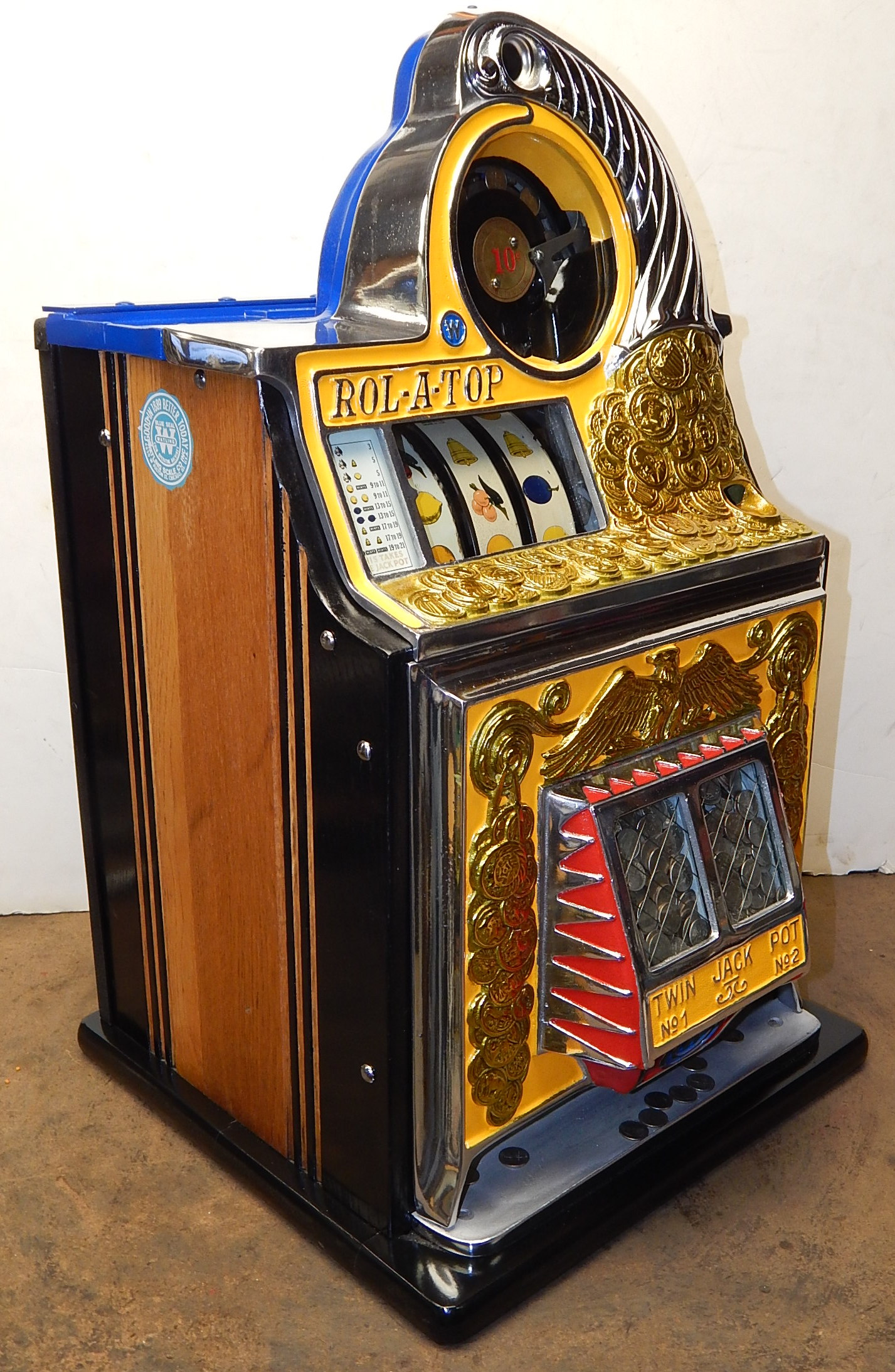1938 Watling Rolatop "Coin Front" 10 cent, restored back to it original colors, tinted gold coins, trim in yellow and red. Original "TIN" reel strips, original back door with the original Watling lock and key, solid oak cabinet, twin Jackpots, original cash box with lock and key.