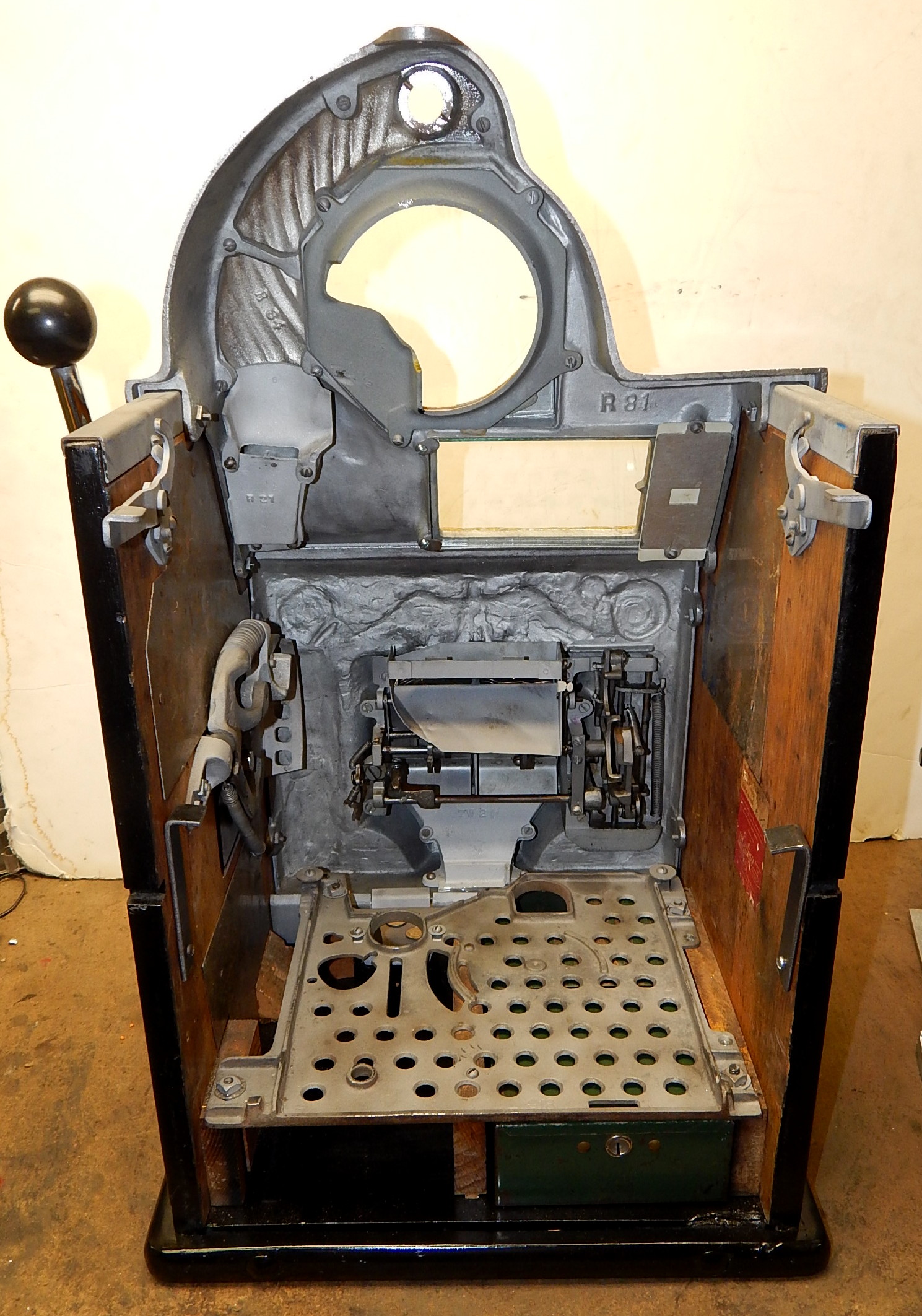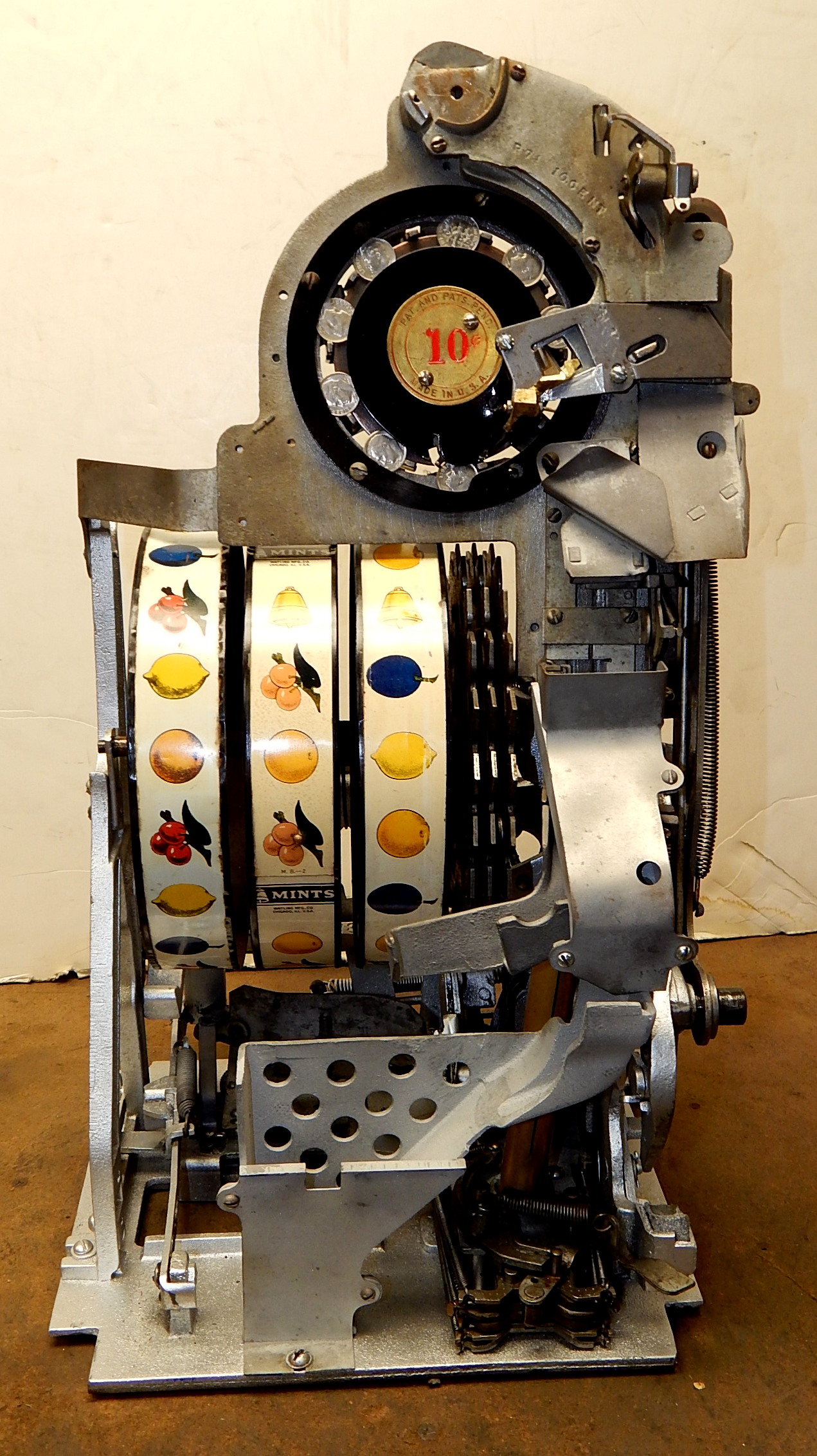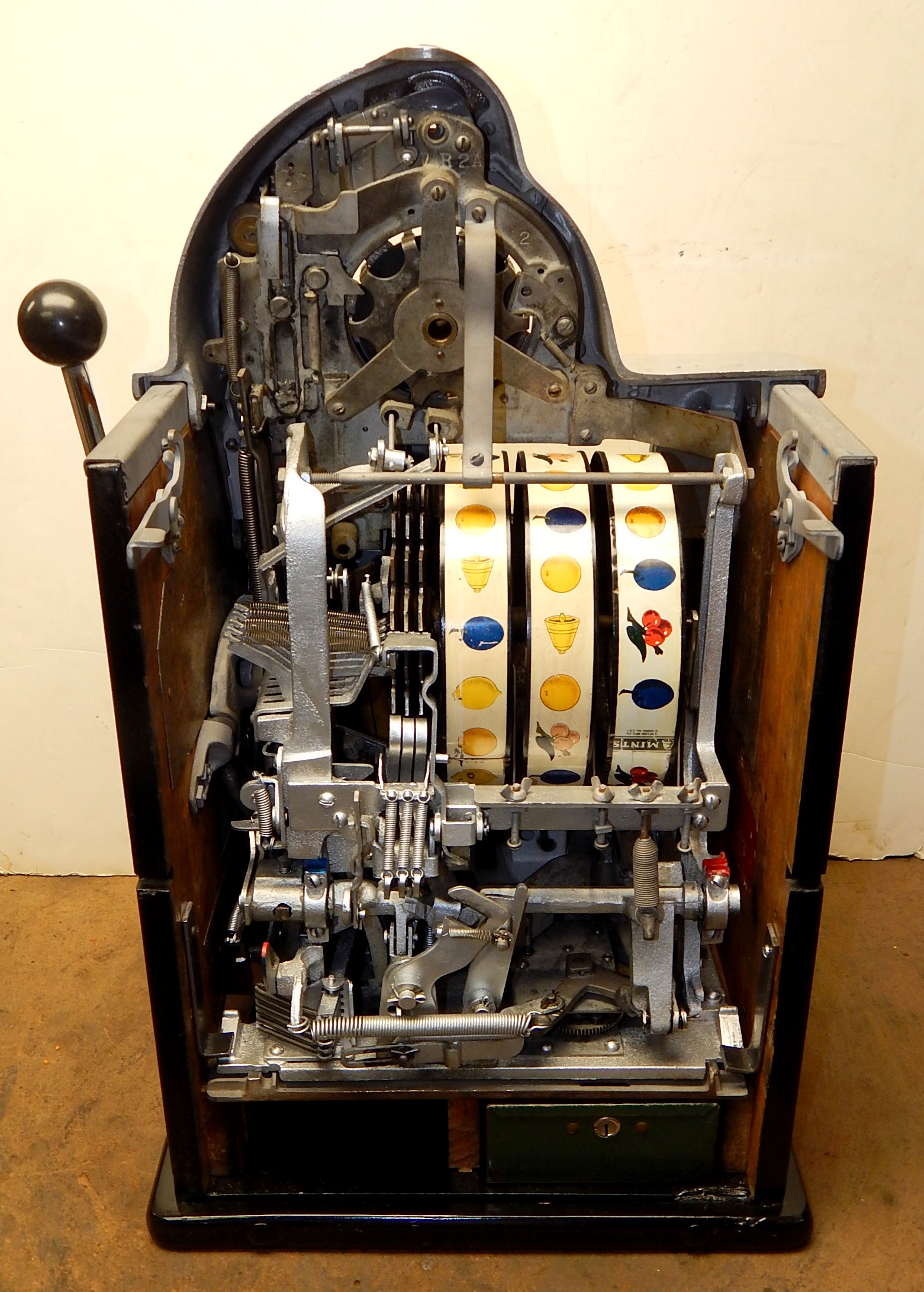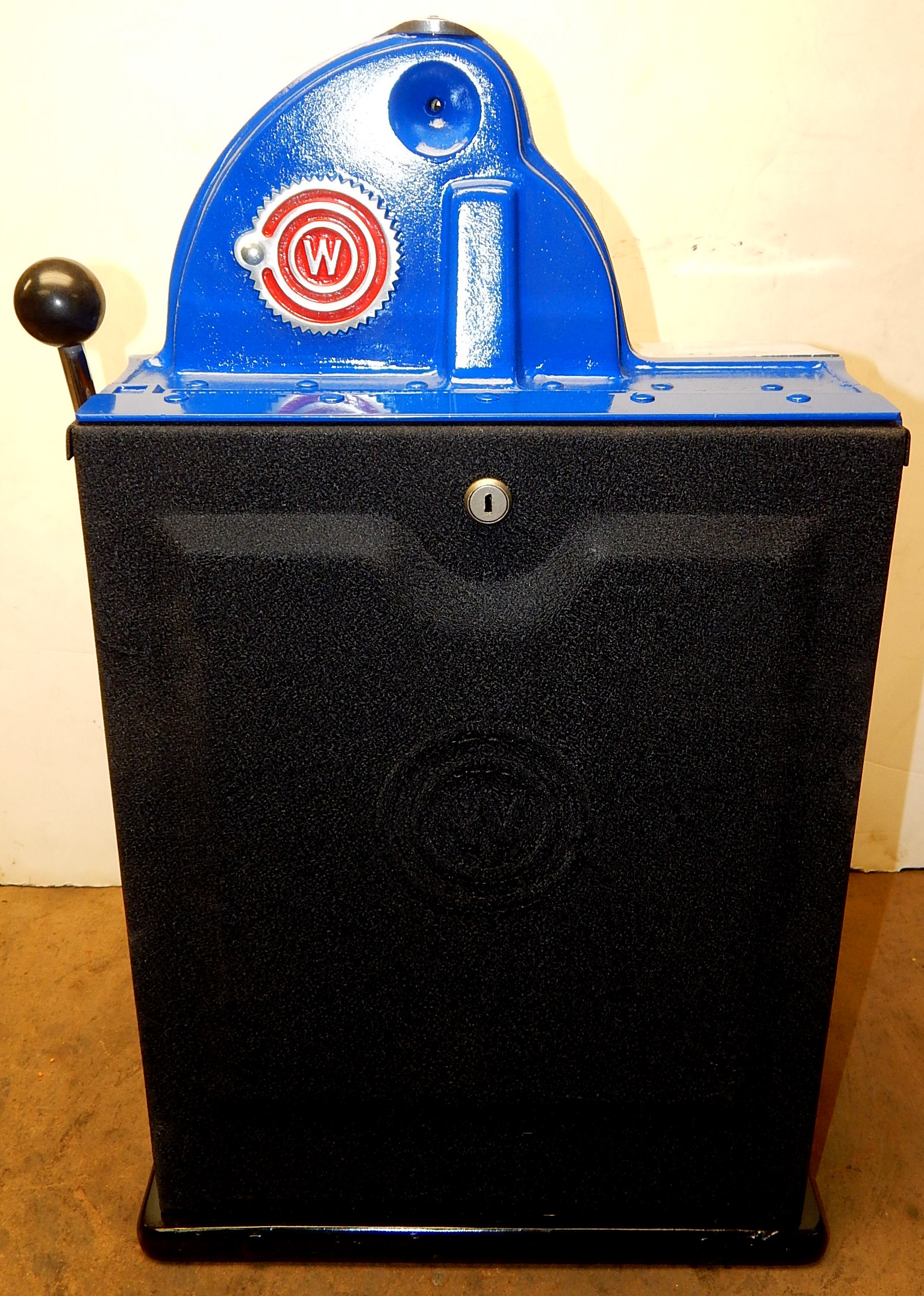1938 Watling Rolatop "Coin Front" 10 cent, restored back to it original colors, tinted gold coins, trim in yellow and red. Original "TIN" reel strips, original back door with the original Watling lock and key, solid oak cabinet, twin Jackpots, original cash box with lock and key.