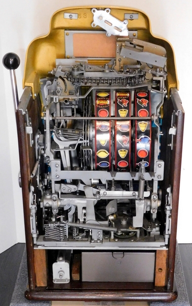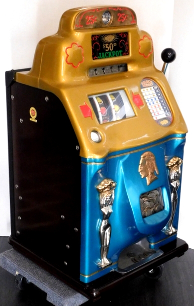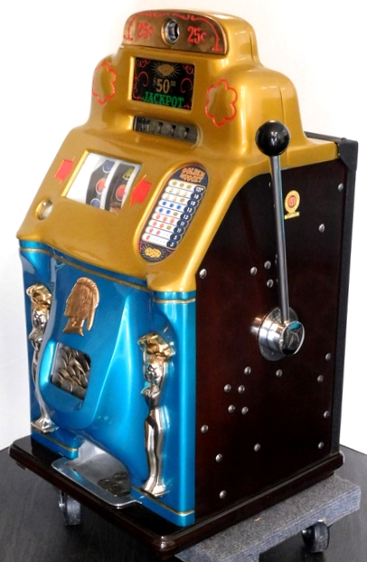 1946 Jennings Standard Chief "Golden Nugget" 25 cent, previously restored. Serial numbers match. Has full function self feed Jack-Pot. New Reel strips. New Award card and Marquee, original back door, new Cash box. We have no proof that this machine was operated in the Golden Nugget casino. If you are looking nice Standard Chief with the Golden Nugget kit on it, here it is. Plays very nice.