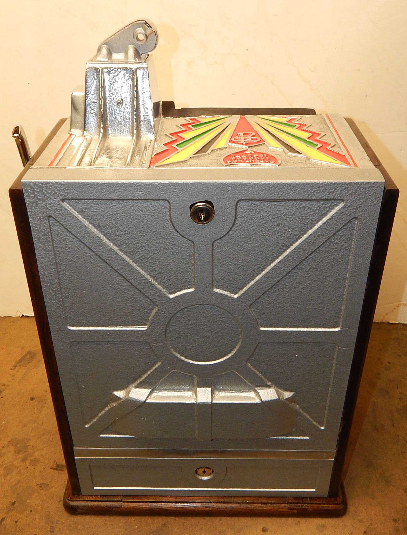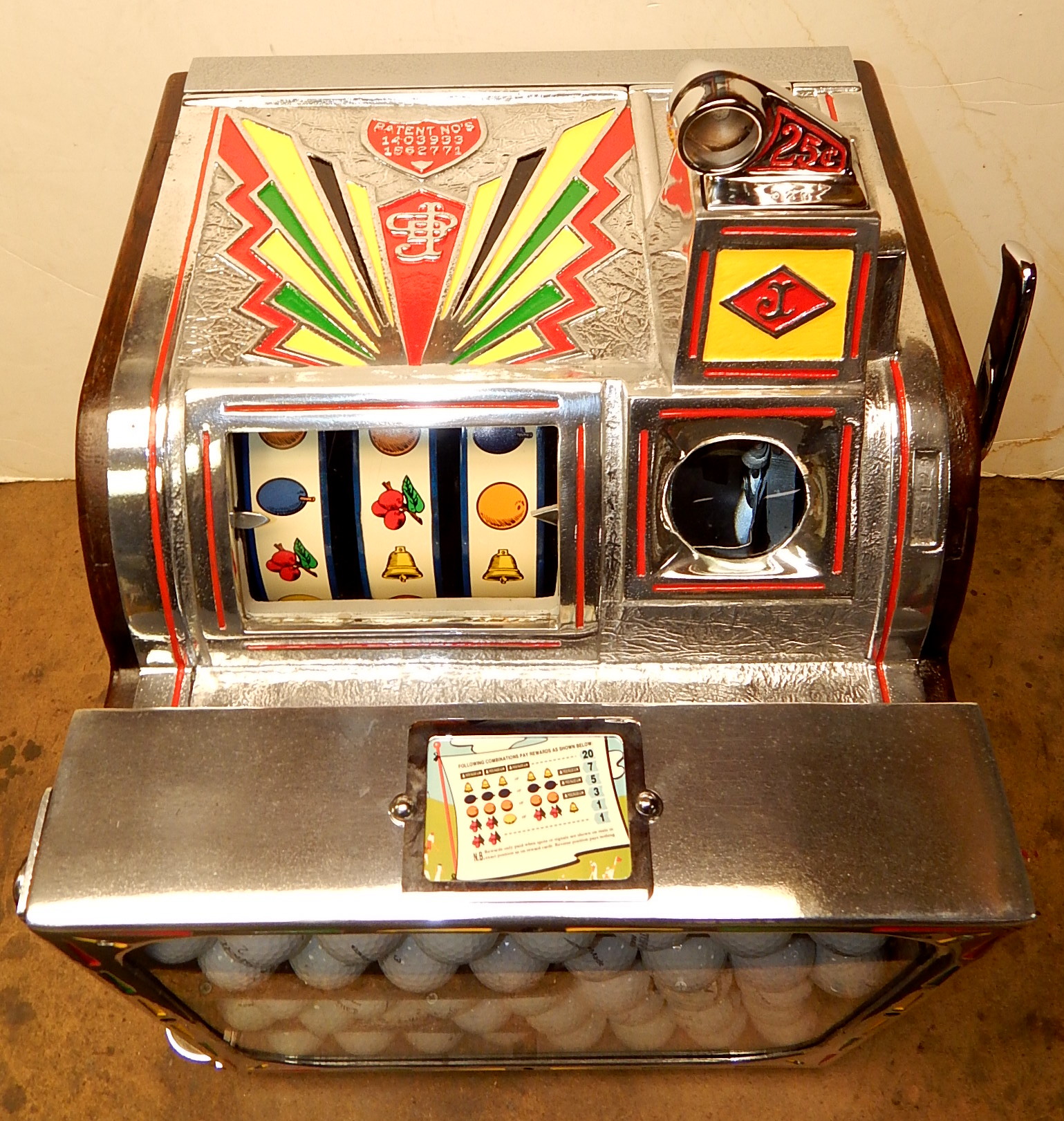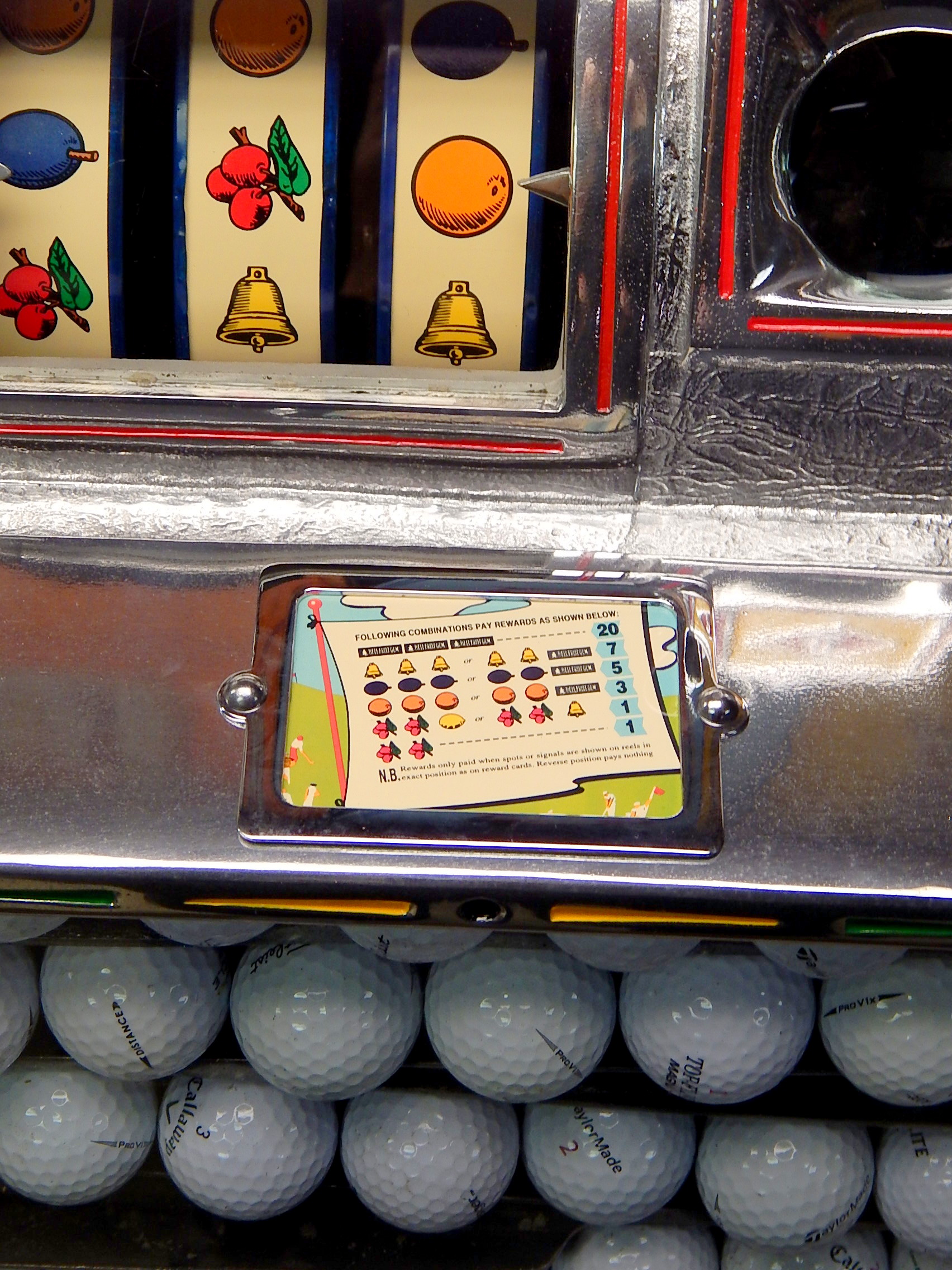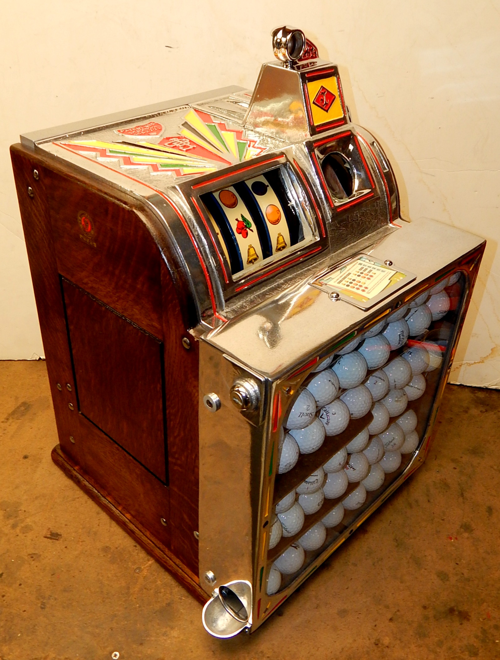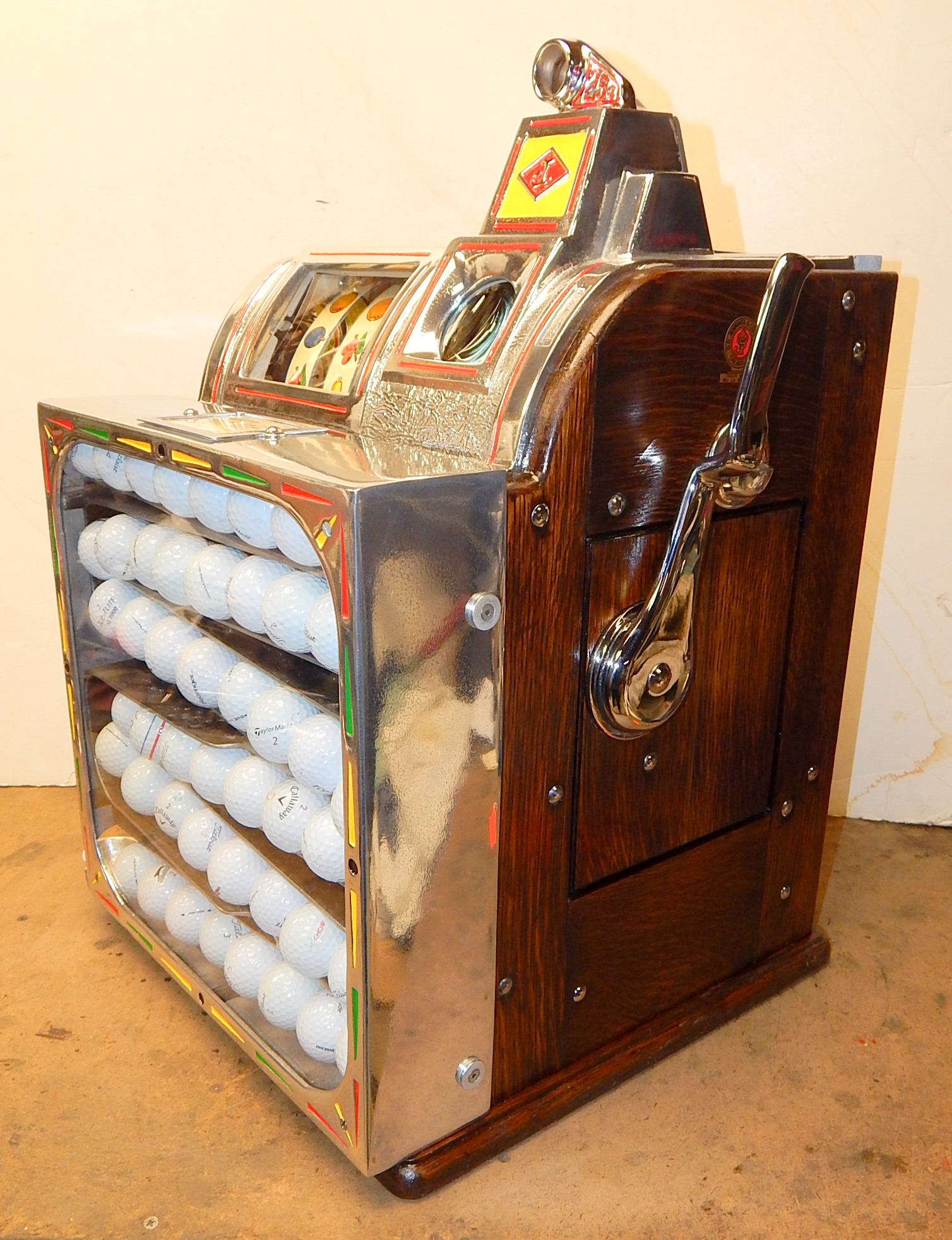 1935 Jennings Victoria "Golf Ball" vender 25 cent, restored back to the original condition and colors. Everything on this machine is original but, paint, reel strips and award card. Dispense Golf Balls only, no cash payout. A little on the "RARE" side.