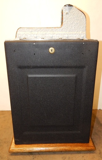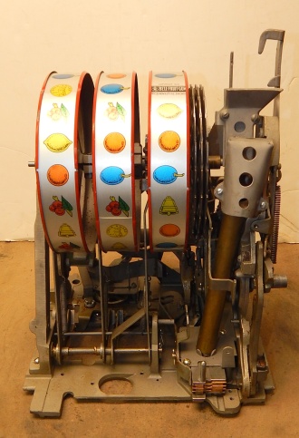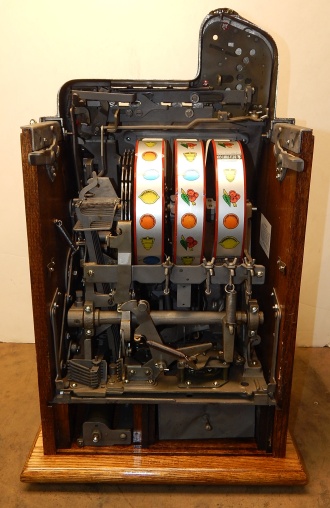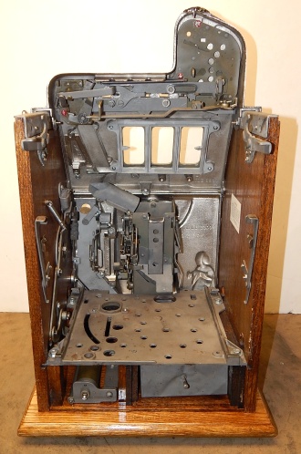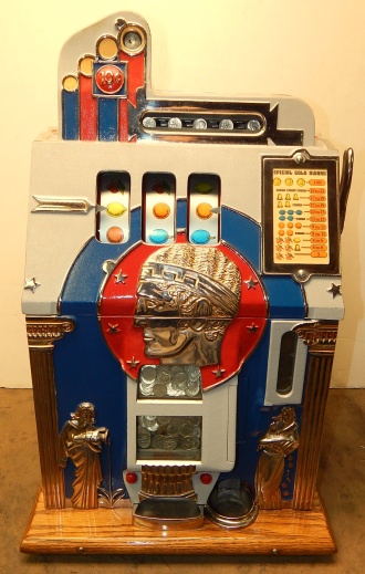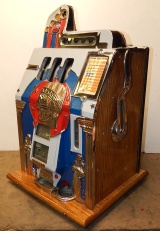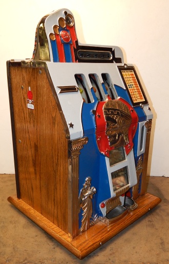 1933 Mills Roman Head with Gold award, 10 cent. previously restored, plated. Gary trimmed in blue and red. Gold Award with 4 gold ward tokens. Jackpot with reserve, new reel strips, original back door, Mills lock with one key, original cash box, new oak cabinet. Plays very easy, 3-5 pay out