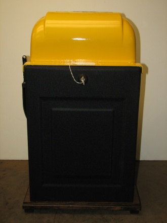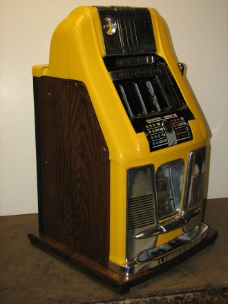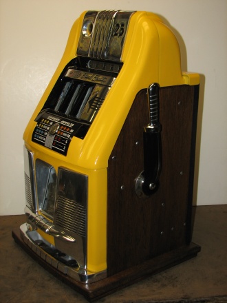 Mills 1950 Hi-Top 25 cent, This is a very nice machine restored back to the original colors Yellow with Black. Mint condition original award card, Jackpot with front load lock and key, original back door with Mills  lock with one key, original cash box. The base of the cabinet has been replaced with a very nice oak base with oak runners.