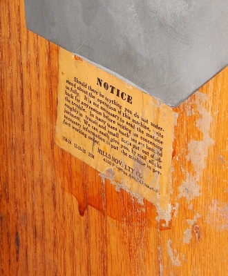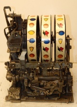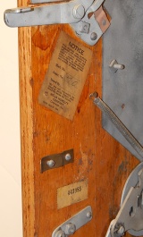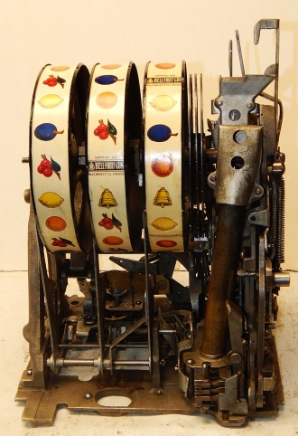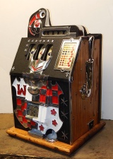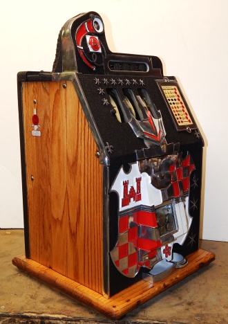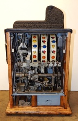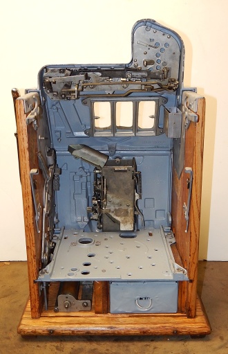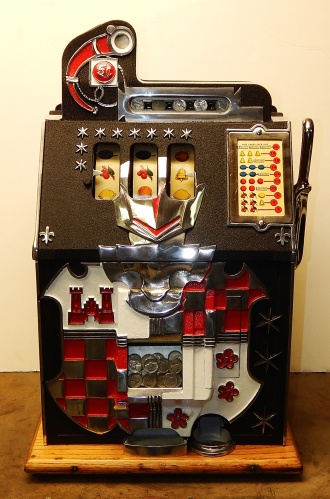 1934 Mills Castle Front 5 cent. Another very nice all original machine. Restored back to it's original colors, wrinkle black trimed in red and white. Jackpot with reserve, original reel strips, original back door, original cash box. Mint original oak cabinet. Still has the original paper work on the inside of the cabinet. This is the way you want to find them. Plays very easy, 3-5 payout.