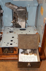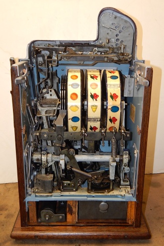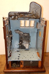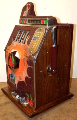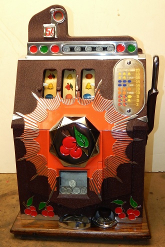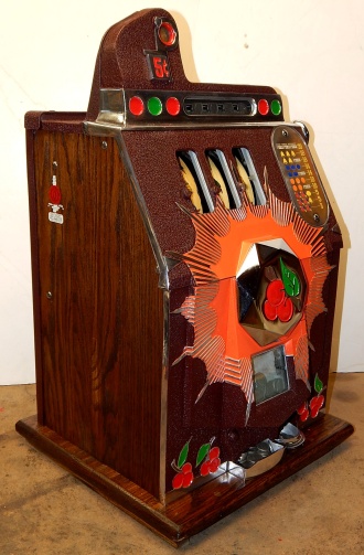Mills 1938 Bursting Cherry, 5 cent . This is a very nice machine restored, Blrown wrinkle, with red and green trim colors. Mint condition award card, Jack pot with reserve, original cash box. Plays very easy, pays as it should. 3-5 payout.