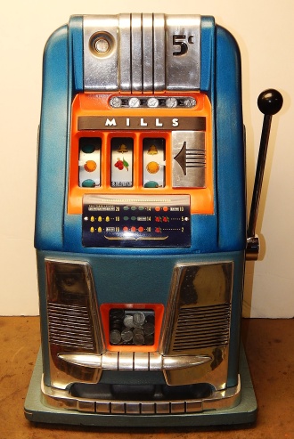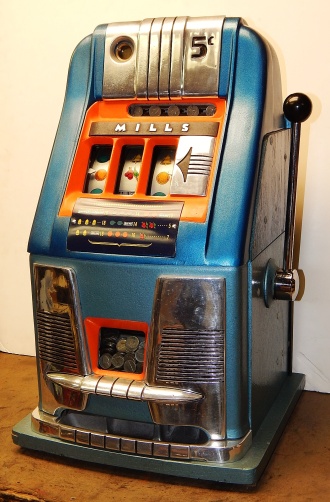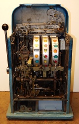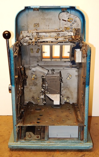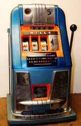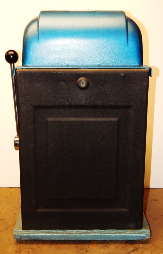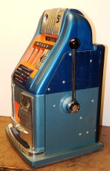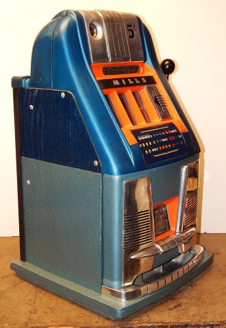 Mills 1950 Hi-Top 5 cent, This is a very nice previously restored machine done by us over twenty years ago. Painted back to the oringinal colors gloss Blue trimmed in Orange. This machine still looks great other then some very small coin nick's in the orange paint just under the reel windows. Oak cabinet painted Dark blue and light blue, mint condition award card, Jackpot with reserve, original back door with an original Mills lock with one key. 2-5 pay out.