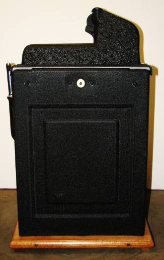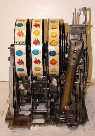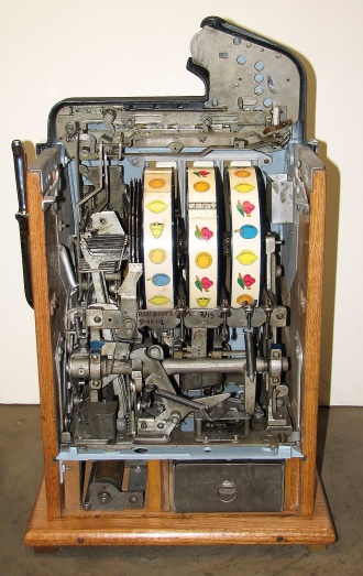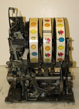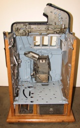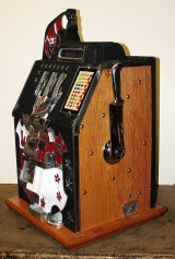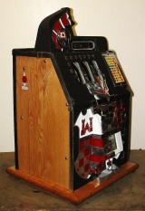 1934 Mills Castle Front 50 cent. Another very nice all original large coin machine. Restored back to it's original colors, wrinkle black trimed in red and white. Jackpot with reserve, original reel strips, original back door, original Mills lock with one key, original cash box. Mint original oak cabinet. Plays very easy, 3-5 payout.