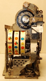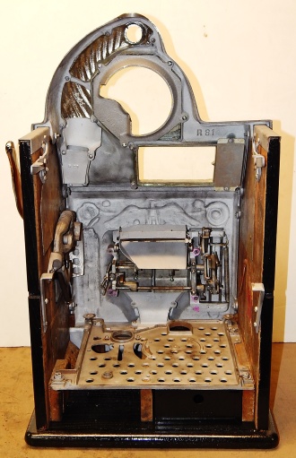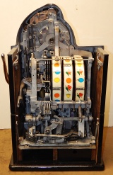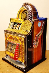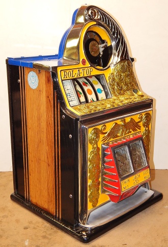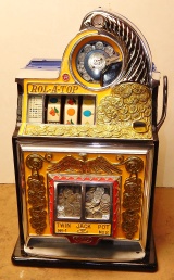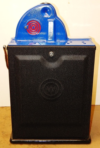 1938 Watling Rolatop "Coin Front" 25 cent, restored back to it original colors, tinted gold coins trim in Yellow and red. New reel strips, original back door with the original watling lock and key, solid oak cabinet twin Jackpots, cash box, 3-5 pay out.
