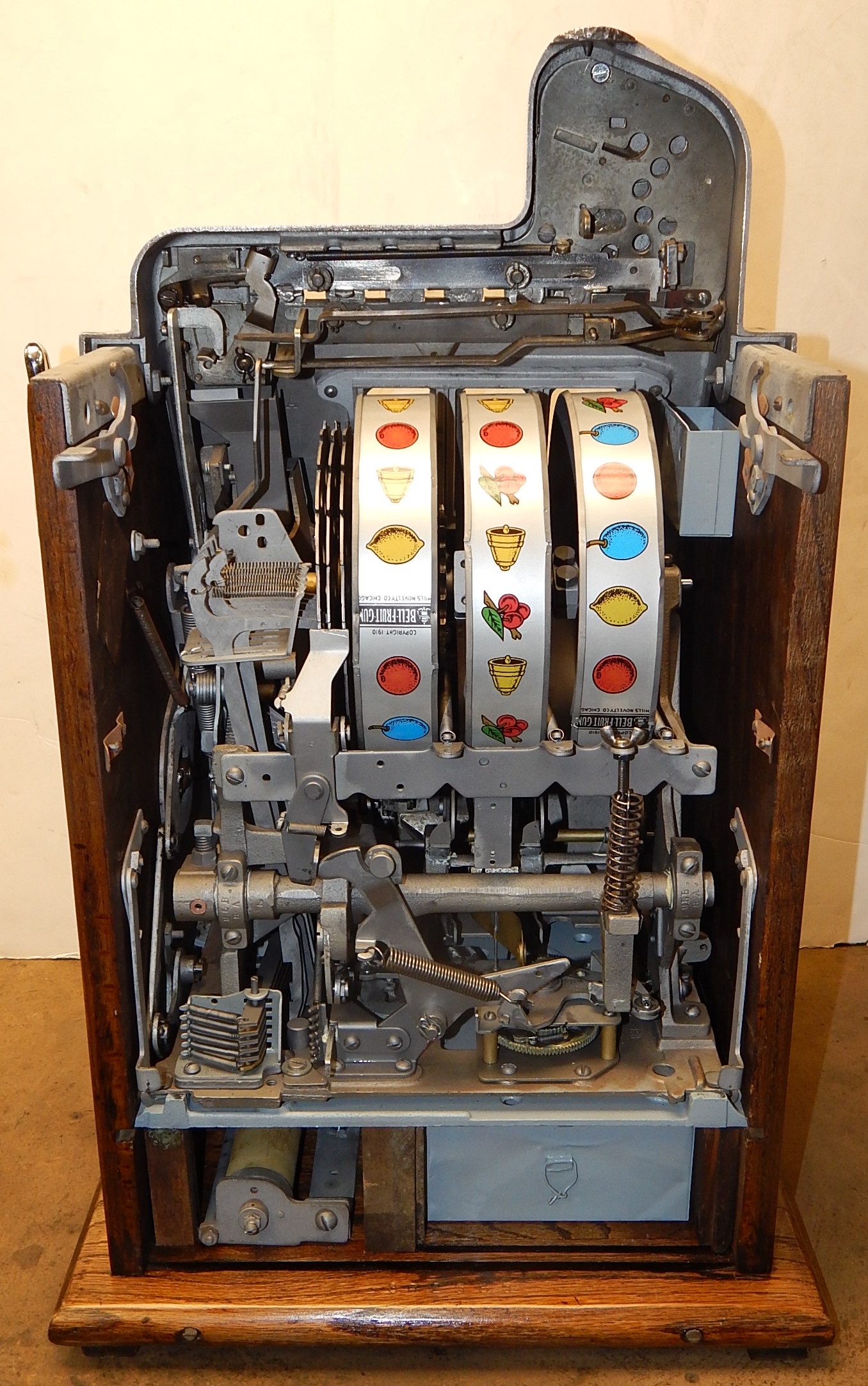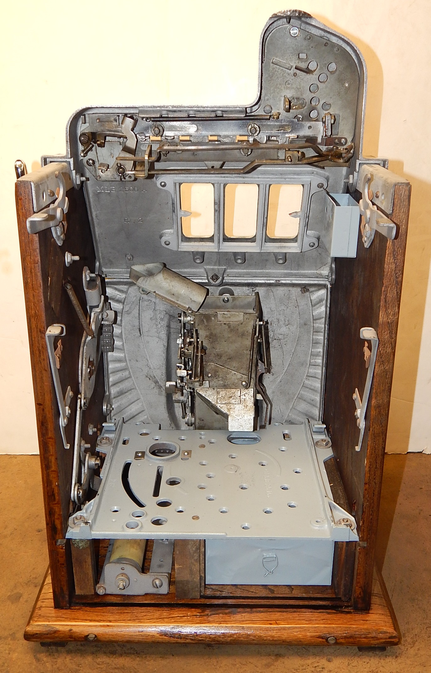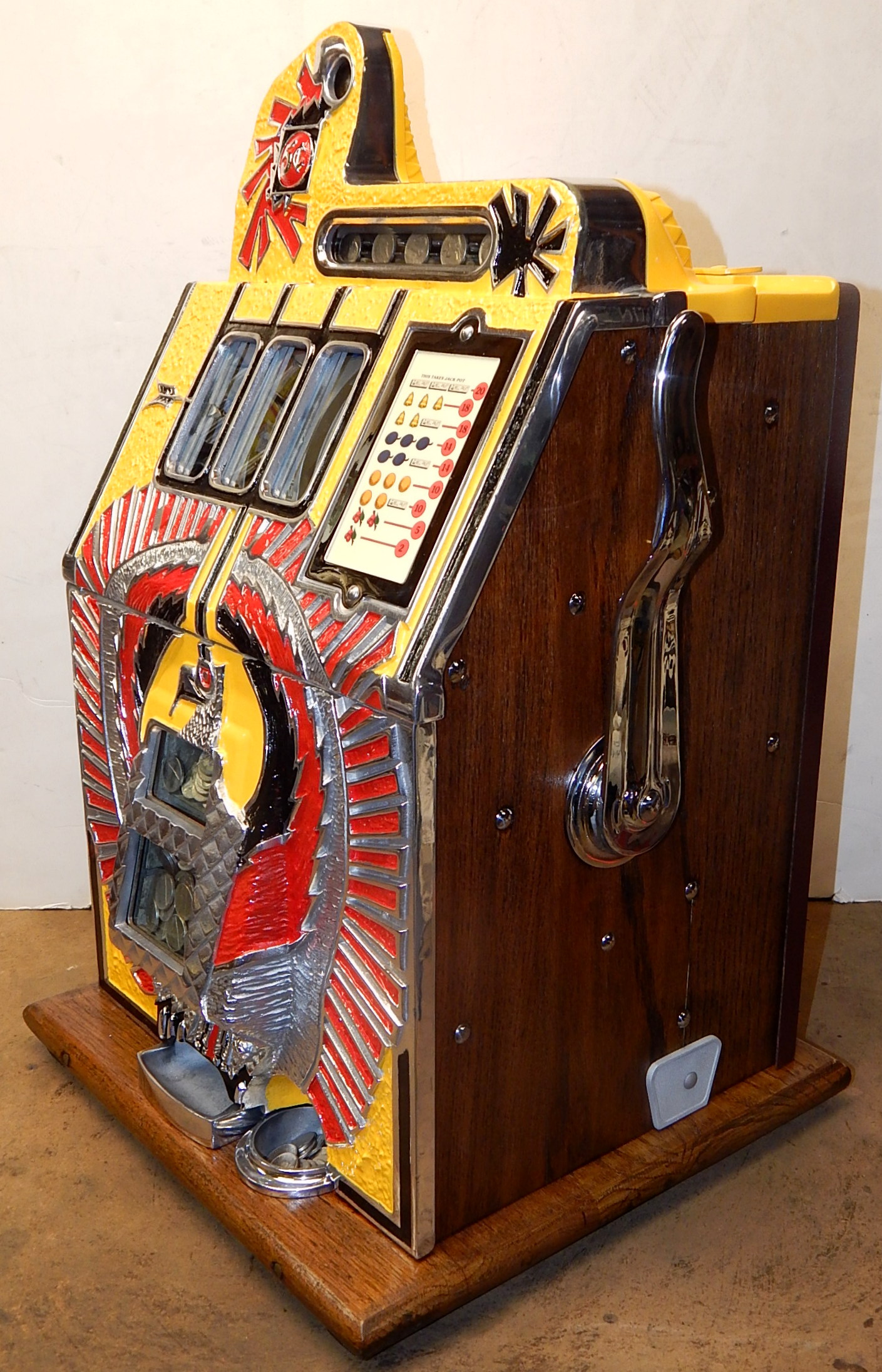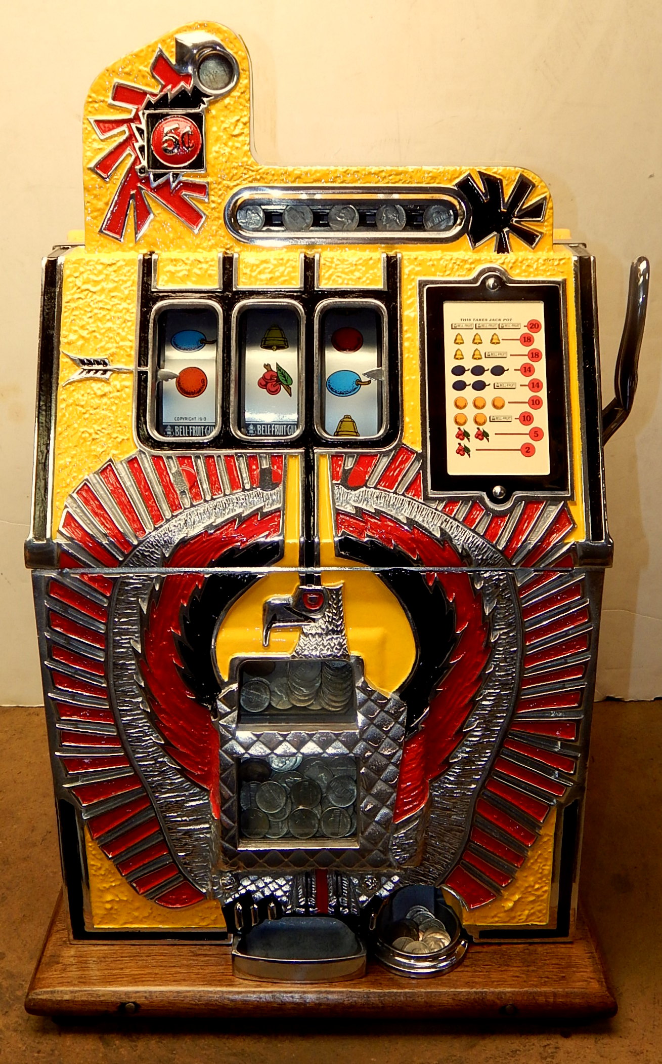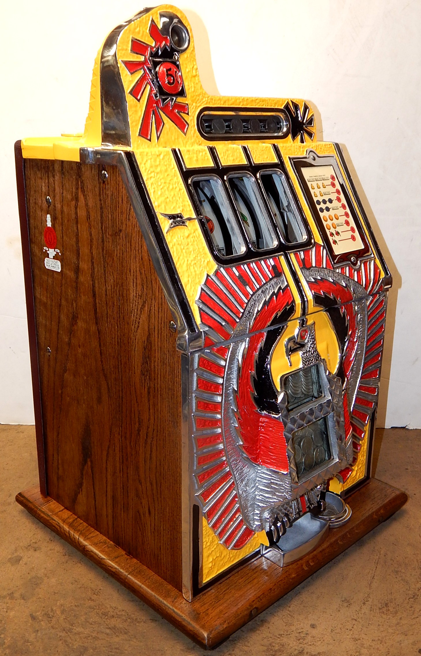 1935 Mills War Eagle 5 cent, restored back to the original colors. original oak cabinet, Jackpot, original back door with Mills Lock, new reel strips, original cash box, new award card. Plays and pays as it should.