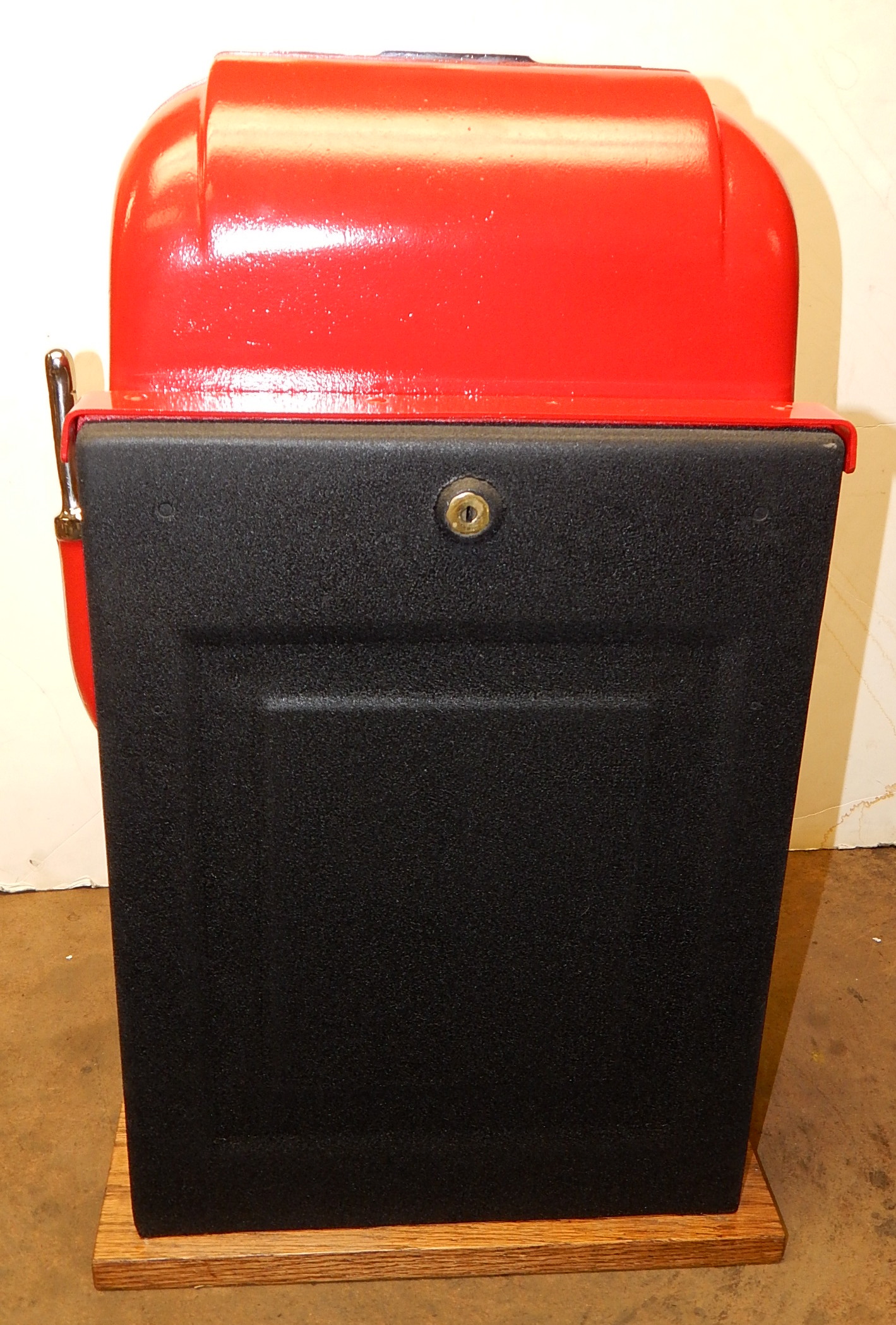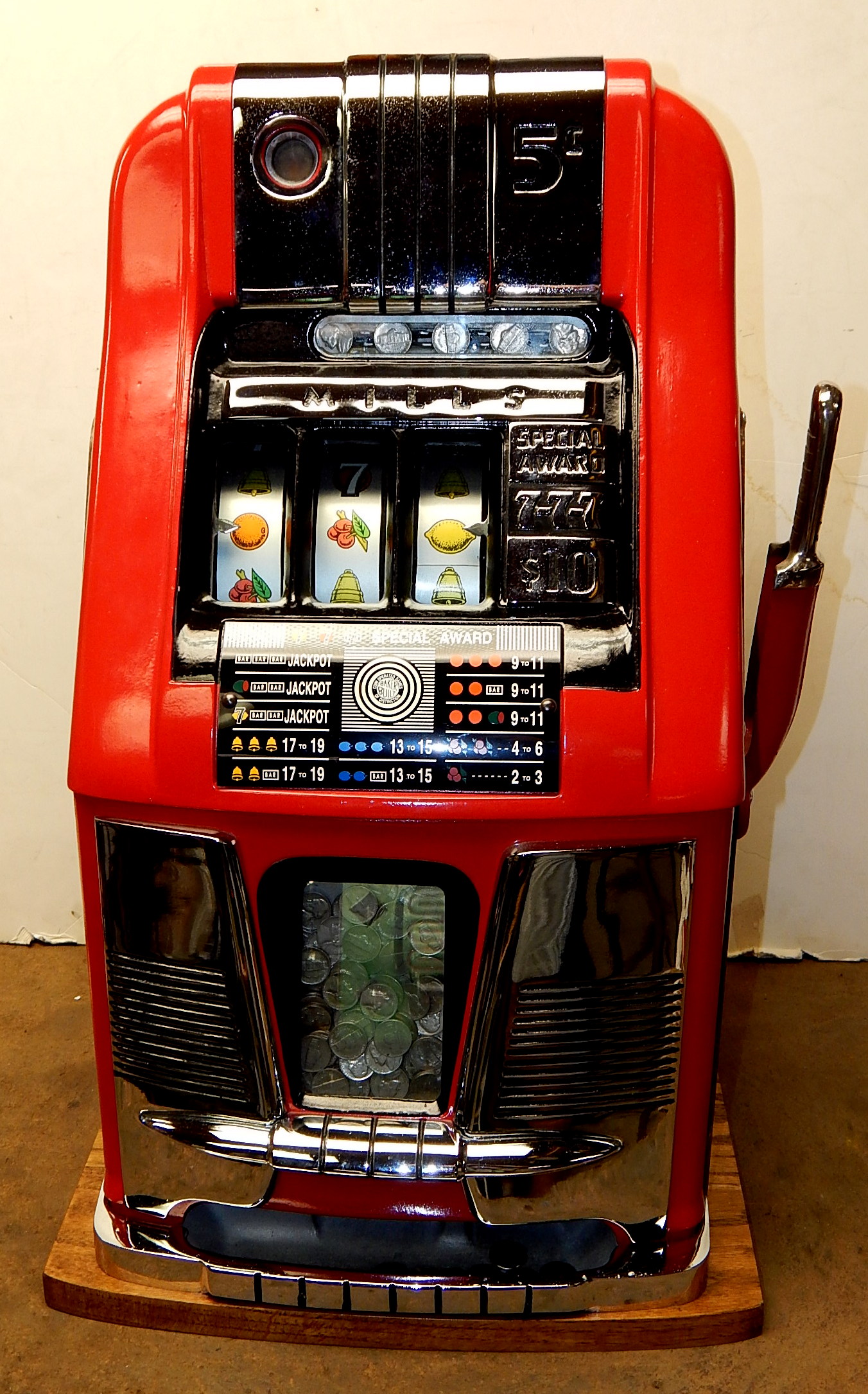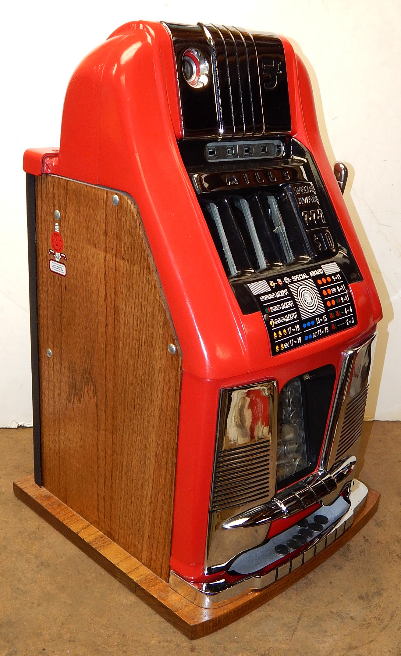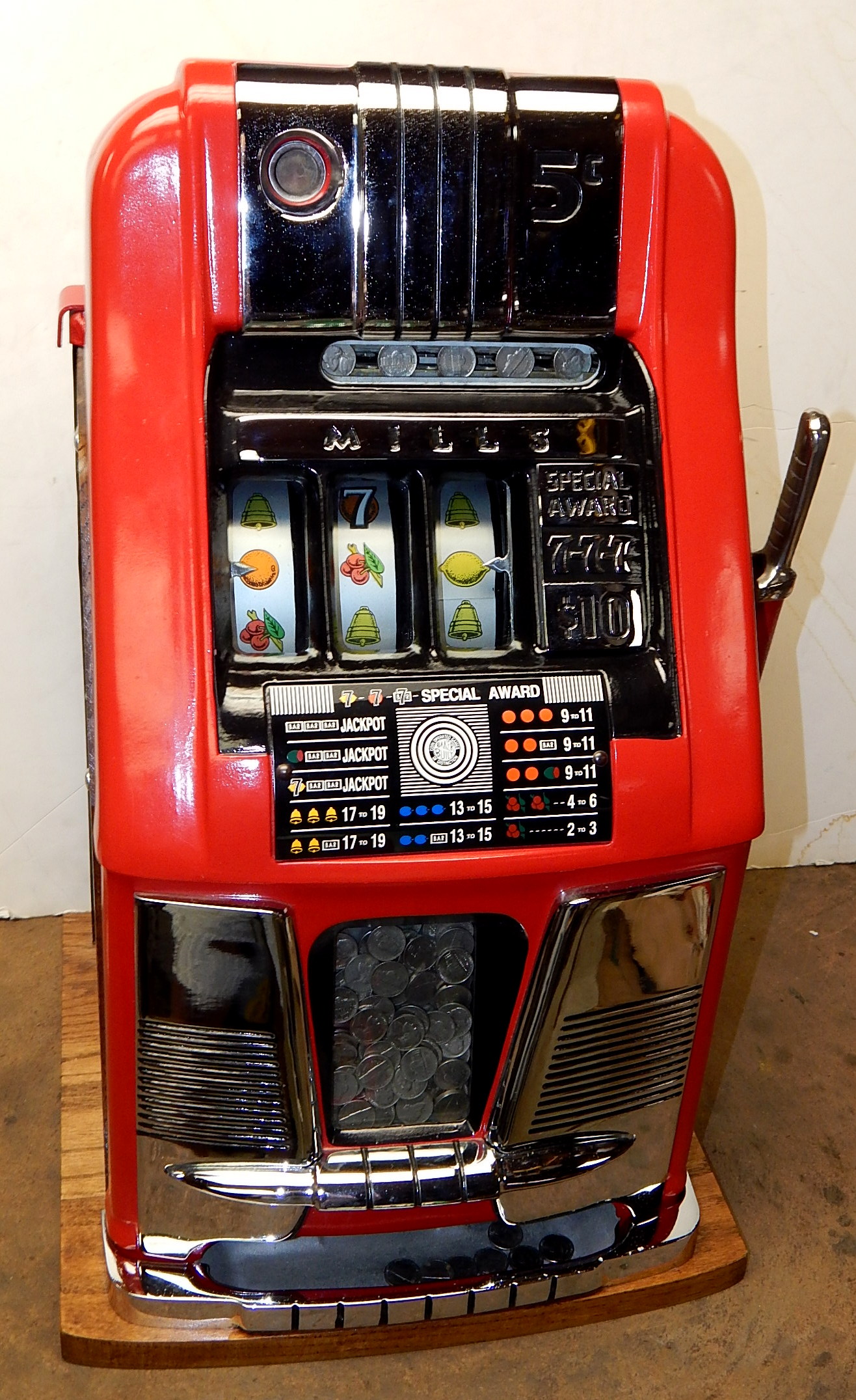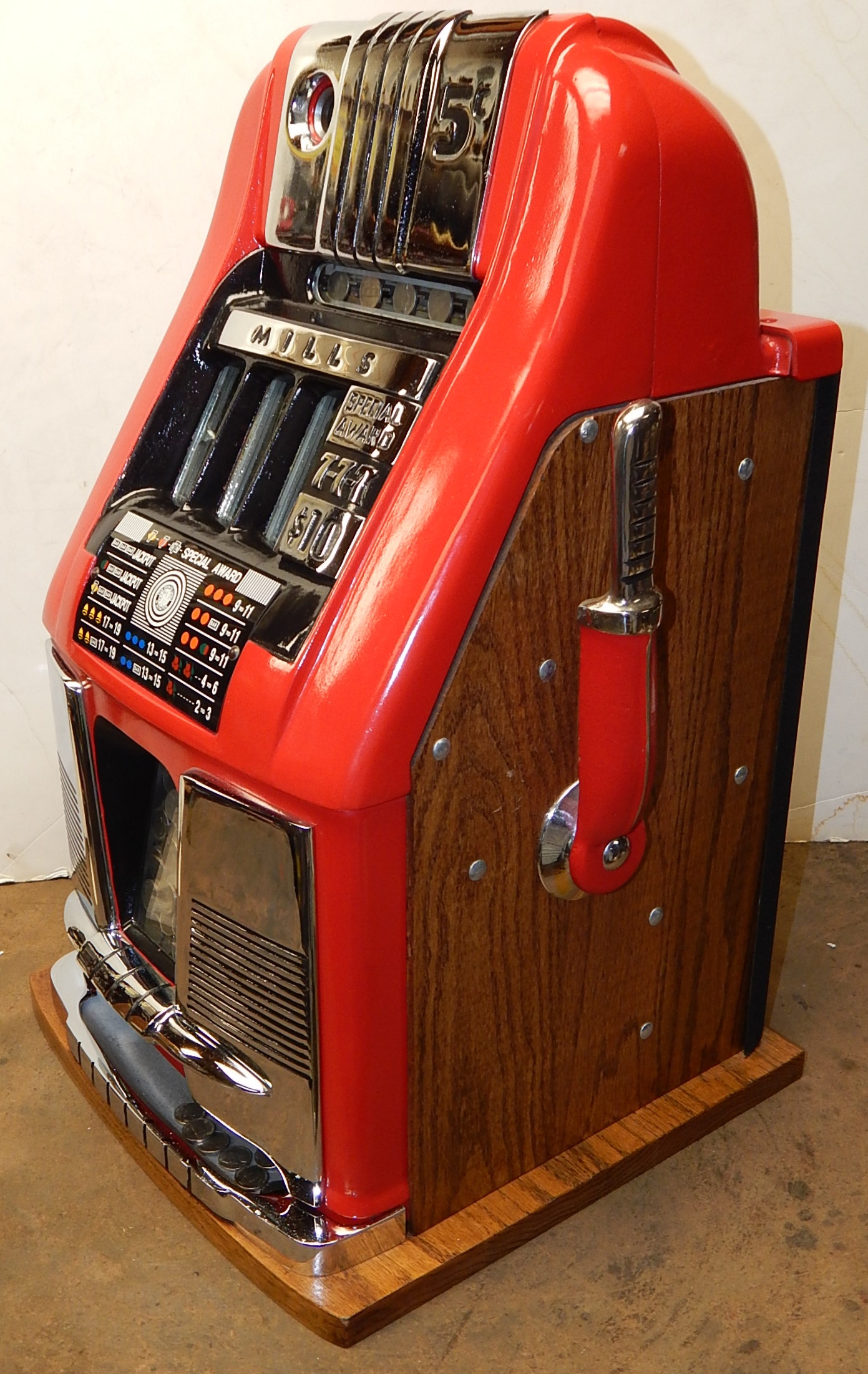 Mills 1948 " 7-7-7 " Hi-Top 5 cent, This is a very nice restored machine, Gloss Red trimmed in black. All the trim on this machine has been chrome plated to add a little flash to the gloss red color.  Mint condition award card, new reel strips, NO JACKPOT, original back door with Mills lock with one key, original cash box. New oak cabinet. Plays very easy.