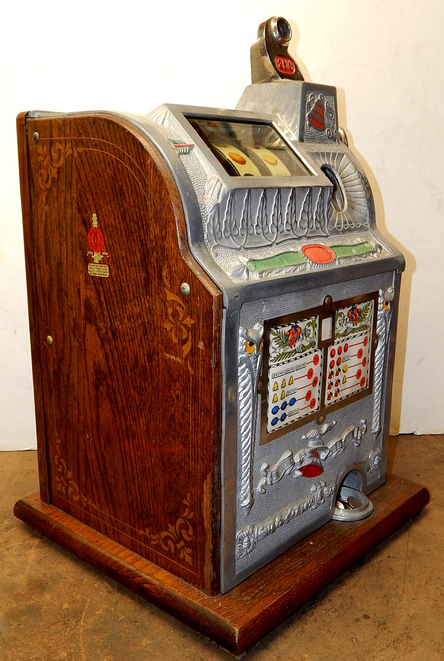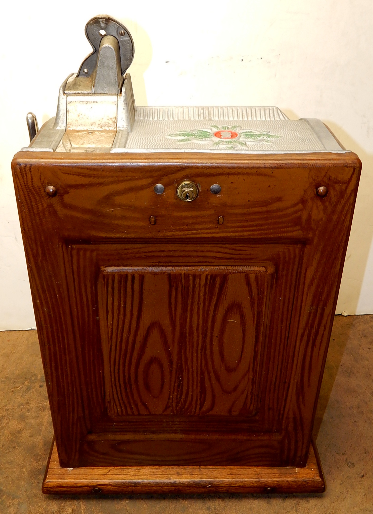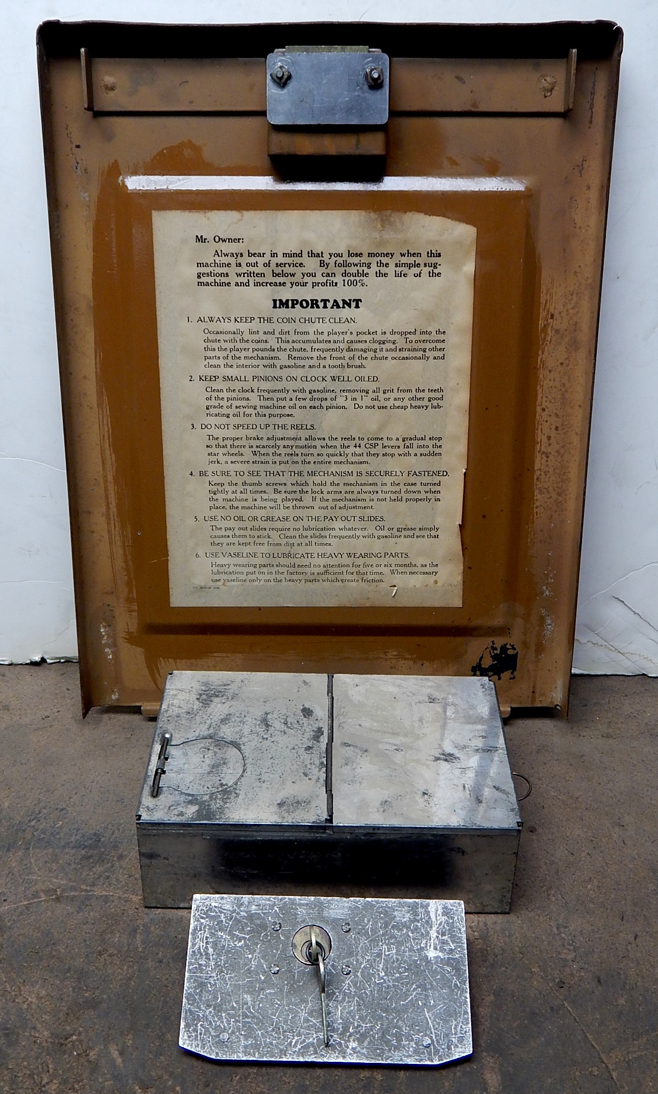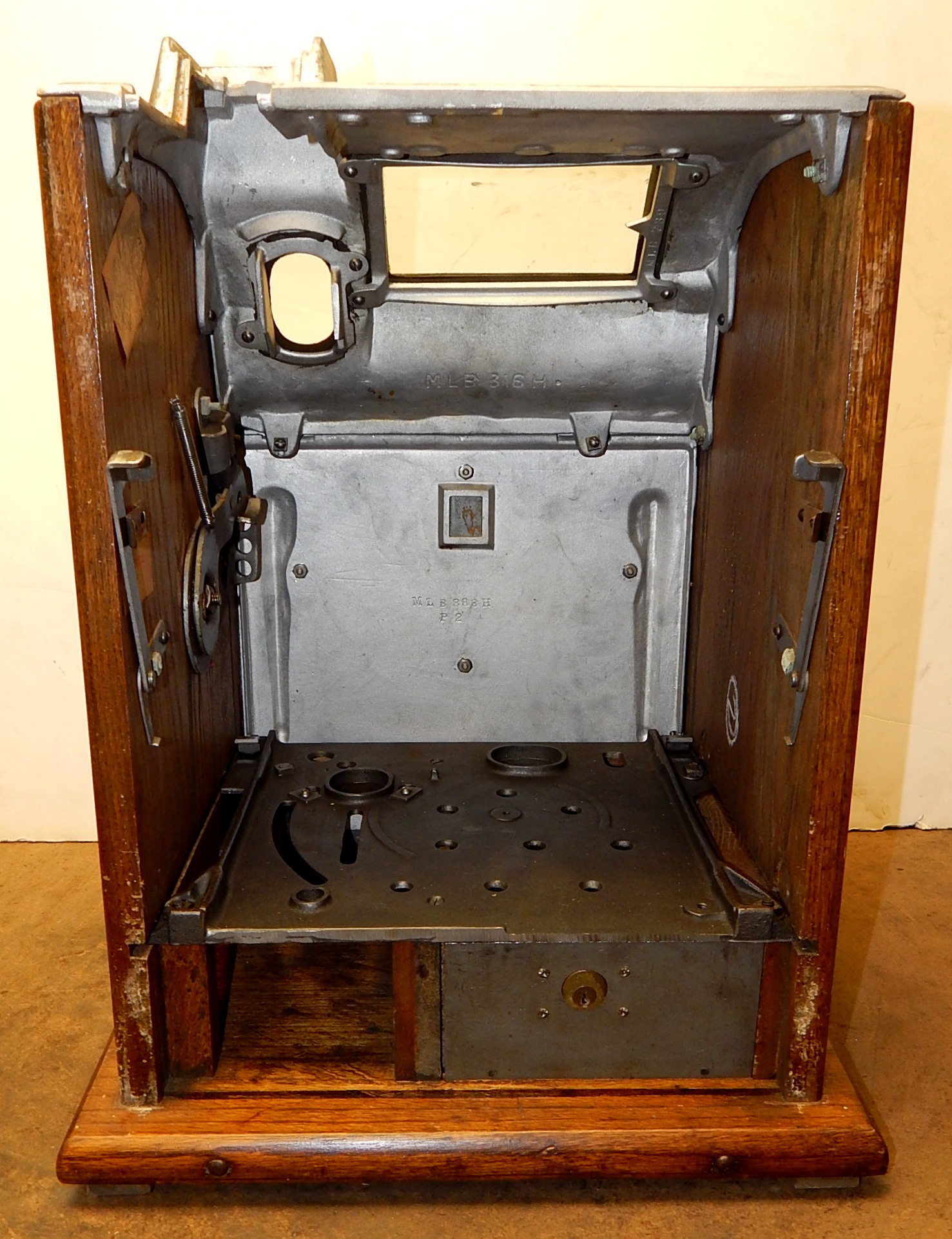 1929 Mills Operator Bell 25 cent, in totally original condition, nothing has been changed on this machine from when it left the factory 93 years ago. I was surprised when I open the back door of this machine to see the condition of the mechanism, cleam enough to eat off of. In my 40 years of business I have never seen one this clean in this condition and not be in the original shipping box. The only thing we did on the machine is lube, and wiped down the out side casting. Plating on handle and coin head are in original condition. Beautiful oak cabinet with gold leaf and Mills decal. Mint condition Original tin reel strips, original award card, back door with wood grain paint. Oirginal Mills back door lock and key with matching number, original cash box with flap door, cashbox door. Mills inspection sticker and serial number are still on the inside. Plays very easy for a goose neck machine. In my opinion, this machine did not see much service. If your are looking for a machine that has not been molested in anyway and a quarter to boot this one is for you.