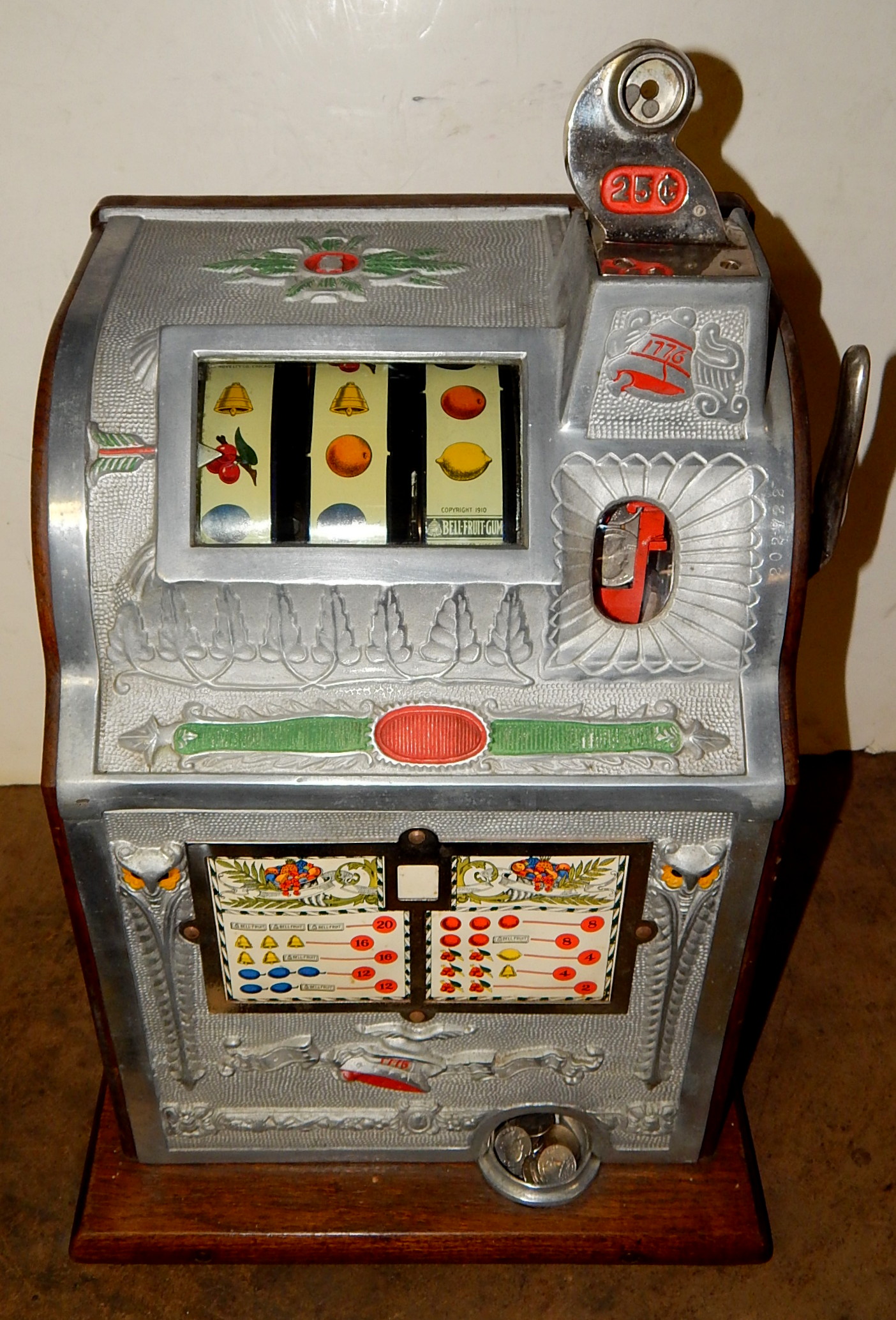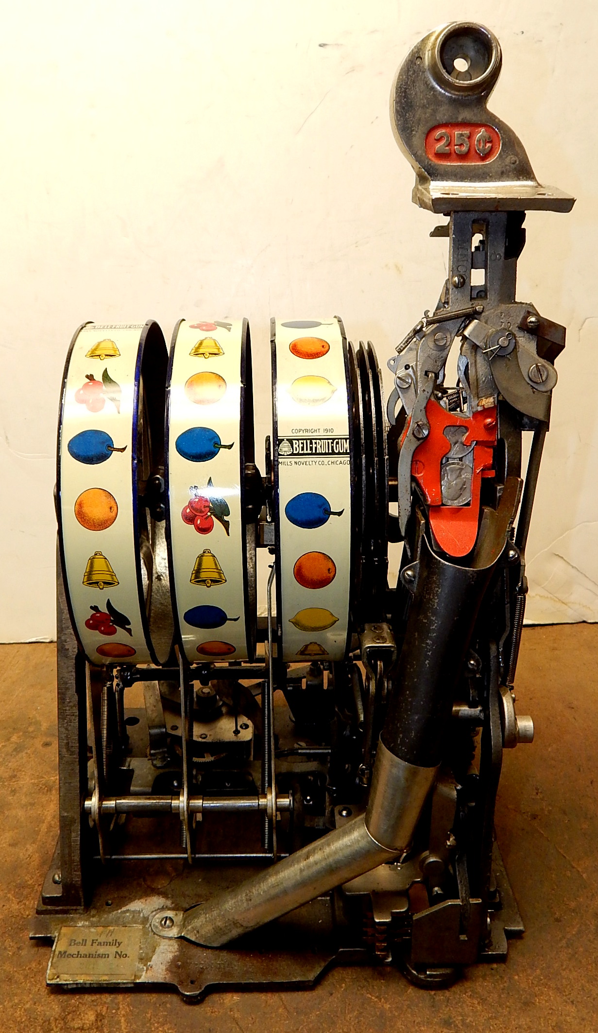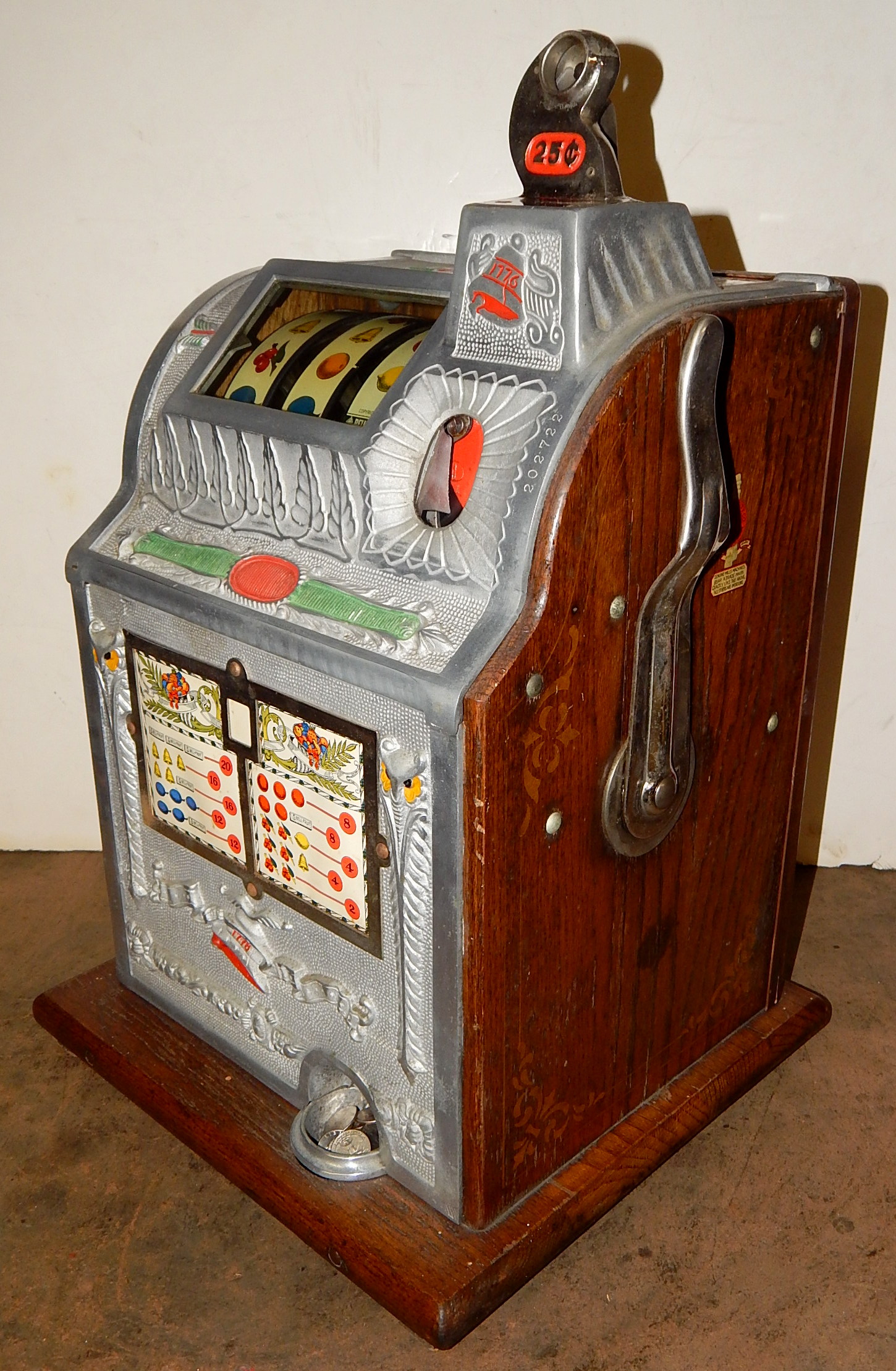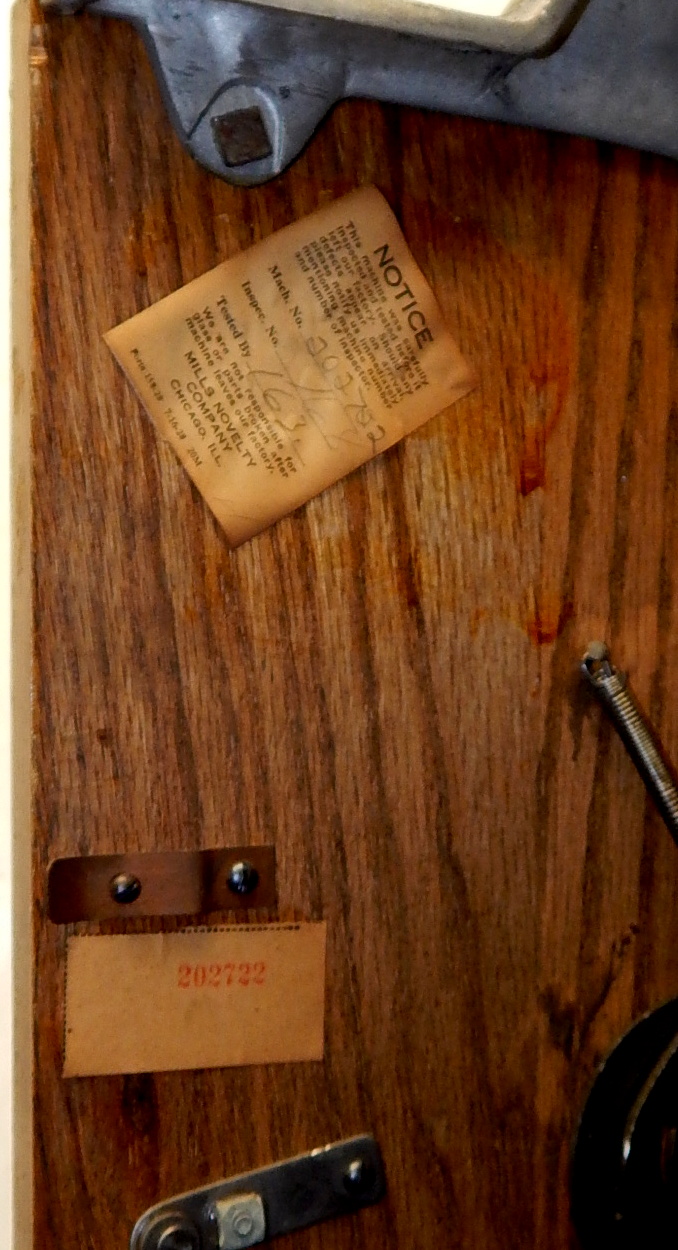 1929 Mills Operator Bell 25 cent, in totally original condition, nothing has been changed on this machine from when it left the factory 93 years ago. I was surprised when I open the back door of this machine to see the condition of the mechanism, cleam enough to eat off of. In my 40 years of business I have never seen one this clean in this condition and not be in the original shipping box. The only thing we did on the machine is lube, and wiped down the out side casting. Plating on handle and coin head are in original condition. Beautiful oak cabinet with gold leaf and Mills decal. Mint condition Original tin reel strips, original award card, back door with wood grain paint. Oirginal Mills back door lock and key with matching number, original cash box with flap door, cashbox door. Mills inspection sticker and serial number are still on the inside. Plays very easy for a goose neck machine. In my opinion, this machine did not see much service. If your are looking for a machine that has not been molested in anyway and a quarter to boot this one is for you.