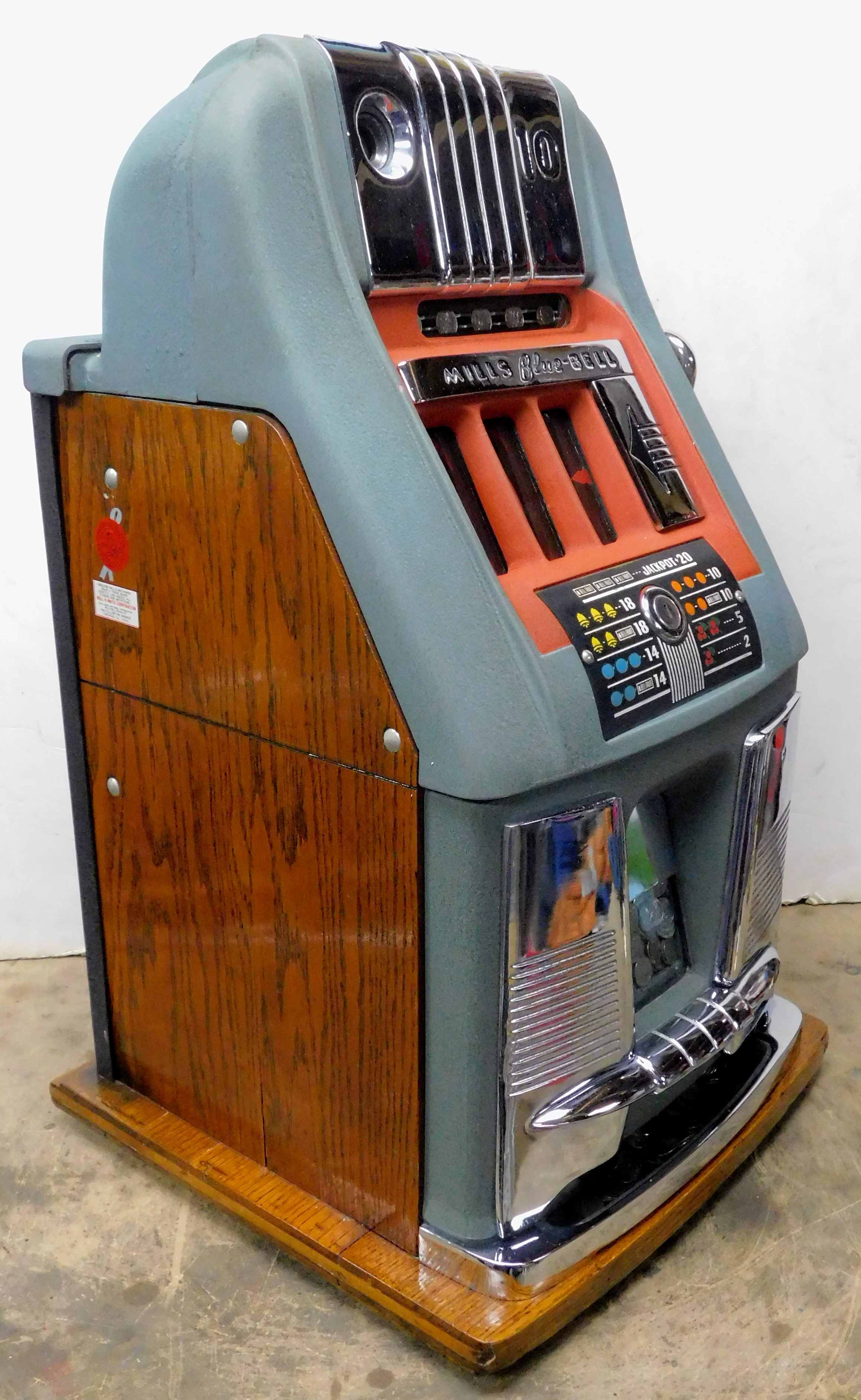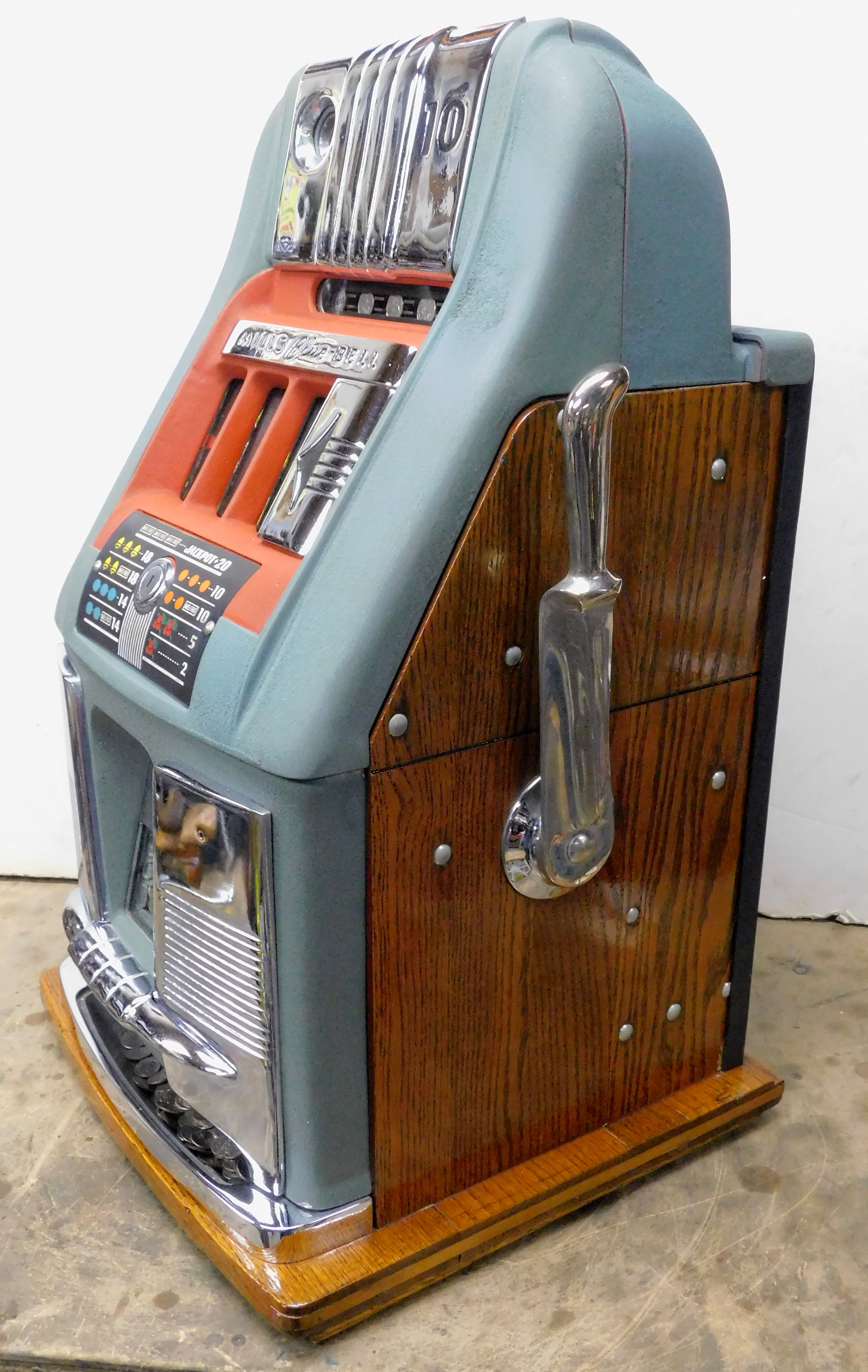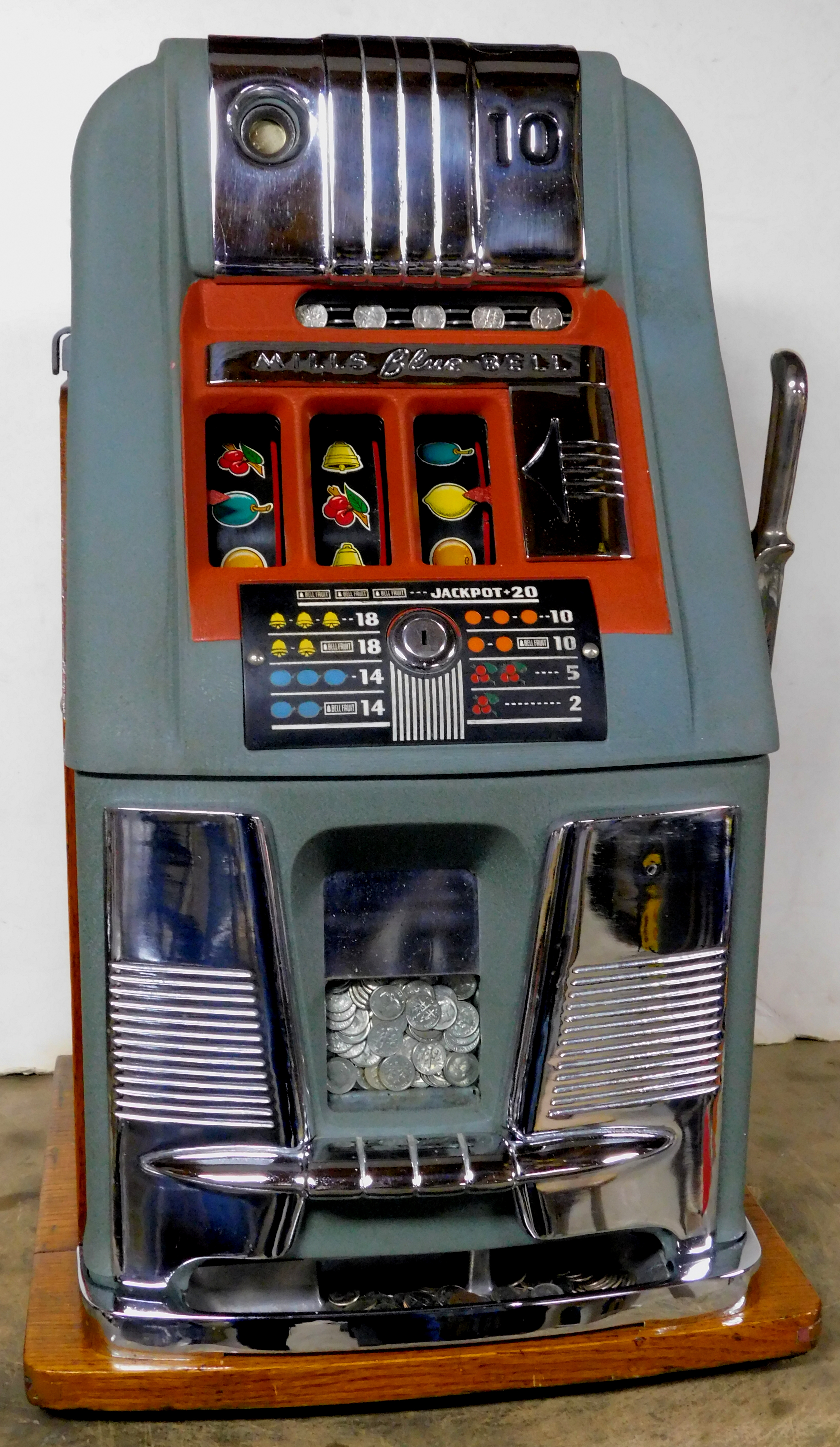 Mills 1948 Blue Bell Hi-Top 10 cent, previously restored wrinkle green and red, all trim on this machine was chrome plated. original award card, original reel strips, Hand load Jackpot, original back door with lock with one key, new cash box. Still has the original Jackpot counter. Plays very easy, 2-5 pay out.
