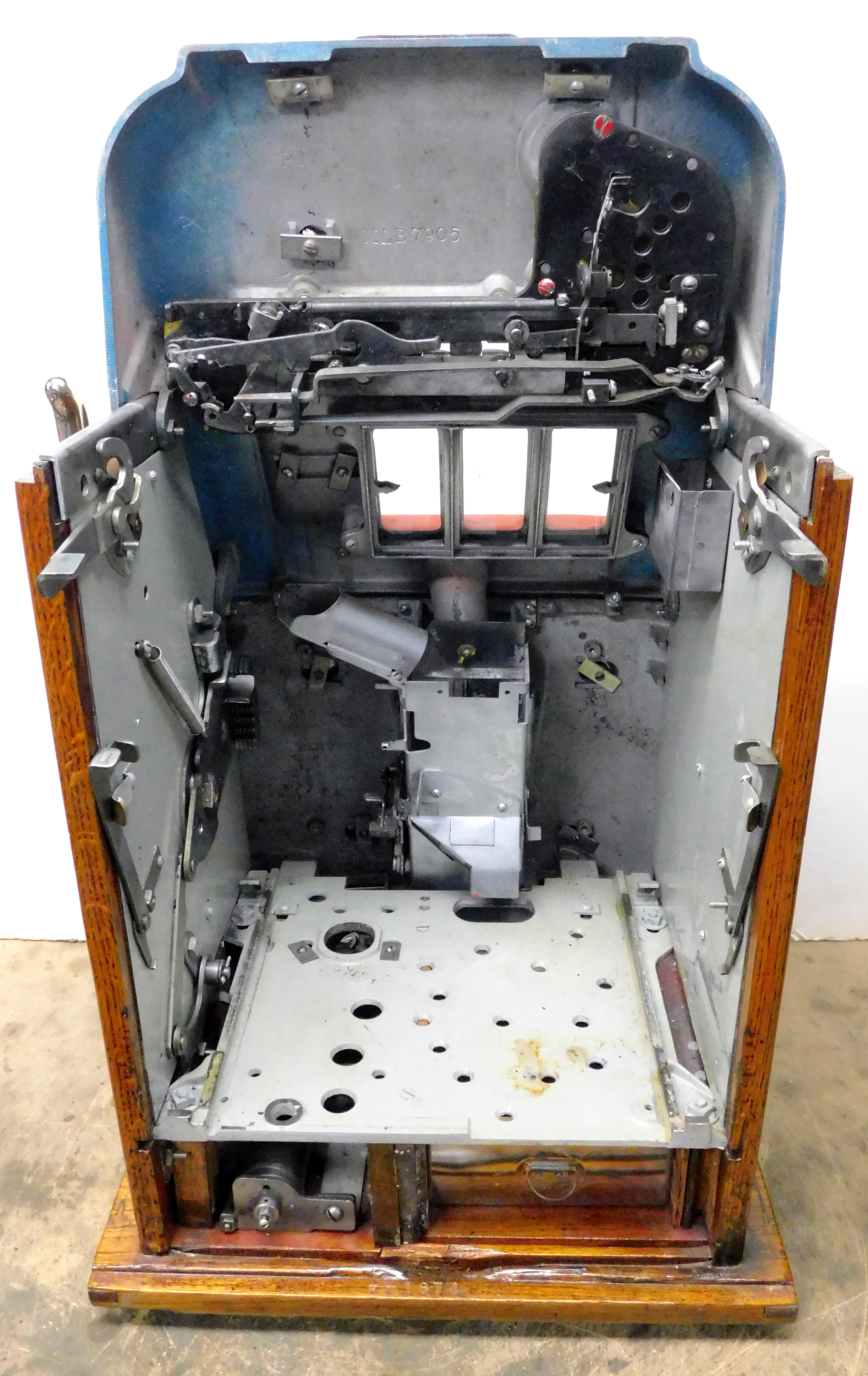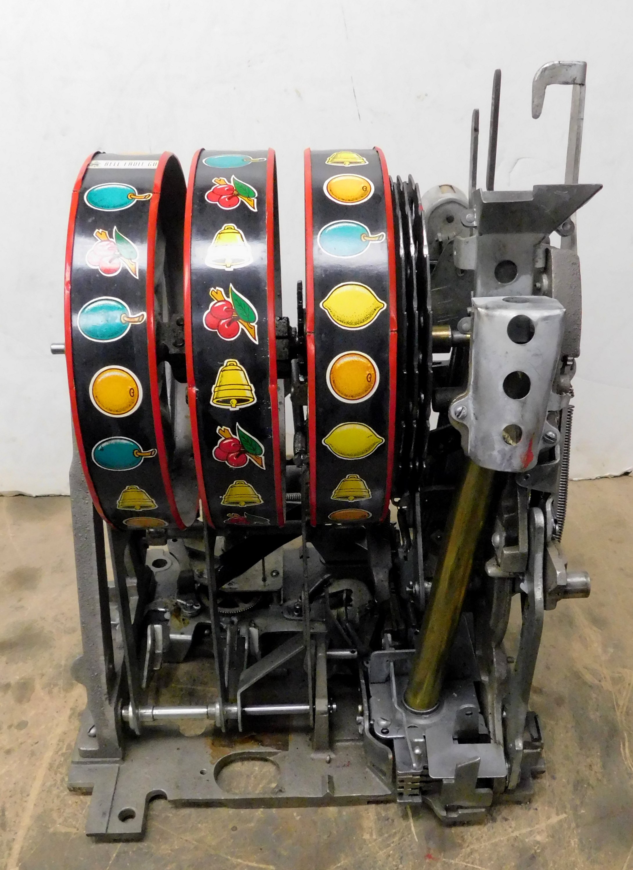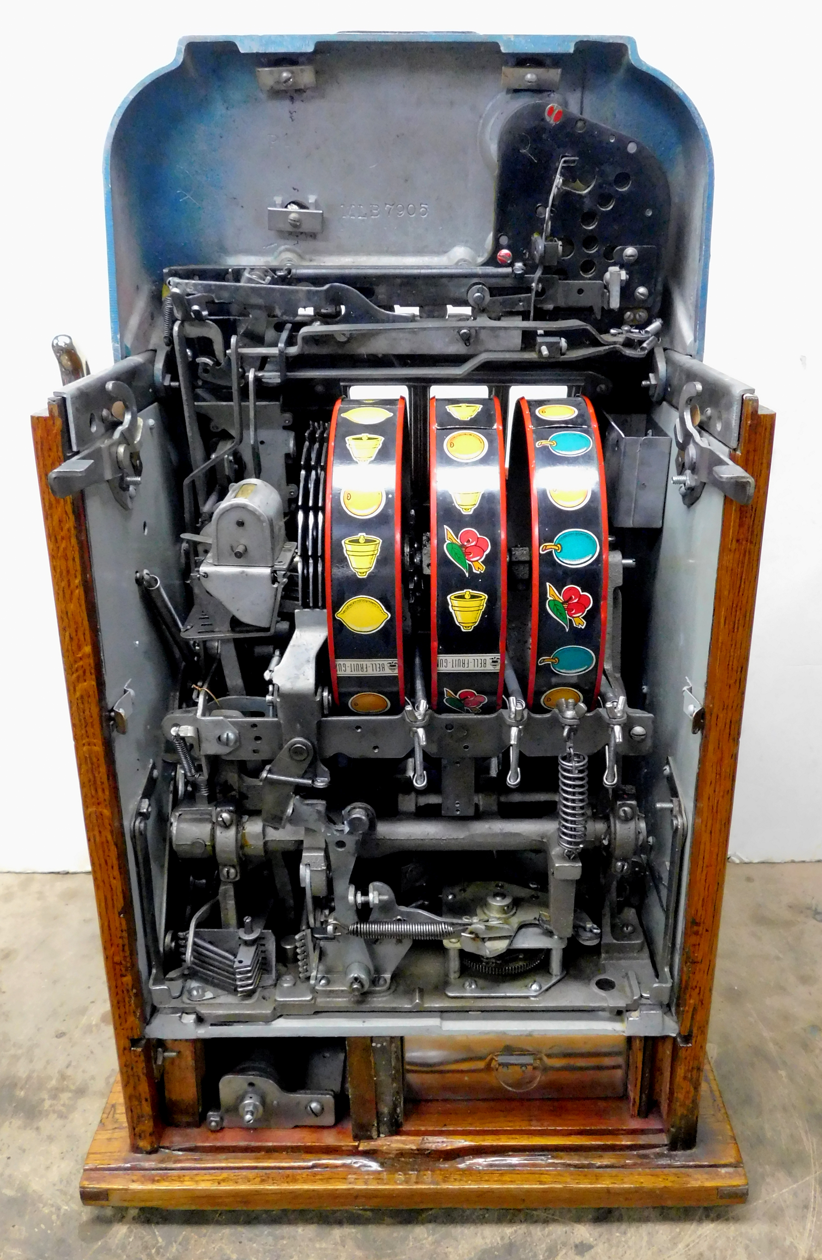 Mills 1948 Blue Bell Hi-Top 10 cent, previously restored wrinkle green and red, all trim on this machine was chrome plated. original award card, original reel strips, Hand load Jackpot, original back door with lock with one key, new cash box. Still has the original Jackpot counter. Plays very easy, 2-5 pay out.