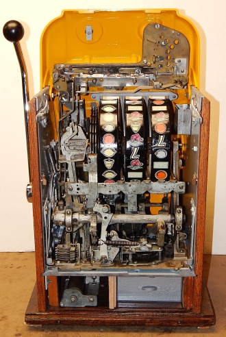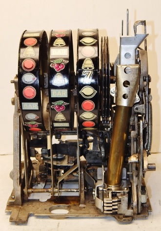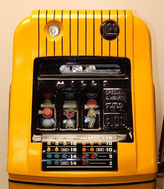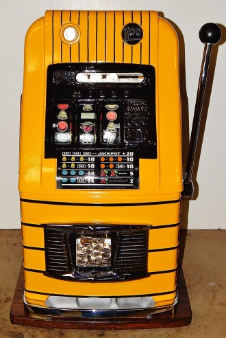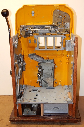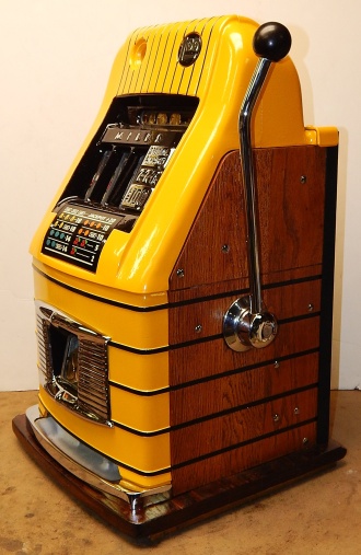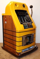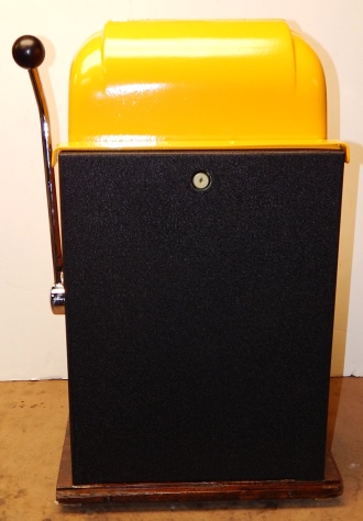 Mills 1949 Hi-Top $1.00 "Susan B Anthony". convert to a "Susan B Anthony". Painted Yellow trimmed in Black Very nice original oak cabinet, cash box, back door, lock with one key. All the trim on this machine is chrome plated Mills never made a dollar machine including this machine however, after market company's and operator did come up with conversion kits to make Mills Machines into a dollar coinage to compete with other dollar machines like Jennings and Pace. The Susan B Anthony coin was minted in 1979 and is still in service and available in banks today.