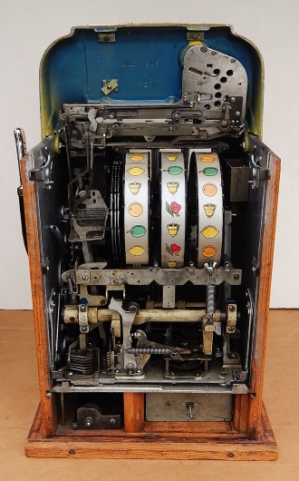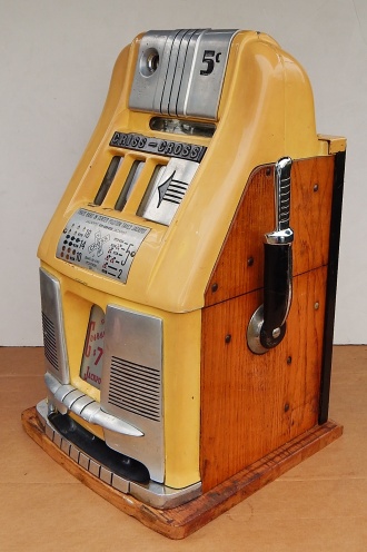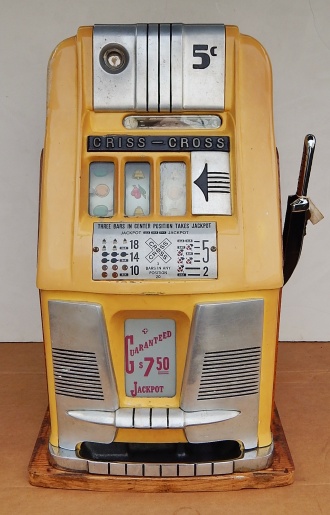Mills 1955 Criss Cross Hi-Top 5 cent, an older restoration New back door, new cash box. Very nice oak cabinet. Very nice Criss Cross award card, club handle, NO JACKPOT. Plays very easy and pays as it should.