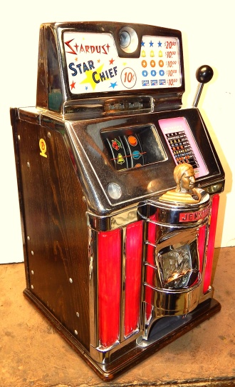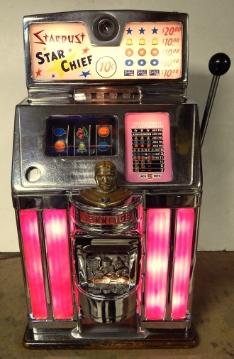 1960 Jennings Governor Star Chief "Stardust" 10 cent "Light-Up" from Las Vegas Casino. This machine is in the same condition all original, as it was when it was operated in the Las Vegas at the Stardust Casino. Still has the inside sticker from Jennings company. Front load Jackpot with key. Five ways to hit the Jackpot. Super nice machine from Las Vegas.