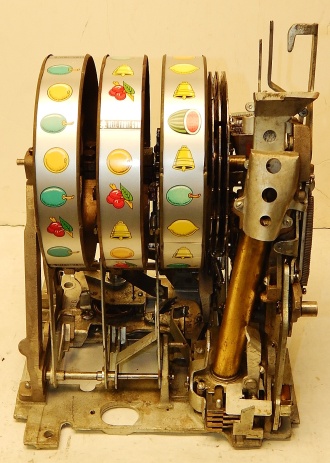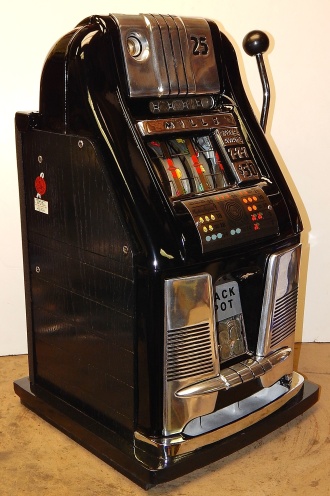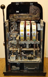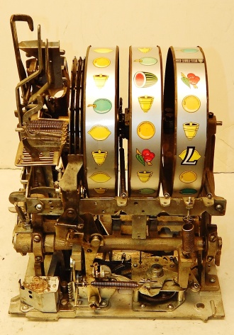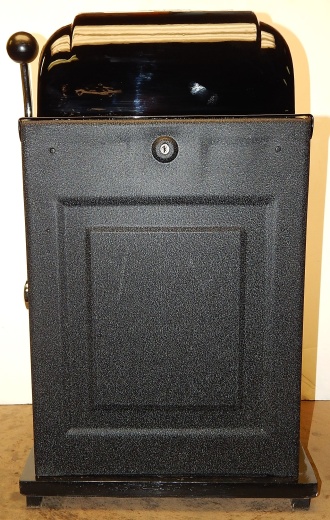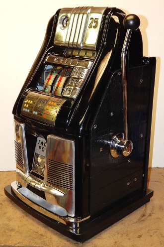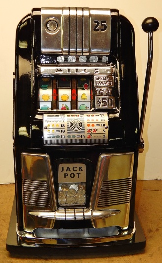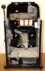 1960 Mills Hi-Top 7-7-7, 25 cent. Restored, powered coated gloss black. Trim on this machine is polished. Full Jackpot with reserve, cash box, original Mills back door with original Mills Lock and key, mint condition original reel stripes. Club Handle. No 7-7-7 Token Vendor in this machine. Play very nice.