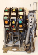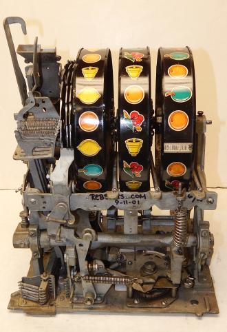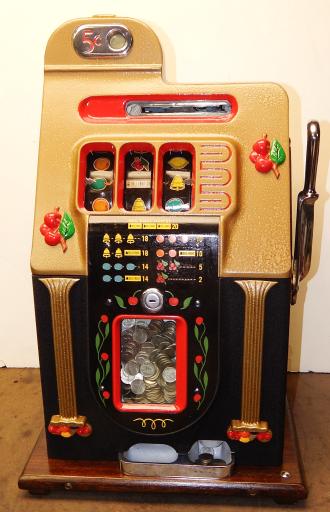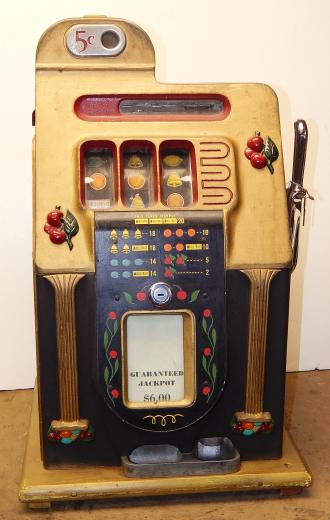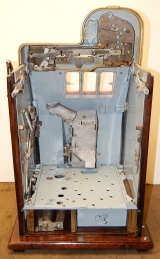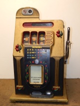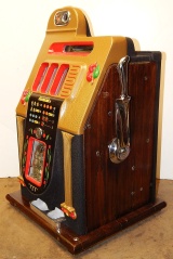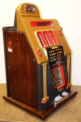 Mills 1948 Golden Falls 5 cent, painted hammer gold and winkle black, trimed in red. This machine has a very nice all oak cabinet. Front Load Jackpot, with original front loader lock and key, back door with an original Mills lock with one key, cash box, mint condition original award card. This is a very nice all orignal machine. Plays very easy, 2-5 payout.