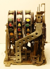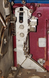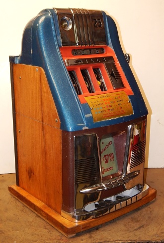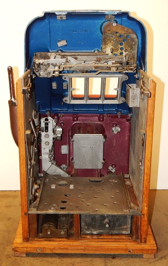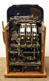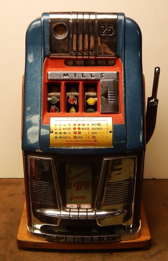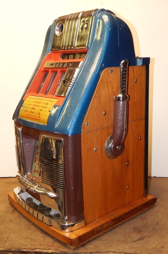 1958 Mills Hi-Top "Criss Cross" 25 cent, original condition paint, original reel strips, original back door, original award card, original Mills locks with one key. The Mills Criss Cross paid out on Bars and Cherry on the first two reels in any combination, it also paid out 20 coins with three BARS any where in the window. It was a big hit back in the day. This machine never came with a Jackpot, it had a token vendor instead of a Jackpot that drop out a token each time the Bars lined up on the center line. This machine still has three original tokens with the original Mills envelope that came from the factory. Other then some very small paint chips it in very good condition. Not bad for a machine that is fifty-five years old. The only thing that we had to do to this machine was polish the trim and clean and lube. If you are looking for a nice original machine here you are. Ready for many years of trouble free play.