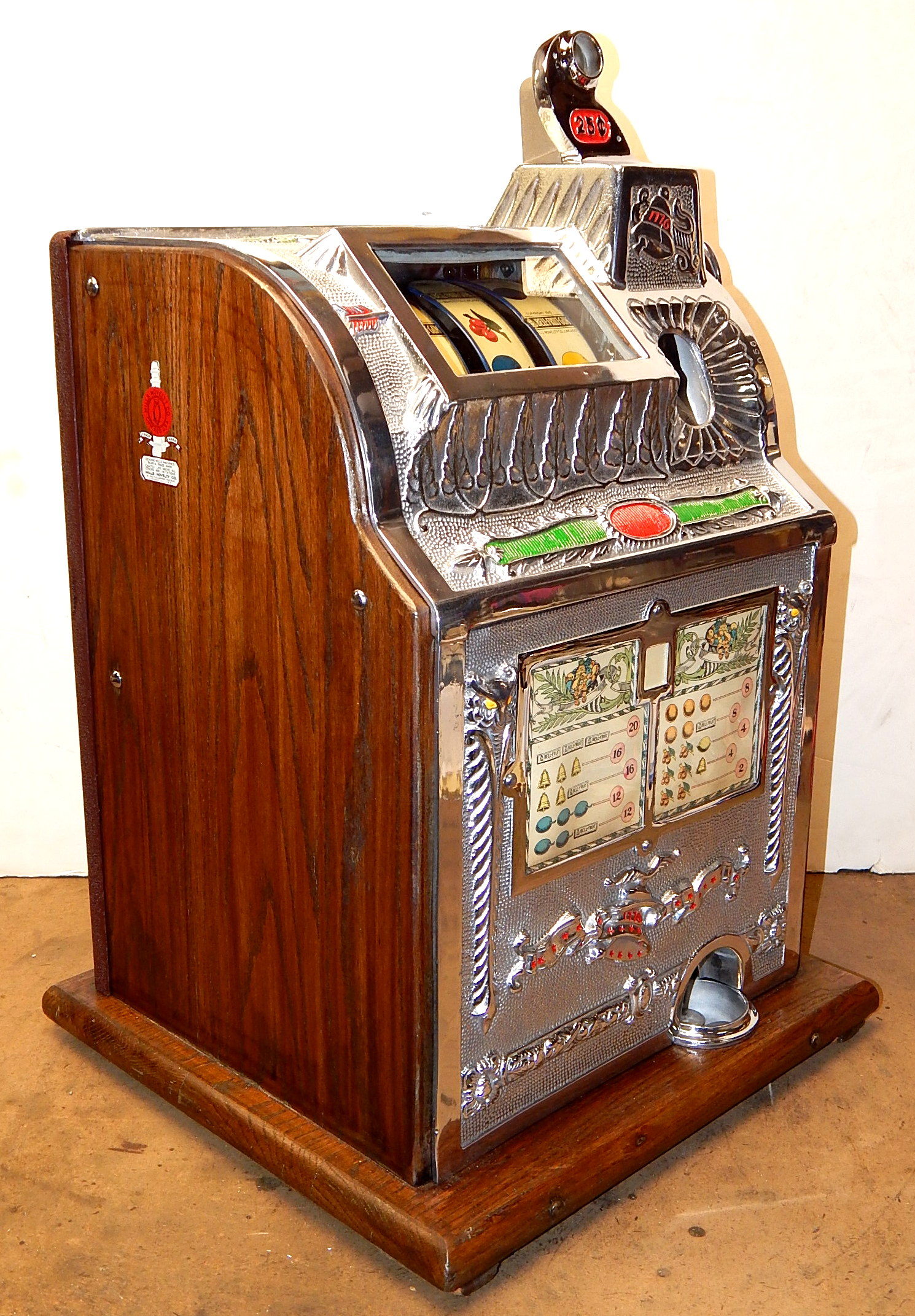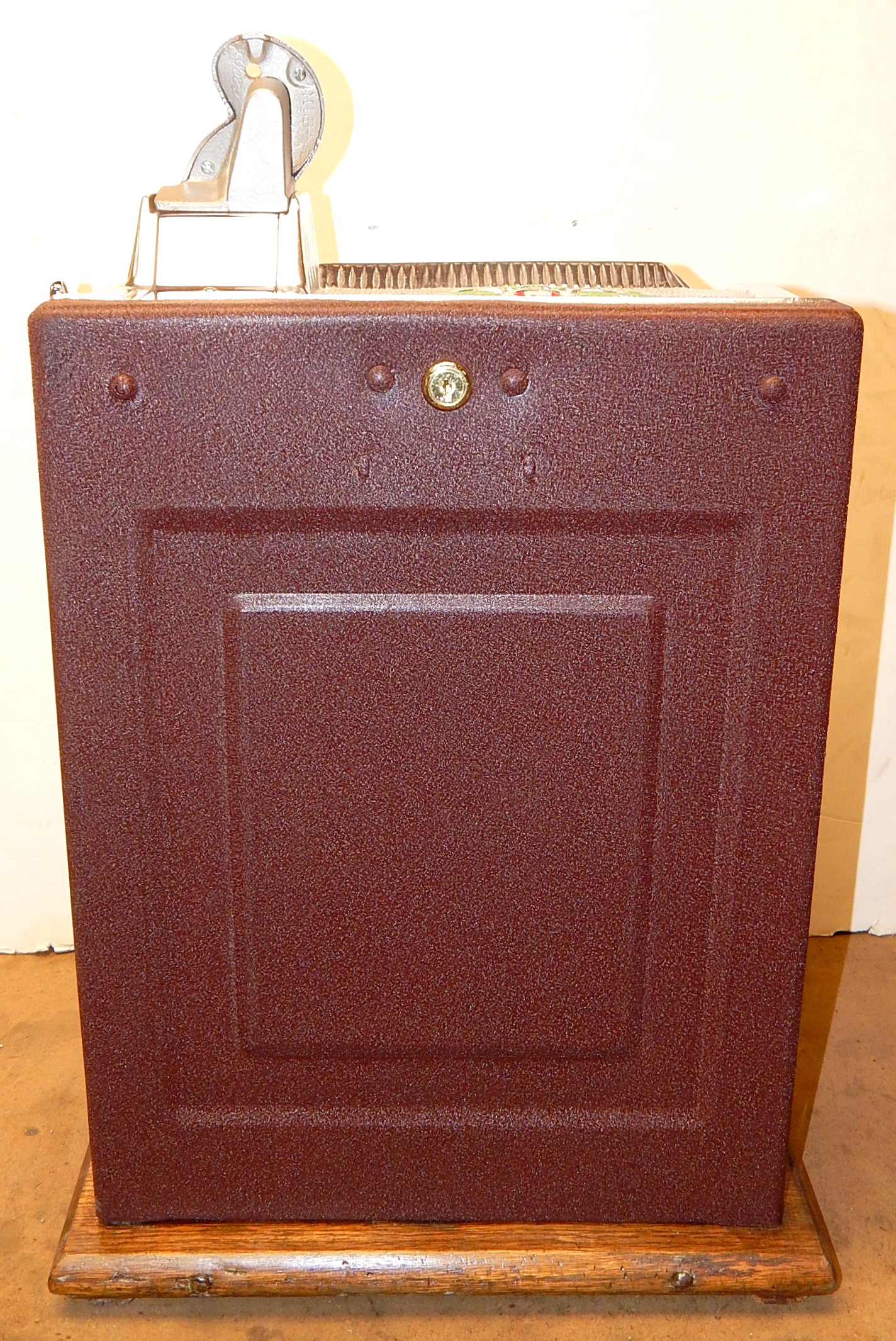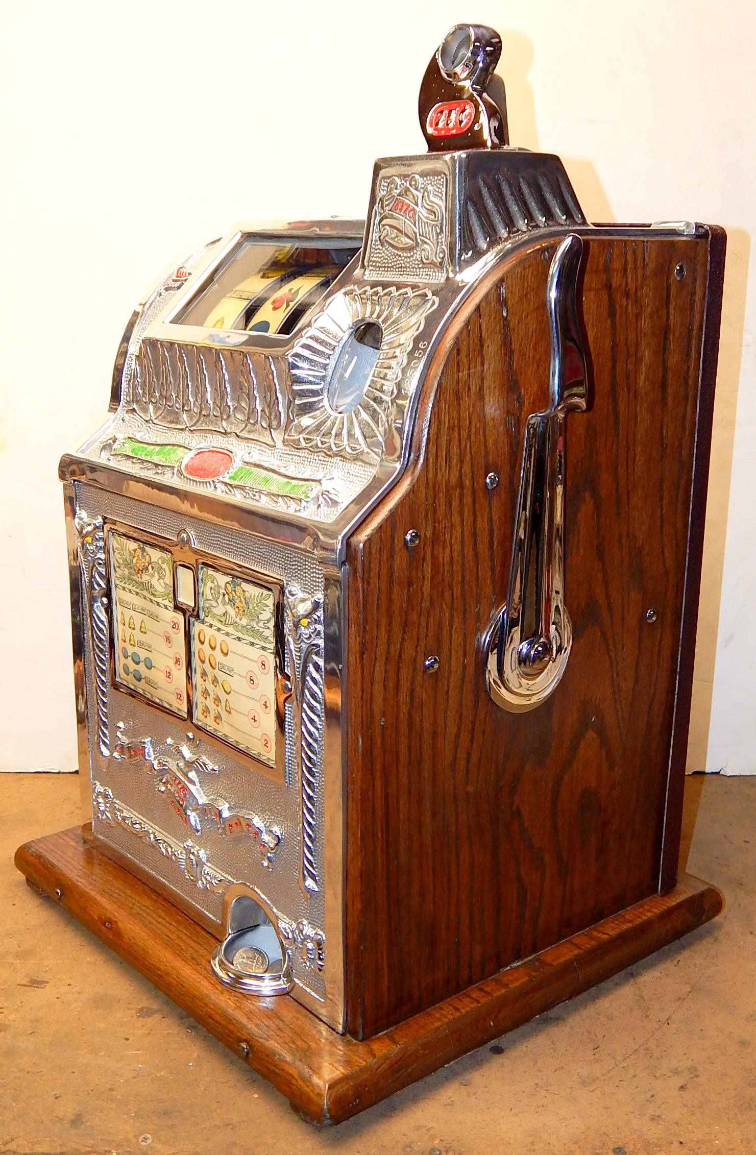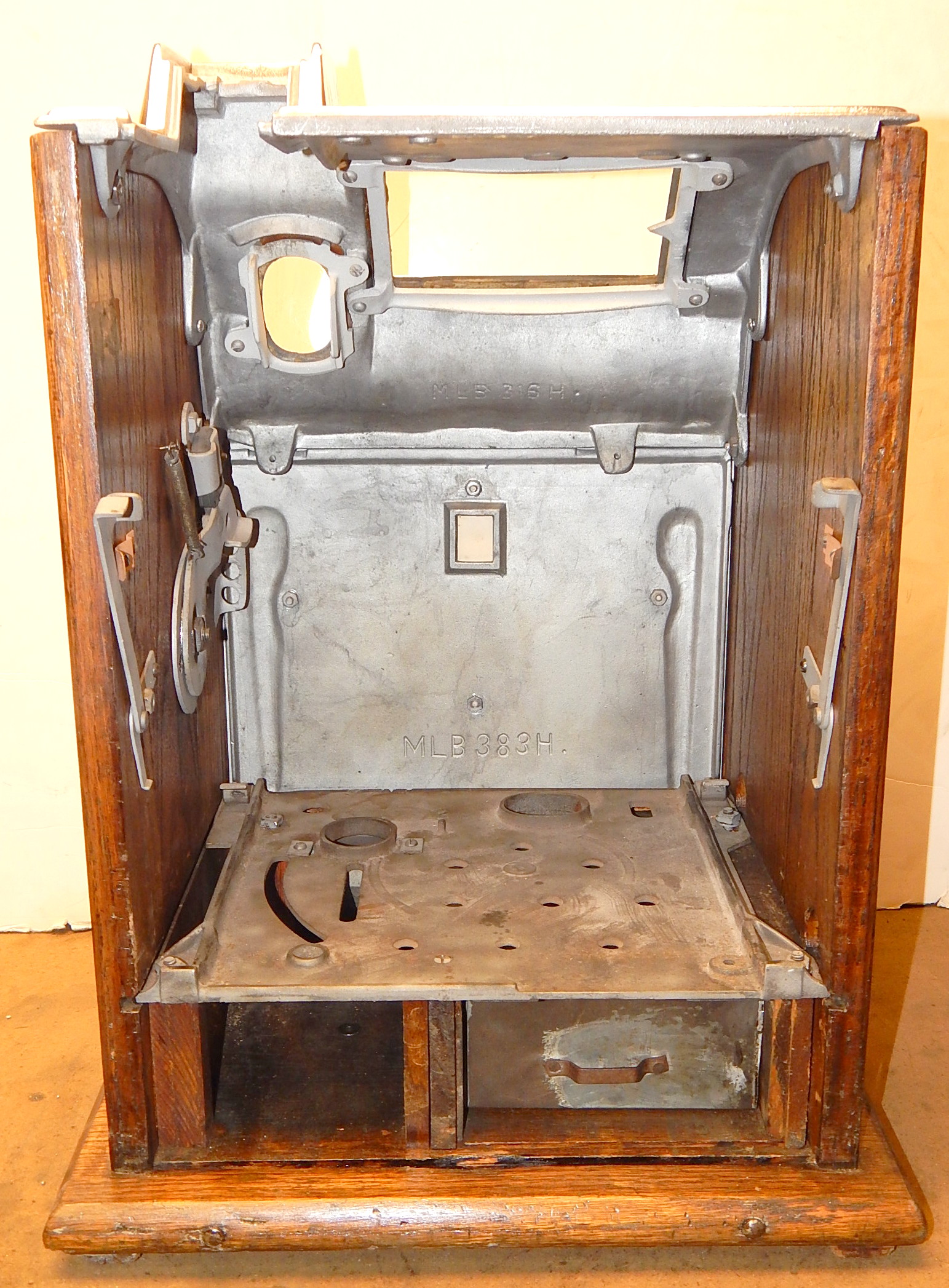 1929 Mills Operator Bell 25 cent, in restored condition. Casting are polished not plated. New chrome plating on handle and coin head. Very nice oak cabinet. Original tin reel strips and original award card in mint condition, original back door with lock, original cash box. Plays very easy. The last picture shows what we started with.