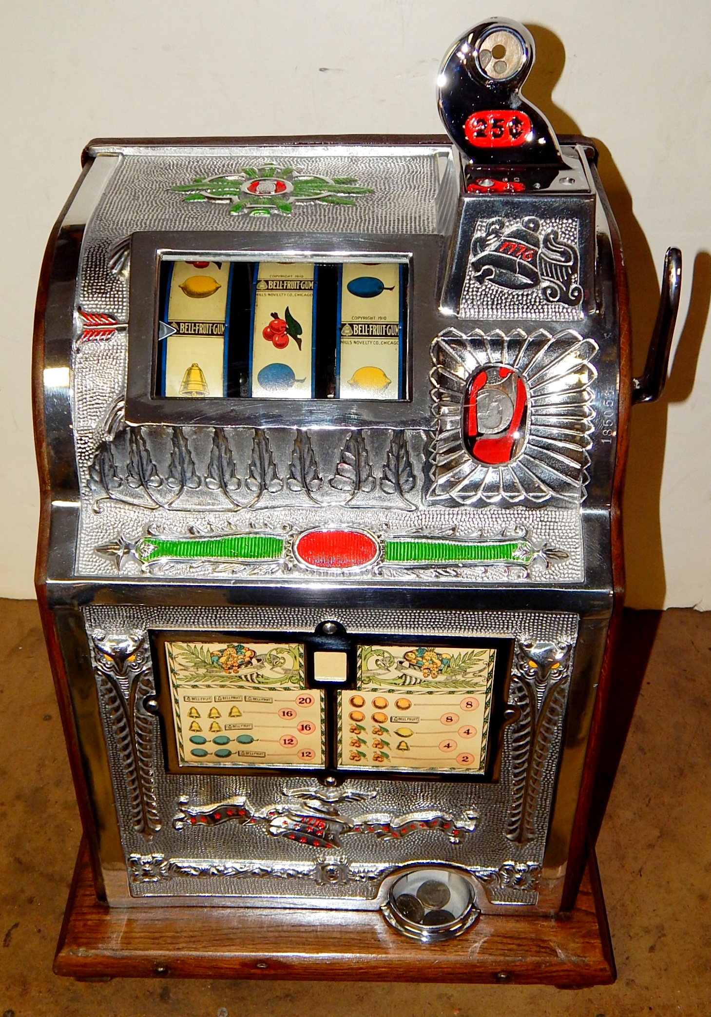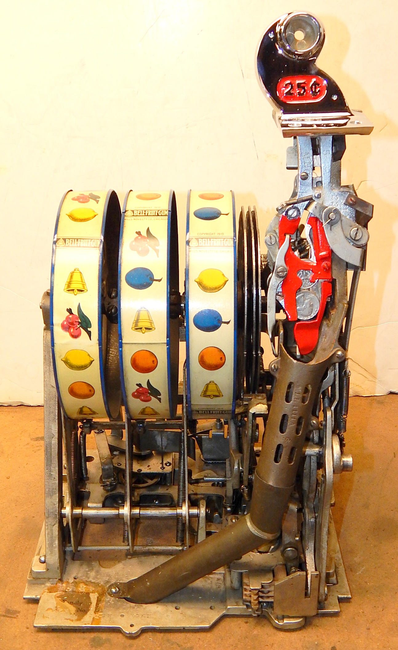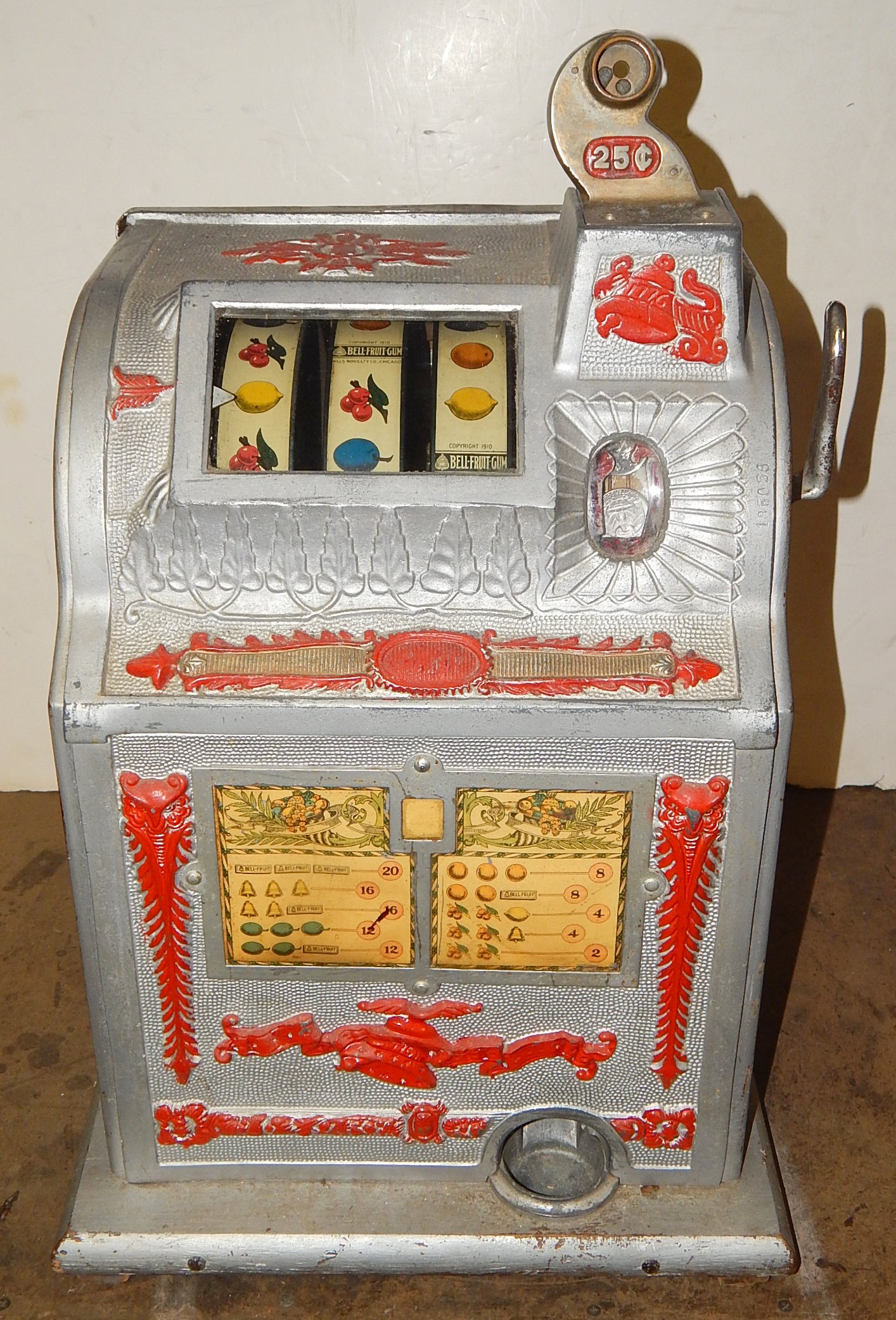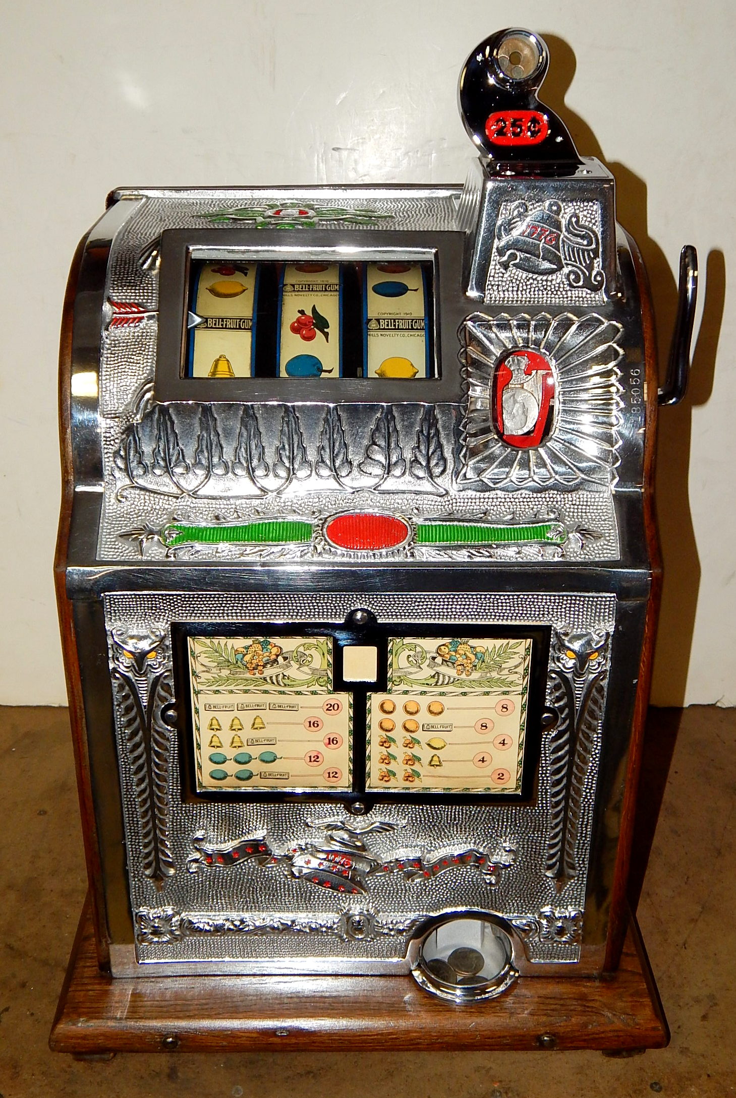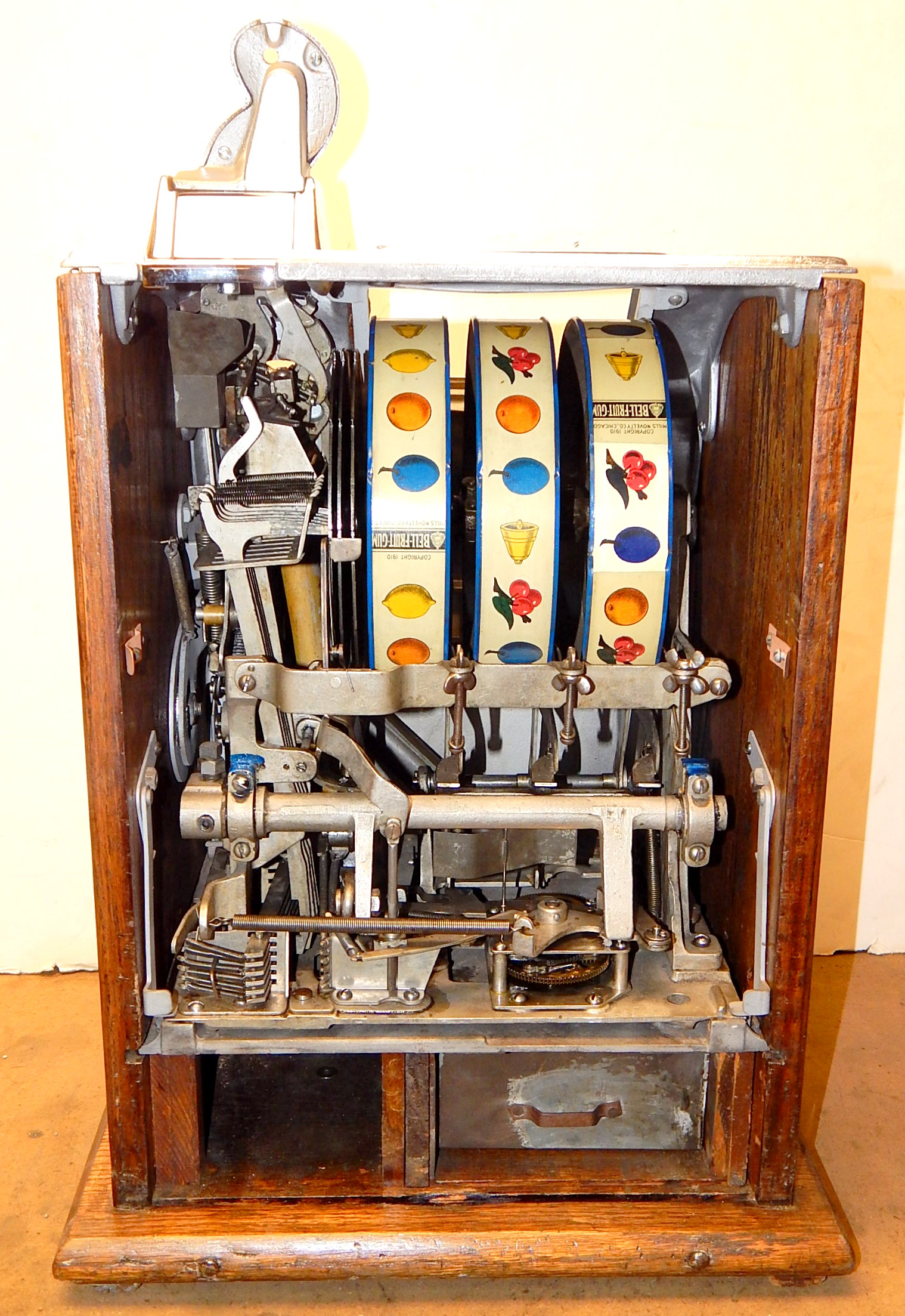 1929 Mills Operator Bell 25 cent, in restored condition. Casting are polished not plated. New chrome plating on handle and coin head. Very nice oak cabinet. Original tin reel strips and original award card in mint condition, original back door with lock, original cash box. Plays very easy. The last picture shows what we started with.