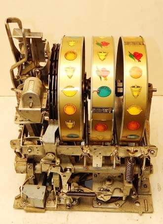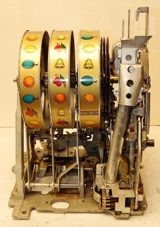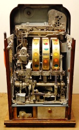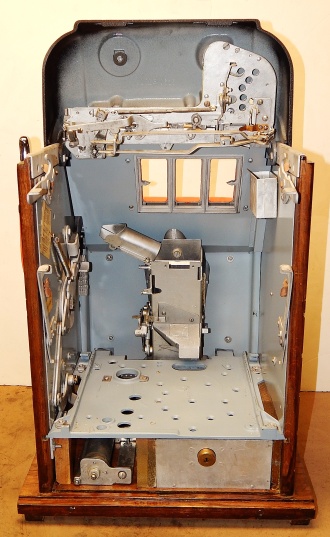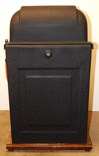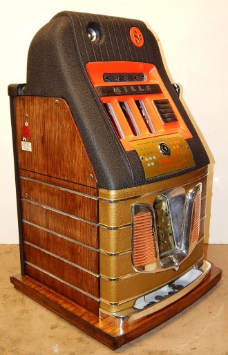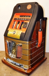 Mills 1947 Black Gold Hi-Top 5 cent, This is a very nice machine restored back to the original colors Hammer Gold, Wrinkle Black, trimmed in Orange. Mint condition award card, original back door and lock with one key, original cash box. All the trim on this machine was chrome plated to add a little flash with the bright color.