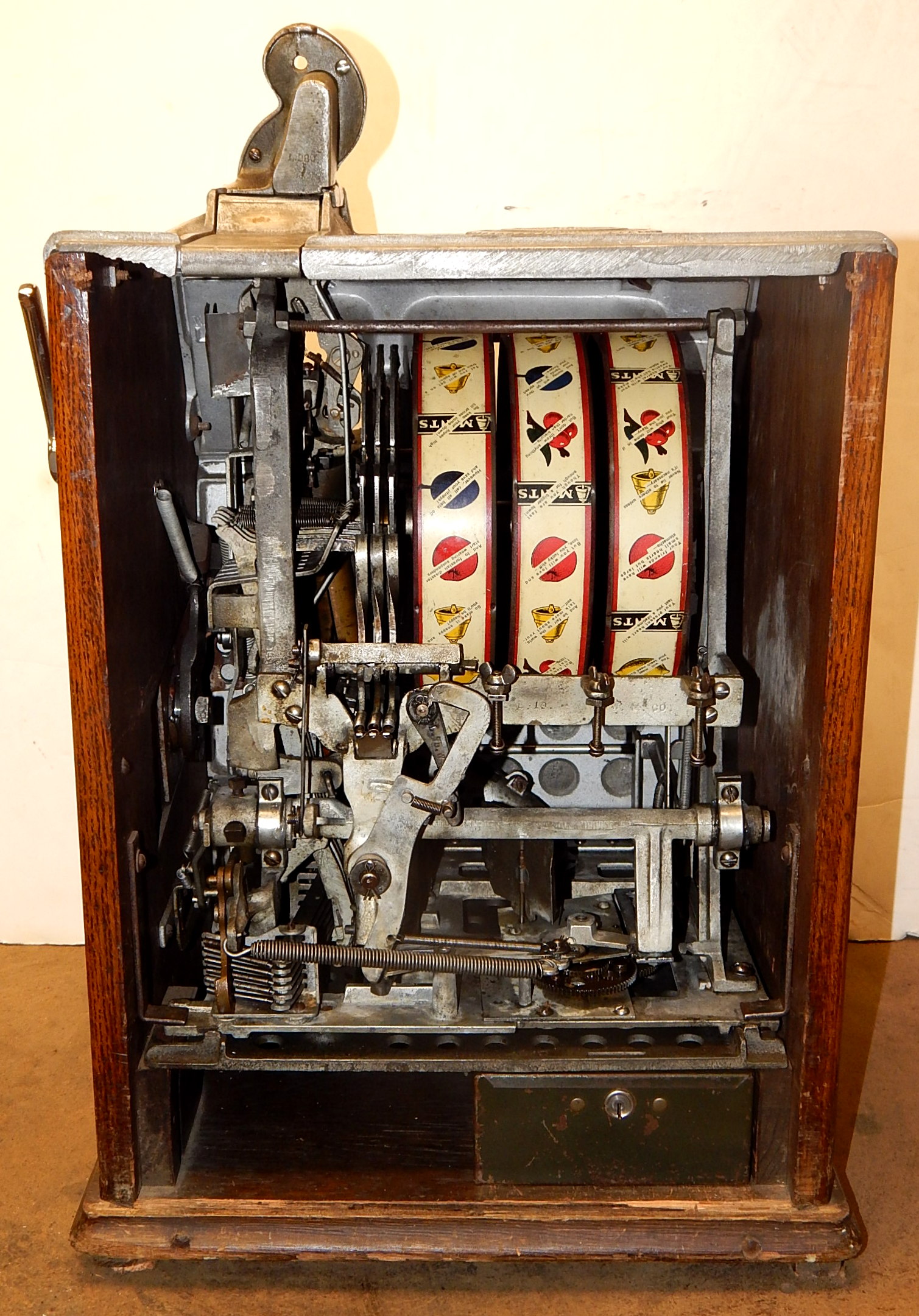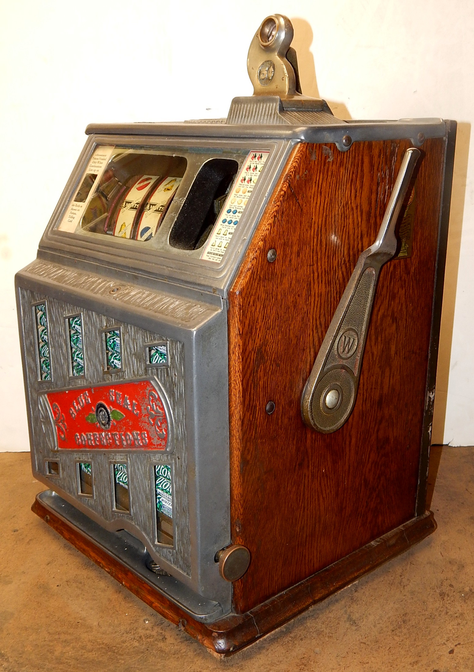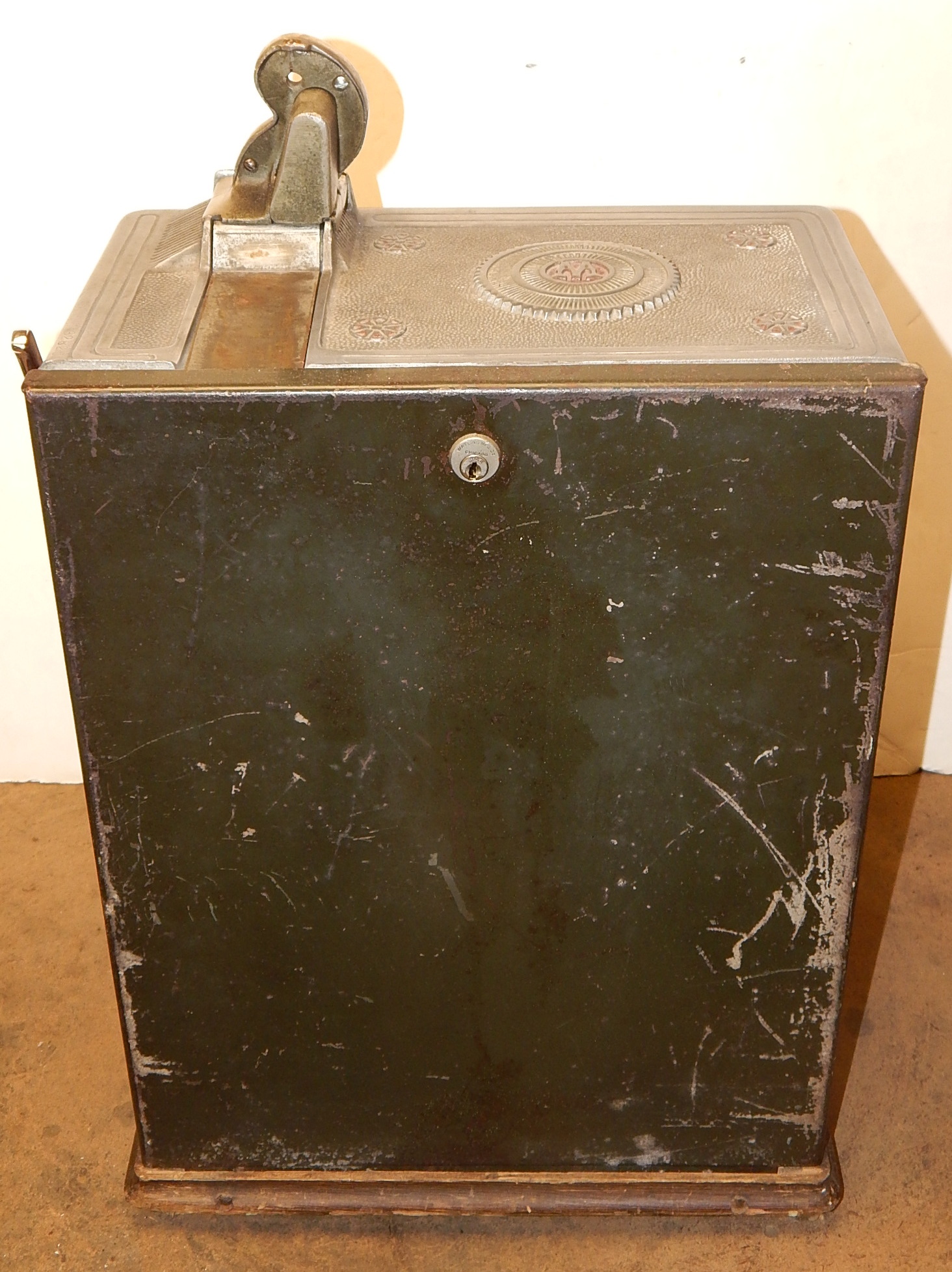 1926 Watling Blue Seal Confection 5 cent, original condition. Fortune reel strips, four column mint vendor. Original back door with Watling lock and key, original cash box with Watling lock and key, oak cabinet. Play easy and pays as it should.