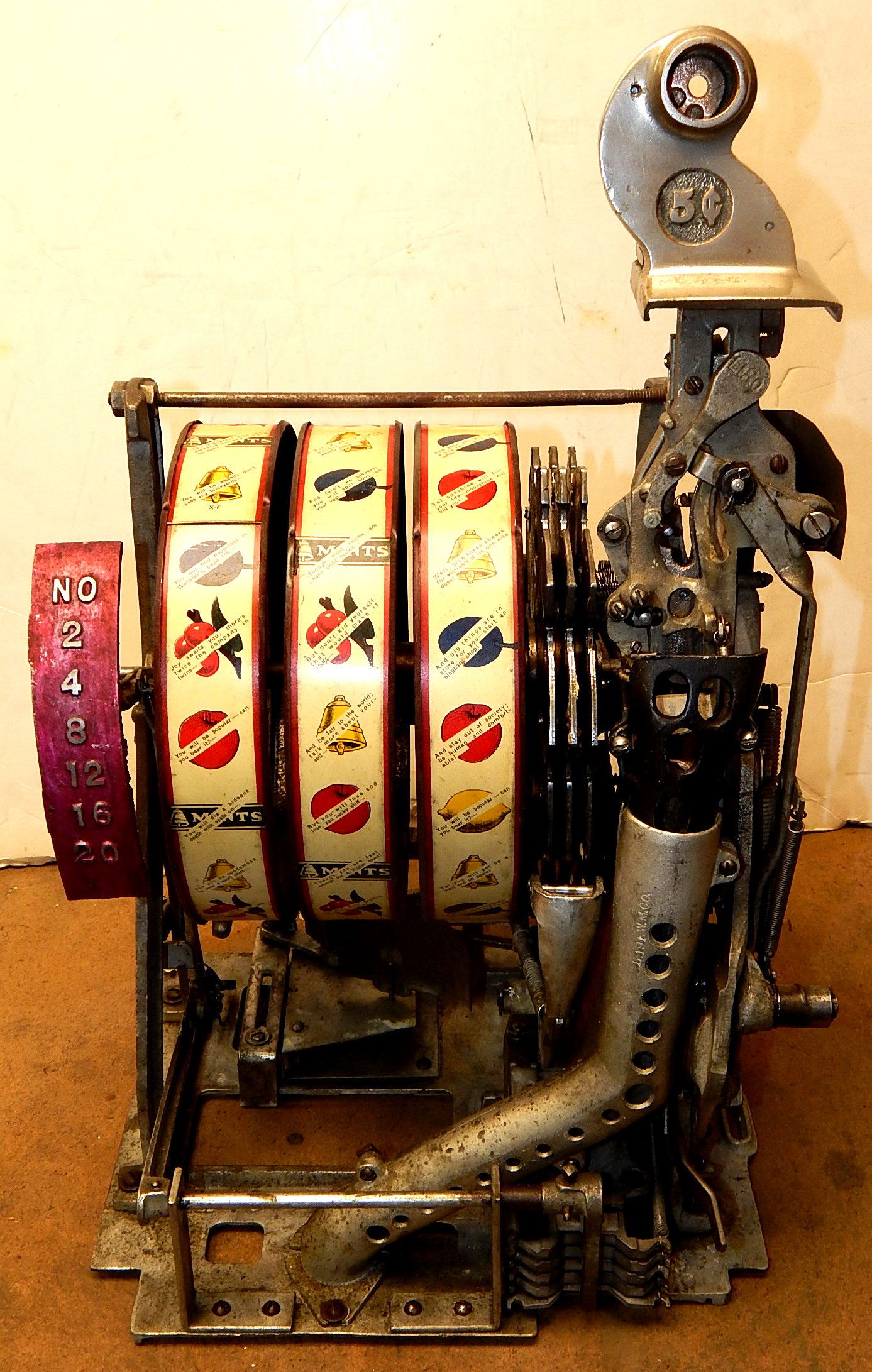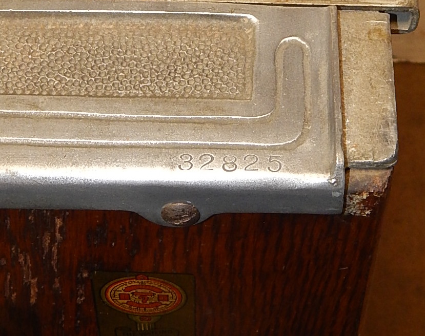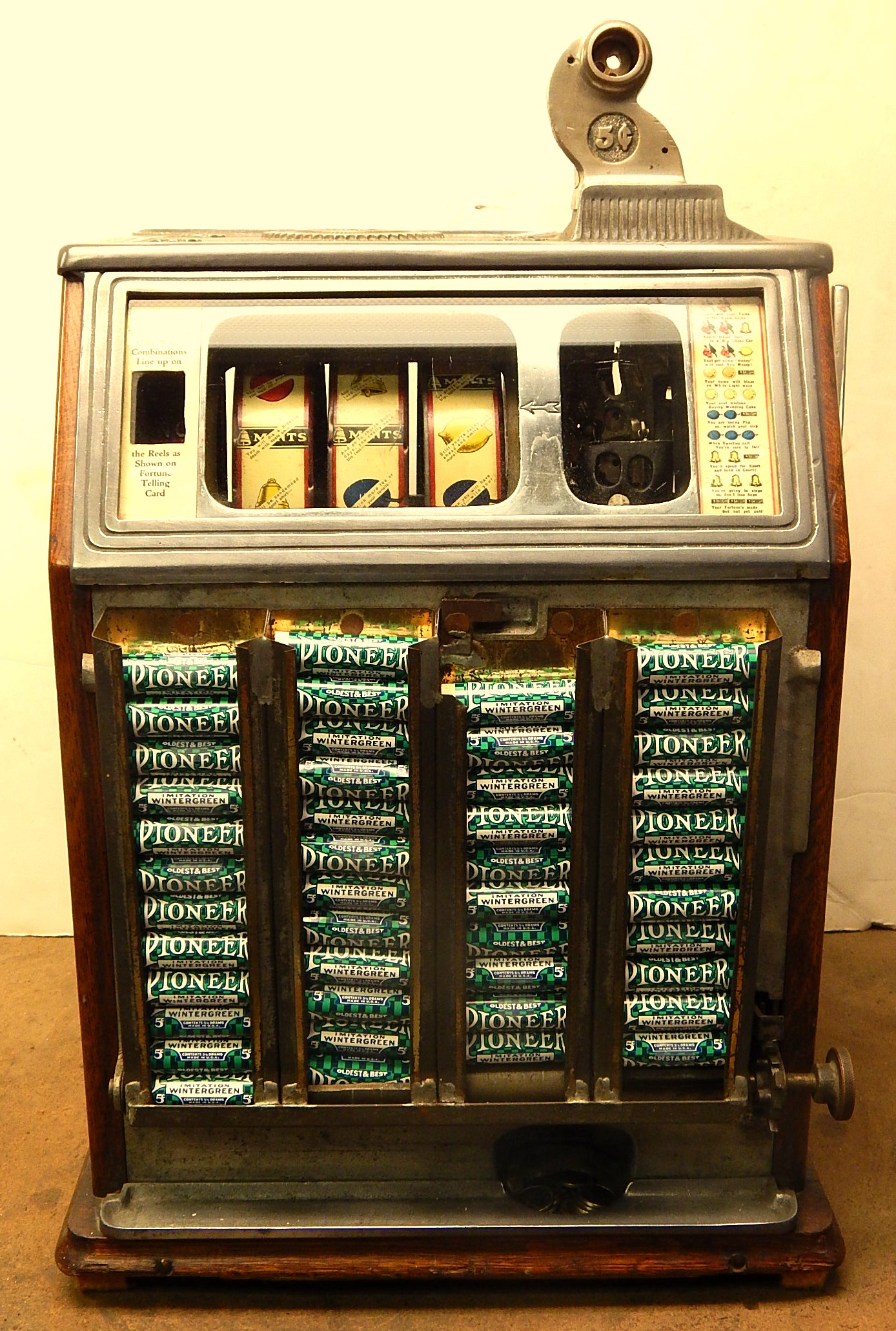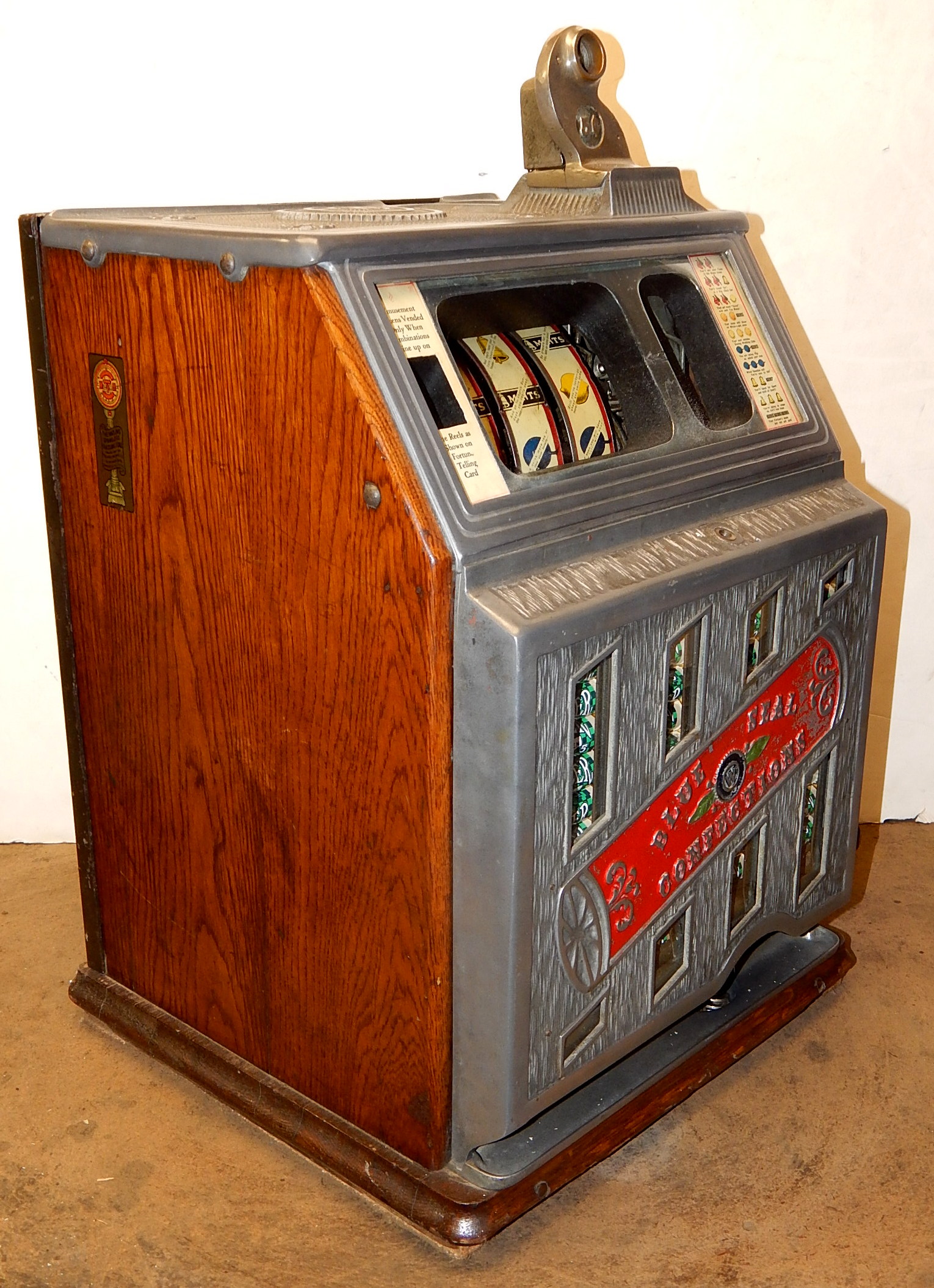 1926 Watling Blue Seal Confection 5 cent, original condition. Fortune reel strips, four column mint vendor. Original back door with Watling lock and key, original cash box with Watling lock and key, oak cabinet. Play easy and pays as it should.