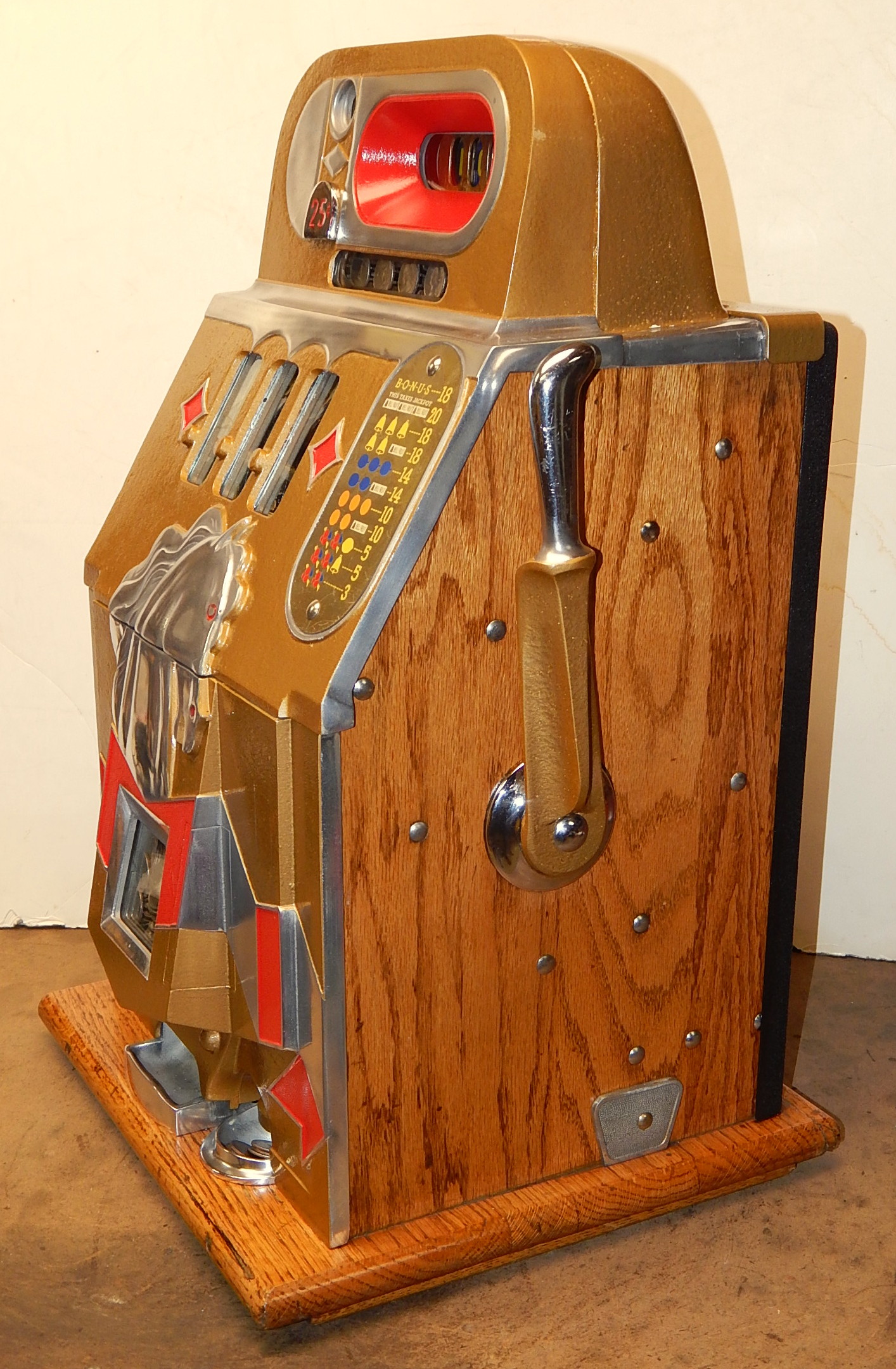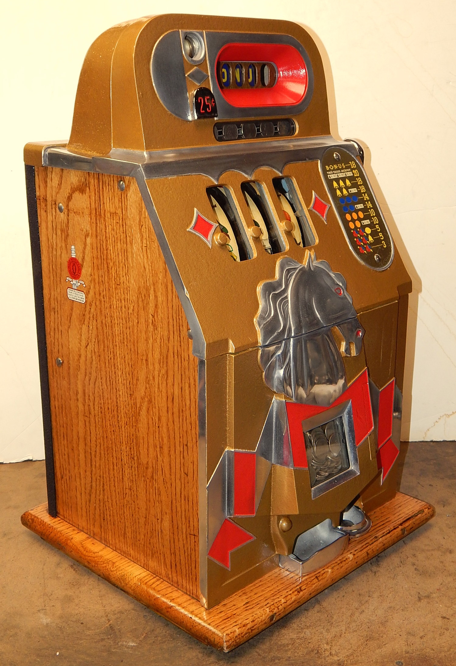 Mills 1938 Horse Head Bonus, 25 cent. previously restored back to the original colors, gold trim in red, with the Hard to find Bonus feature. original reel strips, original award card, original cashbox, original back door with Mills locks with one keys. Casting polish not plated, no cracks or breaks in the casting. Plays as it should.
