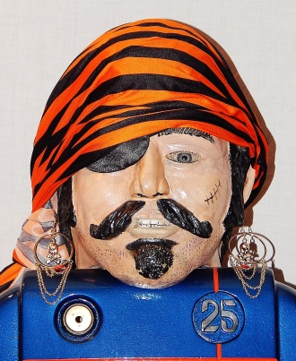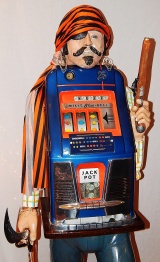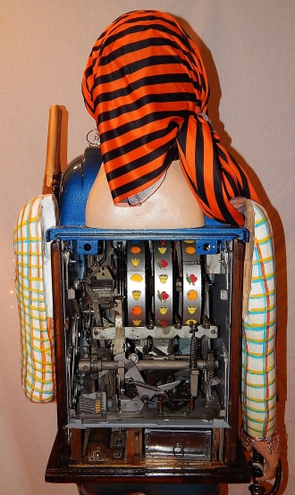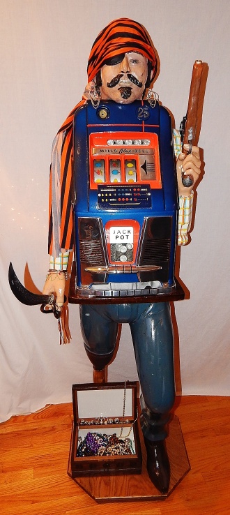 Mills 1956 Blue Bell Hi-Top 25 cent in a Pirate Carving, restored, painted in New York Mets colors blue and orange. Original award card, original reel strips, Jackpot with reserve, original back door with lock with one key, new cash box. Plays very easy, 2-5 pay out.