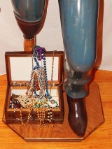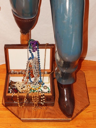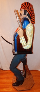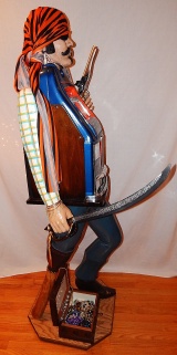 Pirate Carving is a R.S.Delong creation. Mr. Delong has been carving for over 40 years and is still carving today. He is the only carver that installs glass eyes in his carvings, something special compared to other carvings over the years. This Pirate Stands 6' tall, comes with treasure chest and jewelry, long plastic sword, pirate ear rings and bracelets.