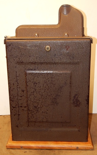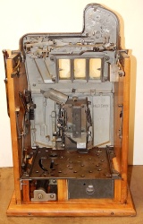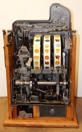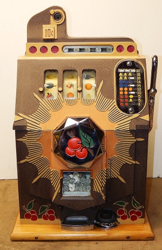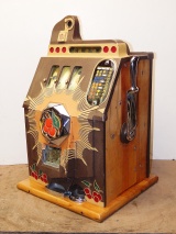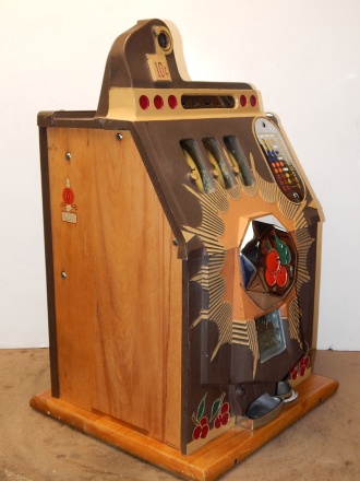 1938 Mills Brown Front "Bursting Cherry", 10 cent . This is a very nice original machine "not restored", Original Brown wrinkle, with red and orange trim colors. Previous owner had the handle and money bowl chrome plated along with the award card, which is hand painted, Jackpot with reserve, original cash box. Beautiful pine cabinet. Plays very easy, pays as it should. 3-5 payout.