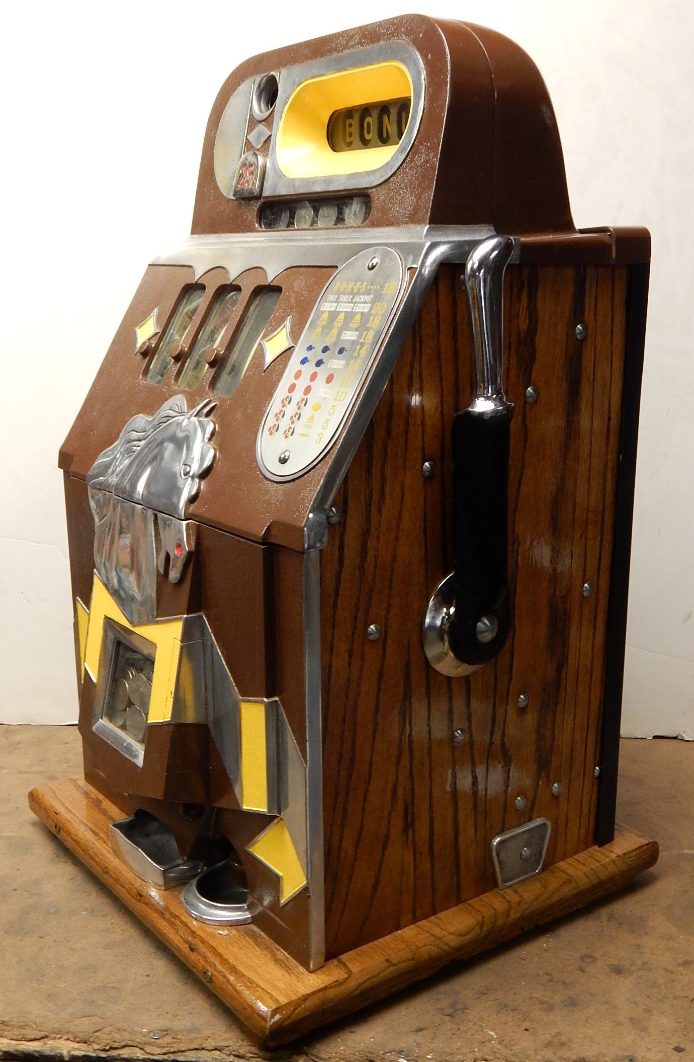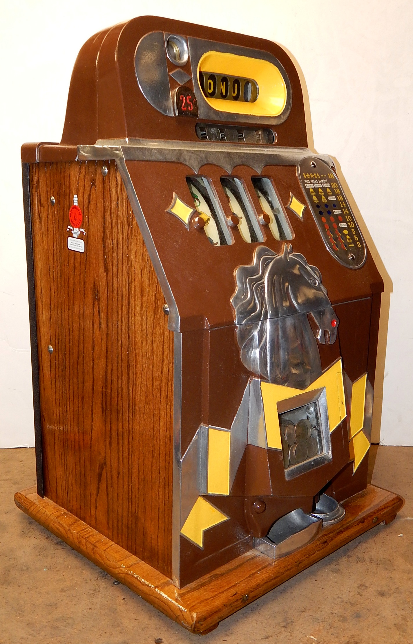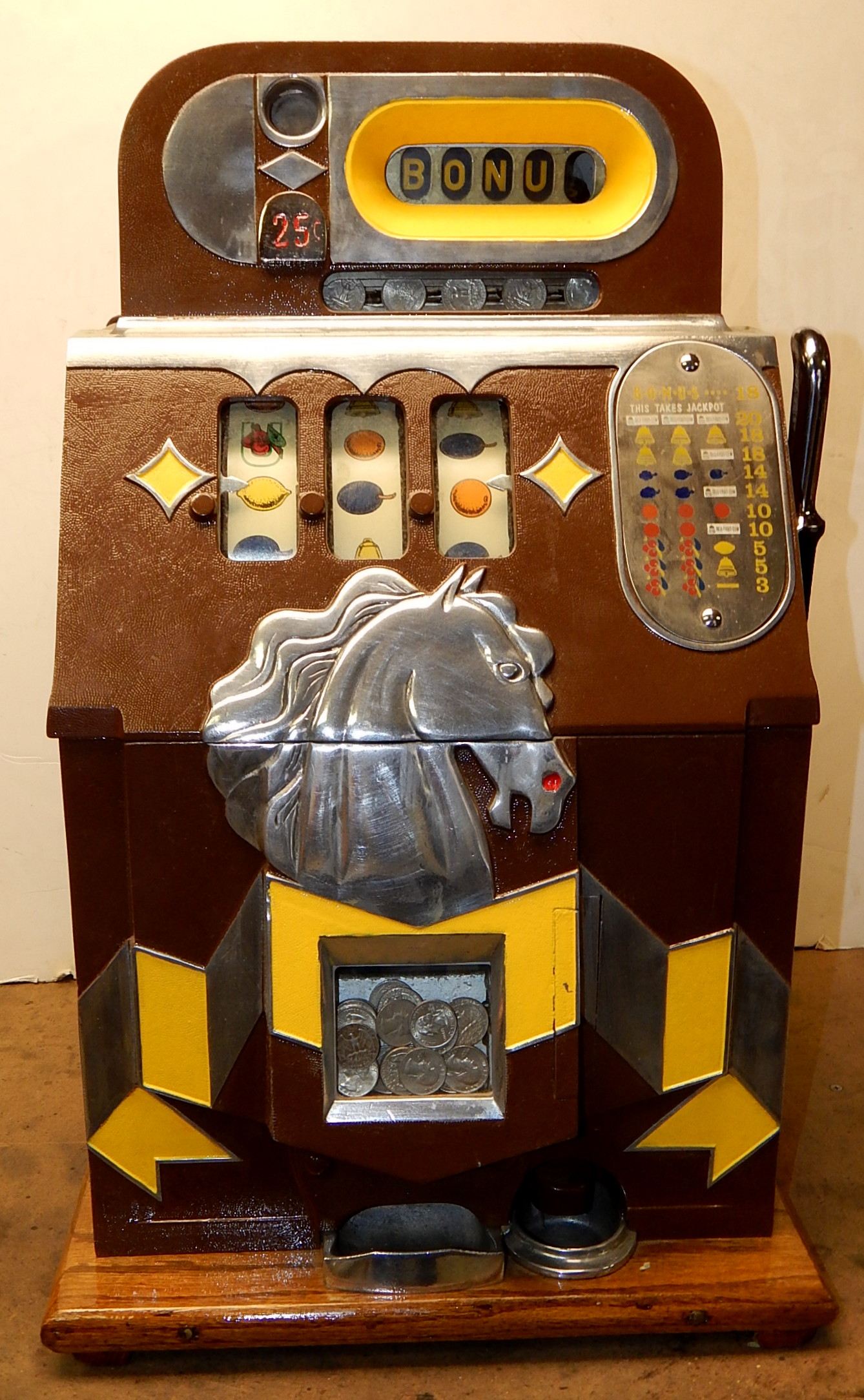 Mills 1938 Horse Head Bonus, 25 cent, previously restored, painted brown, trim in yellow with the Hard to find Bonus feature. New reel strips, new award card, original cashbox, original back door with Mills lock with one key. Casting polish not plated.