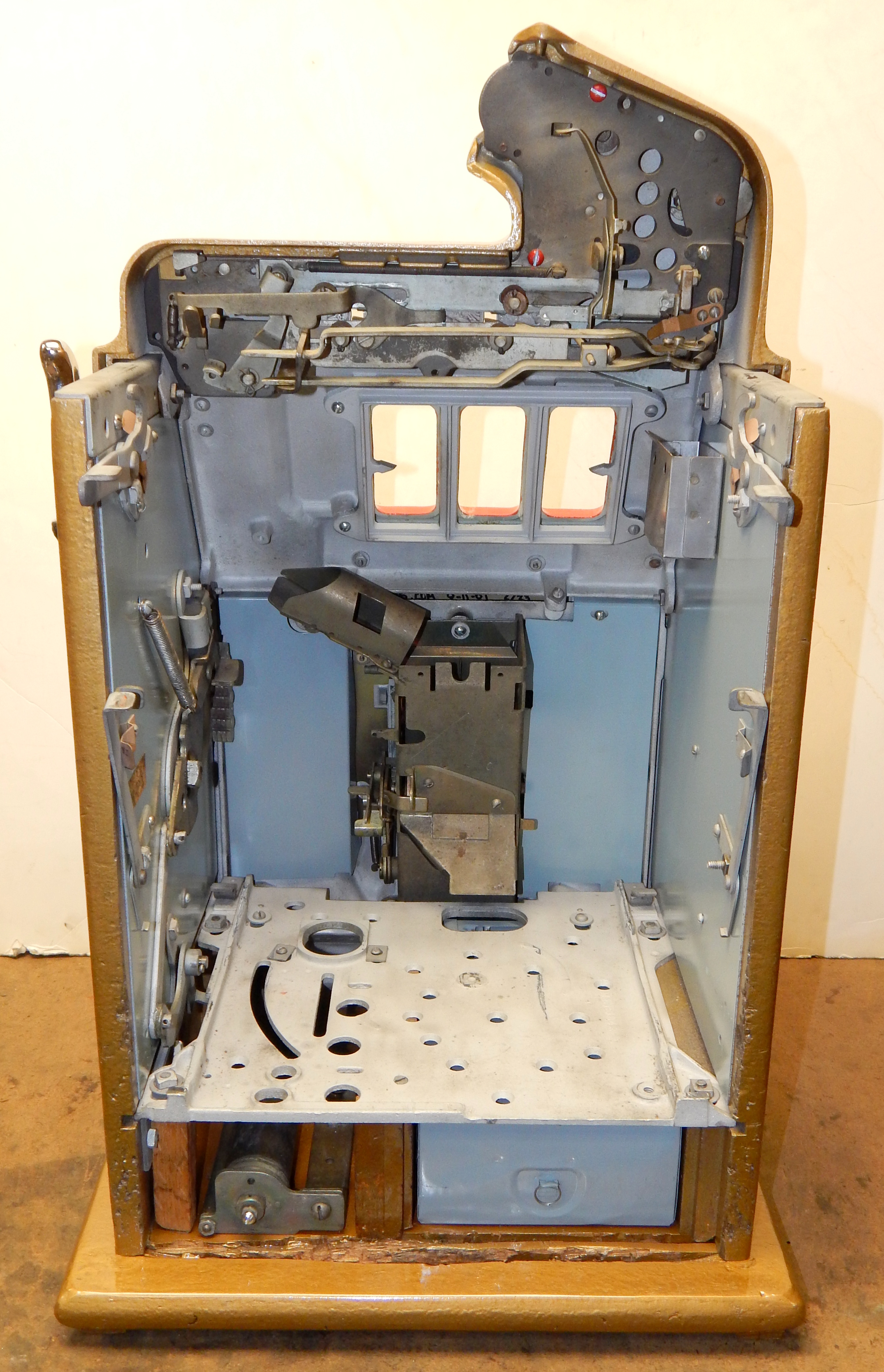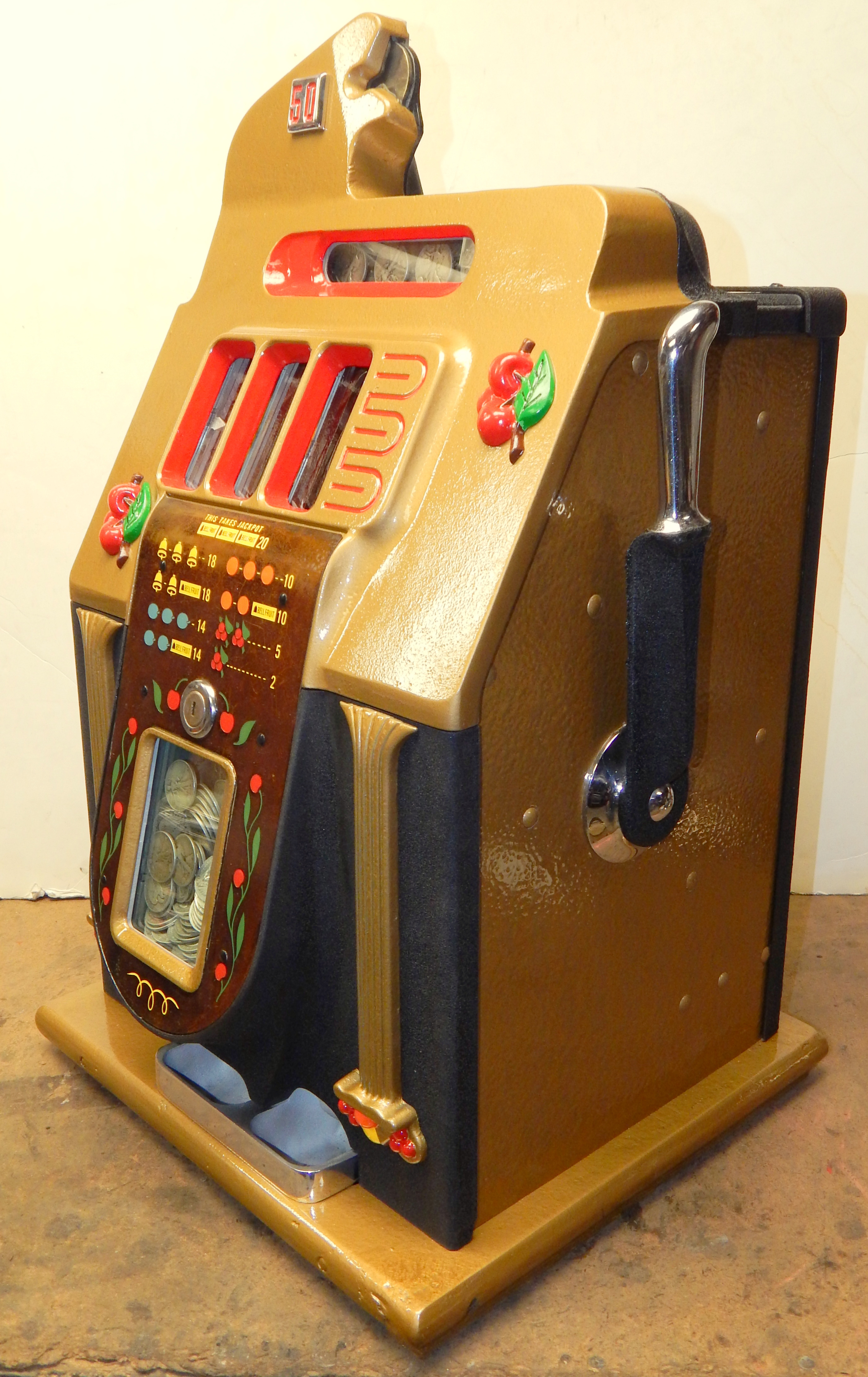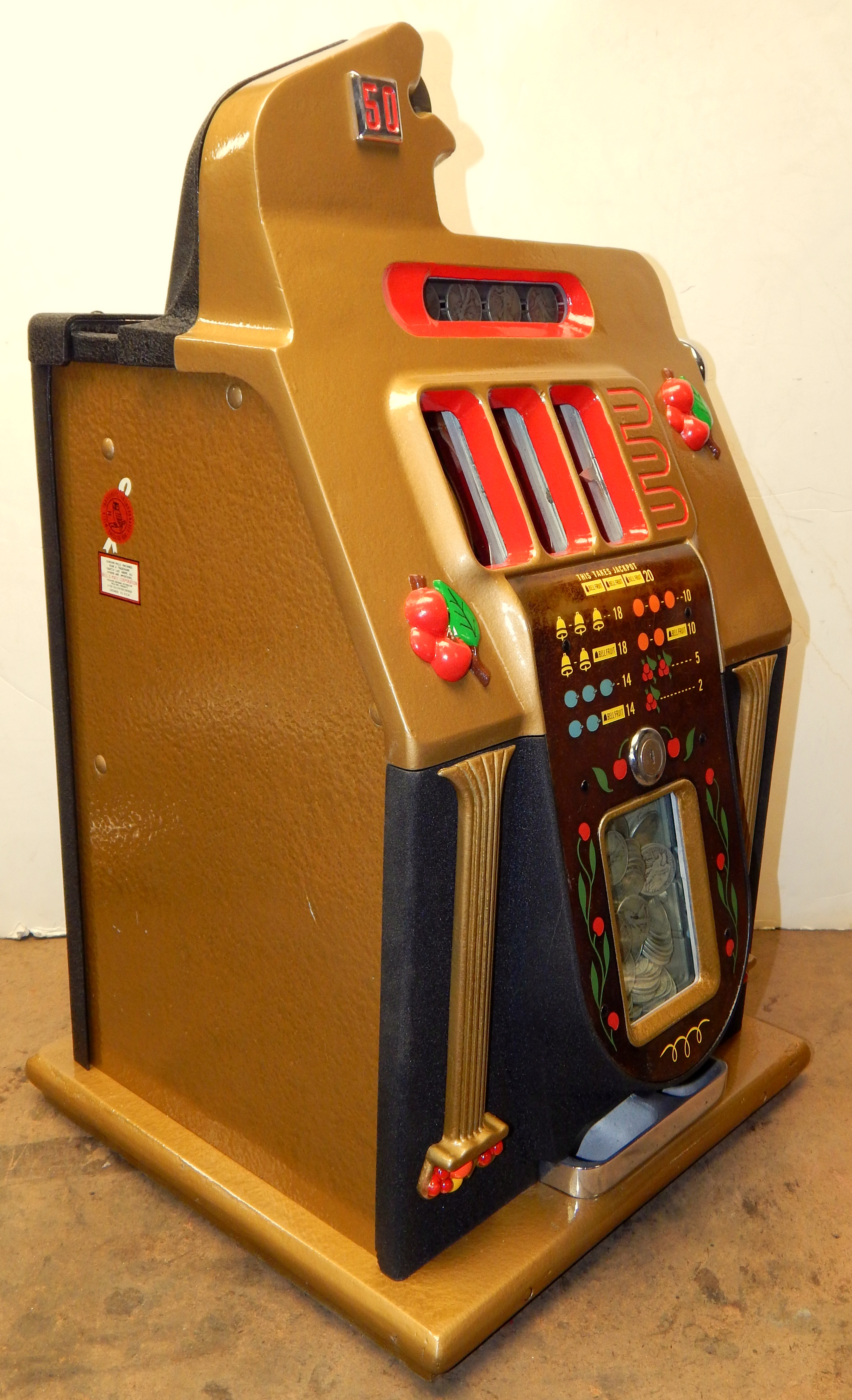 1946 Mills Golden Falls 50 cent, another large coin machine. Restored, painted back to it original colors, Hammer Gold trimmed in red. Front load Jackpot, Original reel strips, original award card, original back door with Mills lock with one key, original cash box. Still has the original serial number tag on the inside. Plays very easy and pays as it should. Everything on this machine is original other than the paint and Mills decal. Very nice machine.