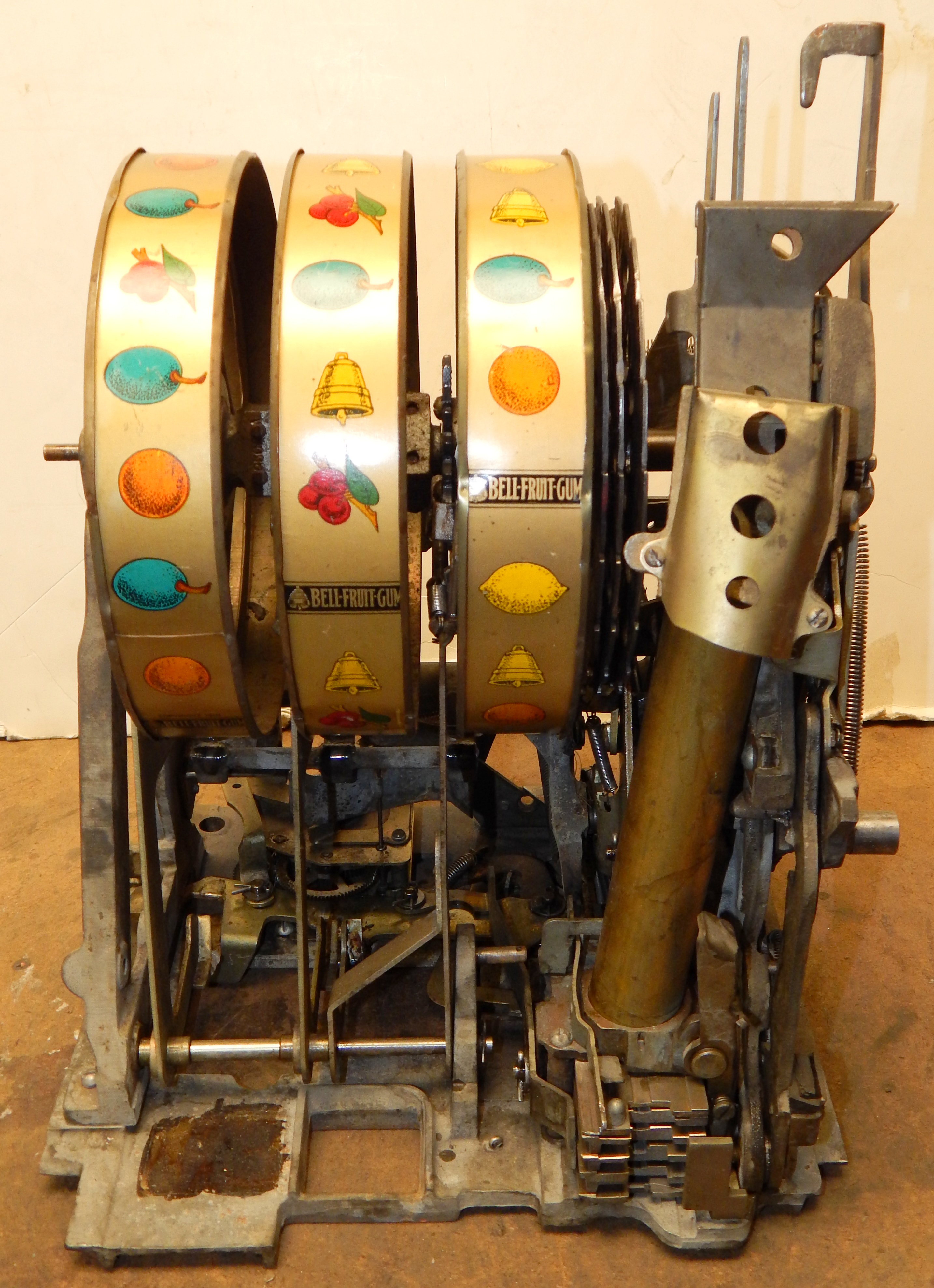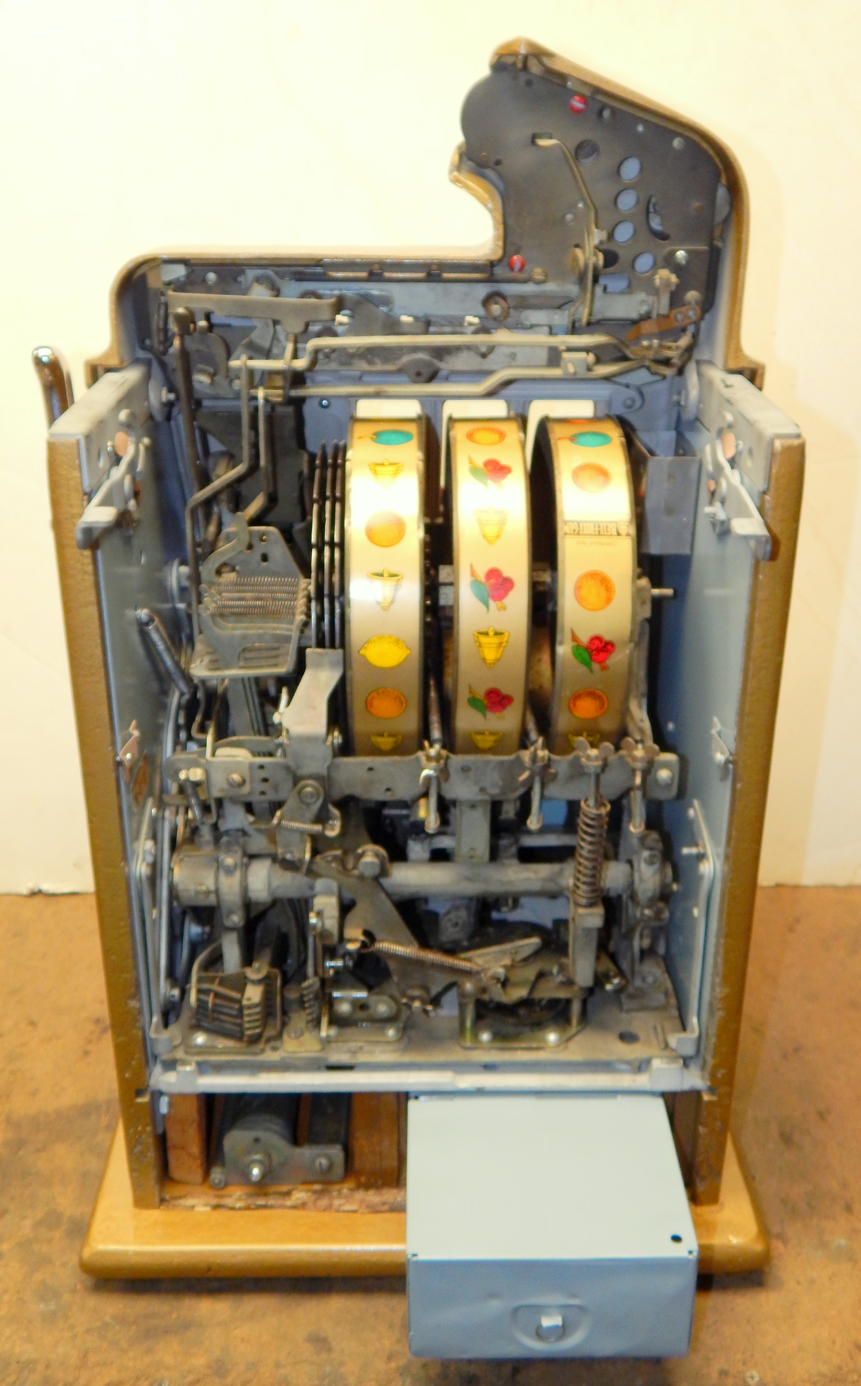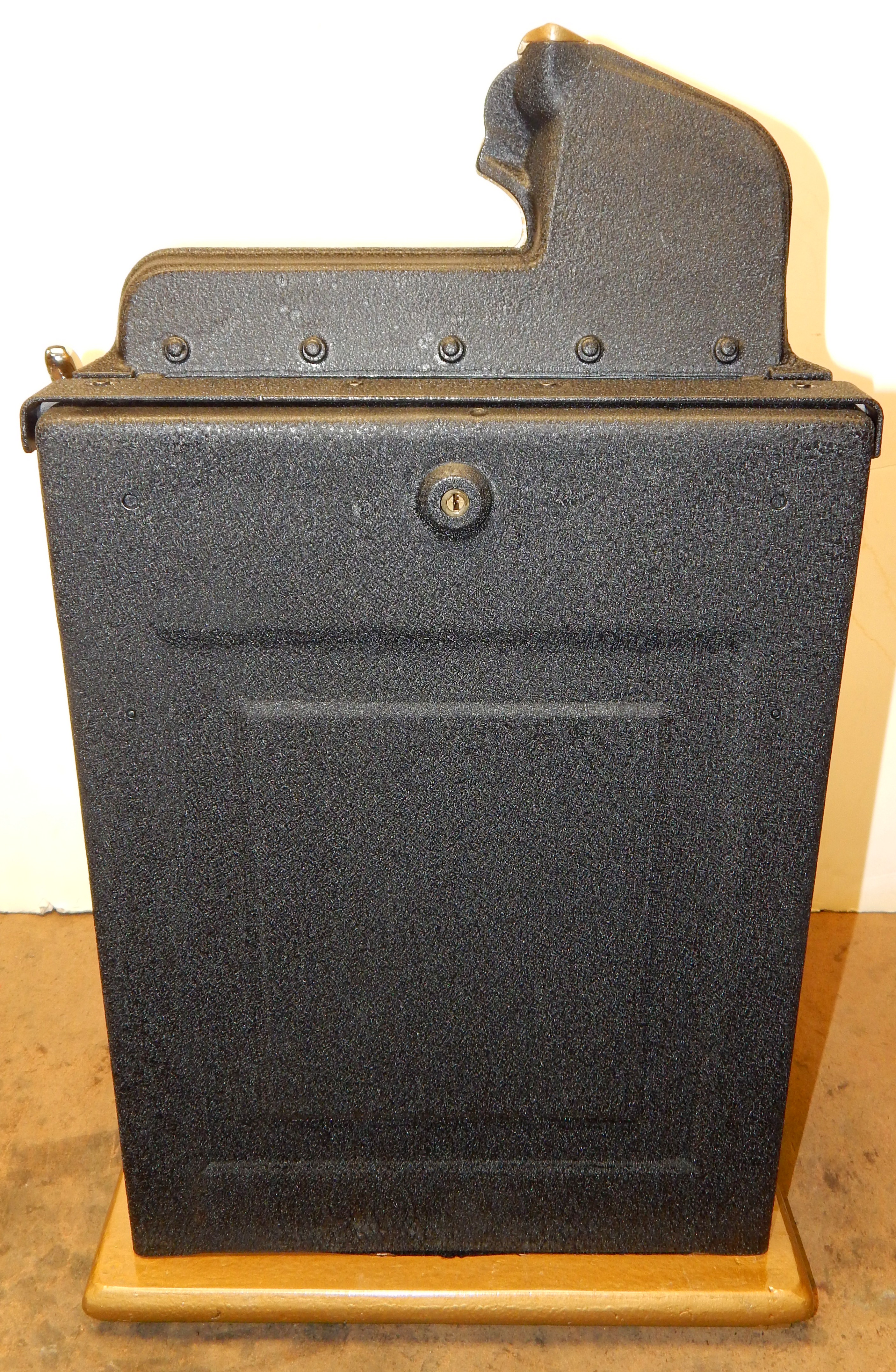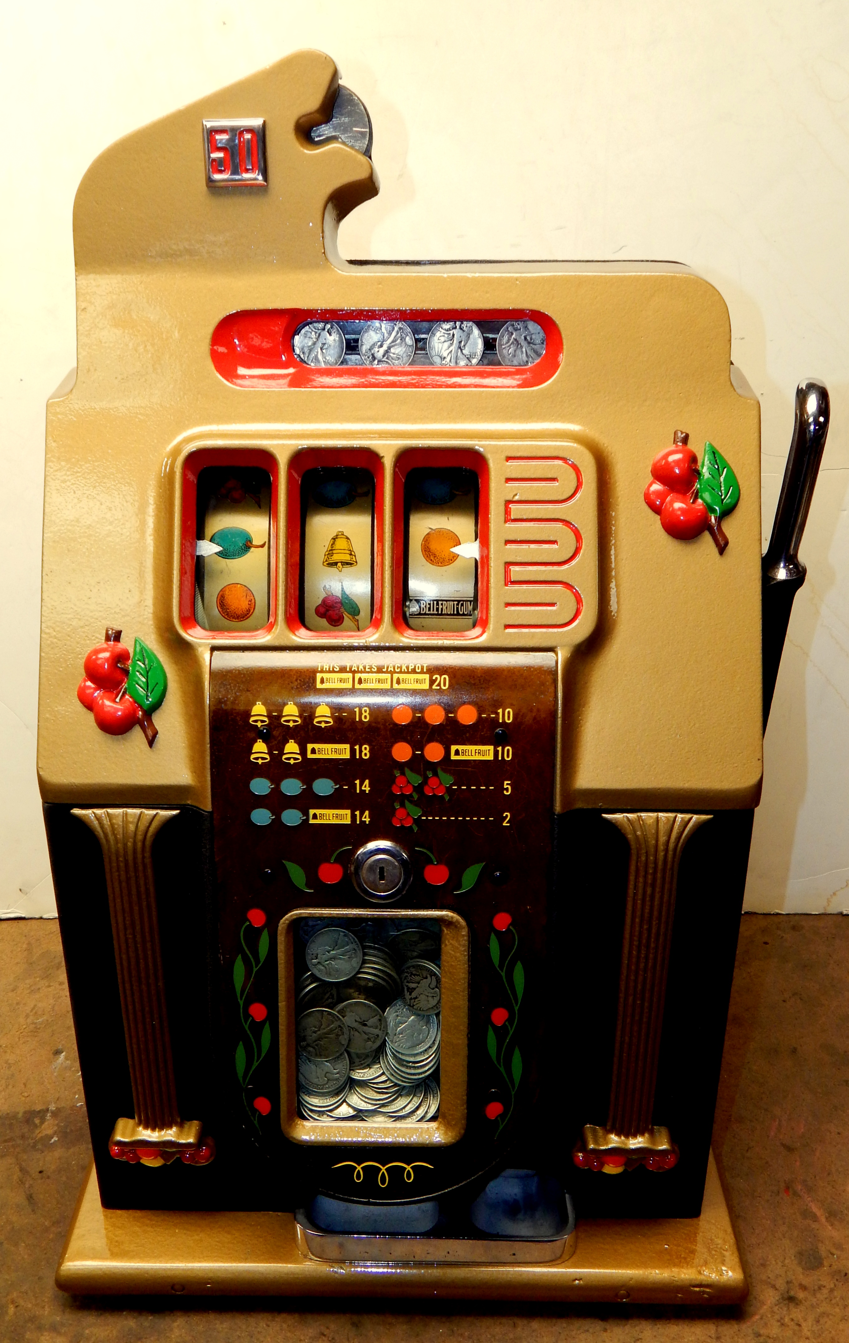 1946 Mills Golden Falls 50 cent, another large coin machine. Restored, painted back to it original colors, Hammer Gold trimmed in red. Front load Jackpot, Original reel strips, original award card, original back door with Mills lock with one key, original cash box. Still has the original serial number tag on the inside. Plays very easy and pays as it should. Everything on this machine is original other than the paint and Mills decal. Very nice machine.