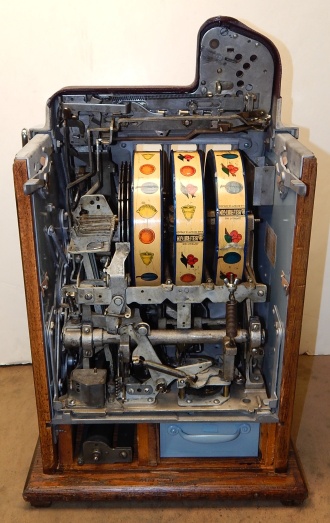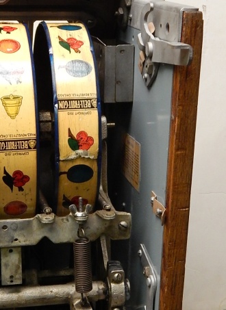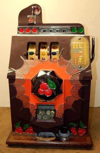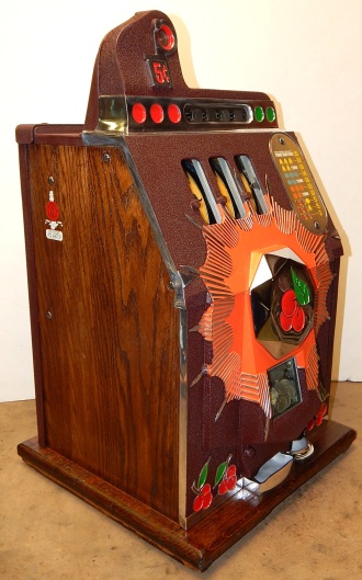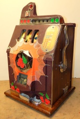 Mills 1938 Bursting Cherry, 5 cent . This is a very nice machine restored, Brown and Orange, with red and green trim colors. Mint condition award card, Jack pot with reserve, original back door and lock with one key, cash box. Still has the original paper inspection tag and serial number on the inside of the cabinet. Plays very easy, pays as it should. 3-5 payout.