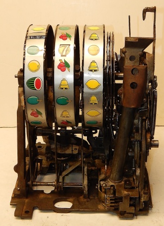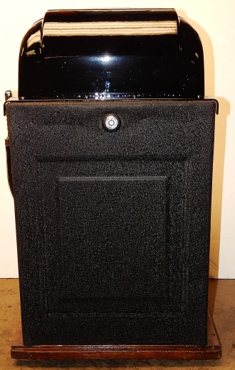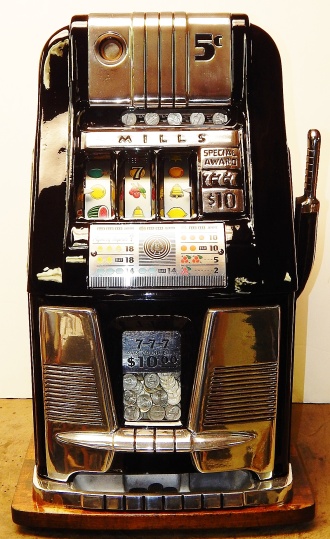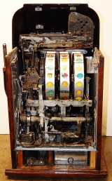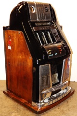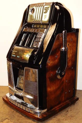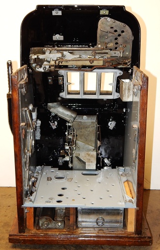 Mills 1958 " 7-7-7 " Hi-Top 5 cent, This is a very nice restored machine. Powder coated gloss black, cash box, original back door, jackpot with reserve, origiinal reel strips, very nice cabinet. The 7-7-7 token vendor has been removed before we received this machine. Plays very easy, 2-5 payout.