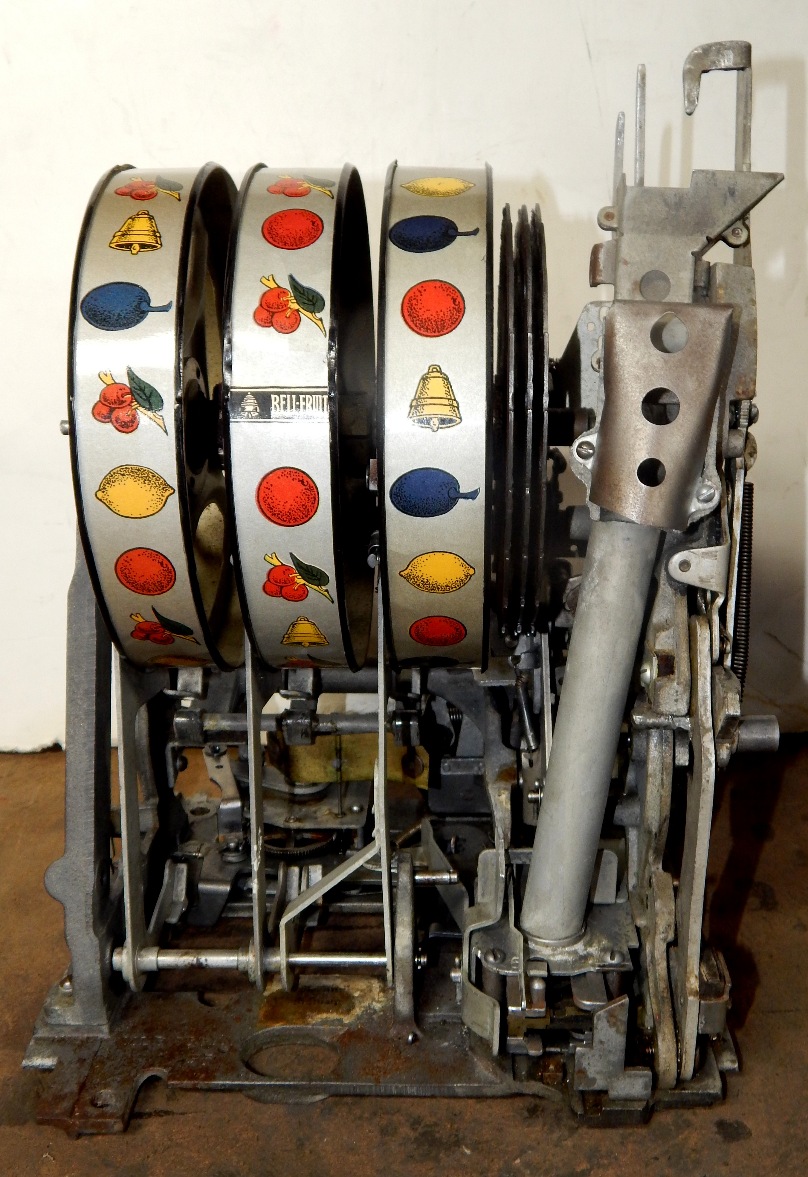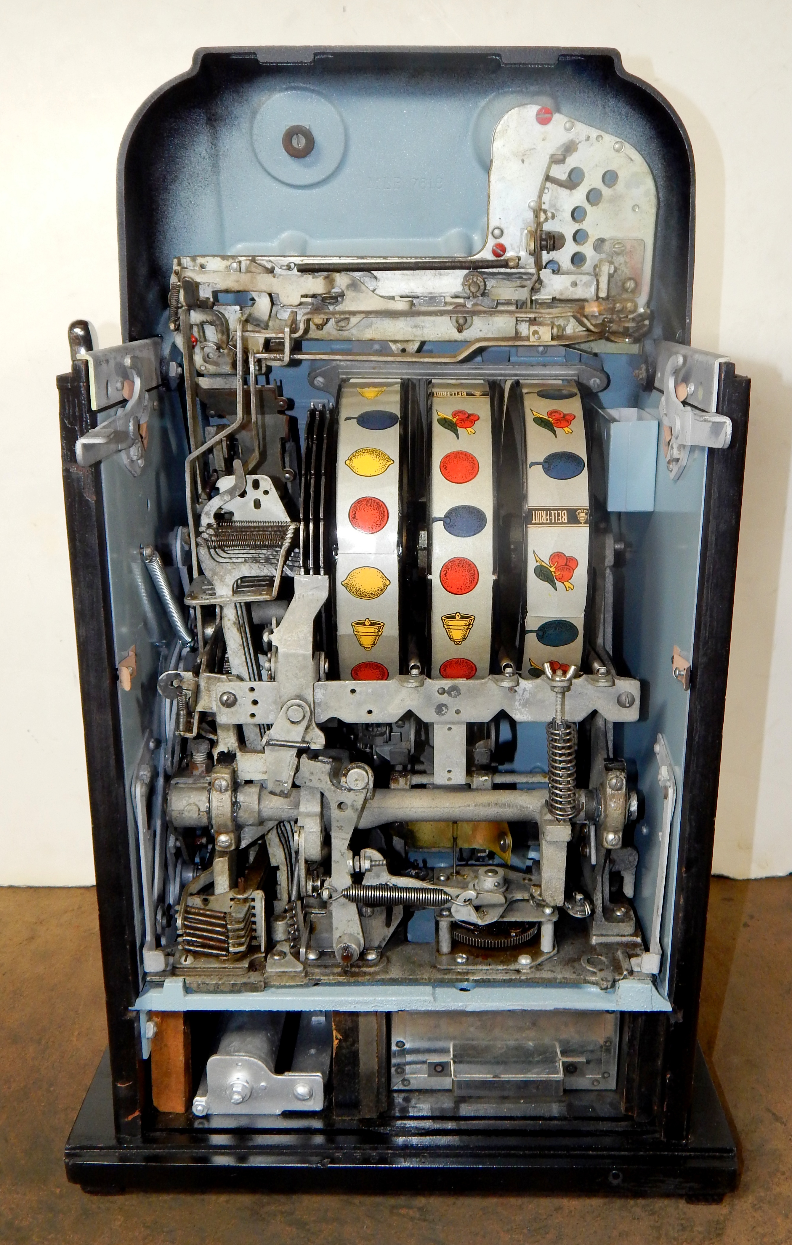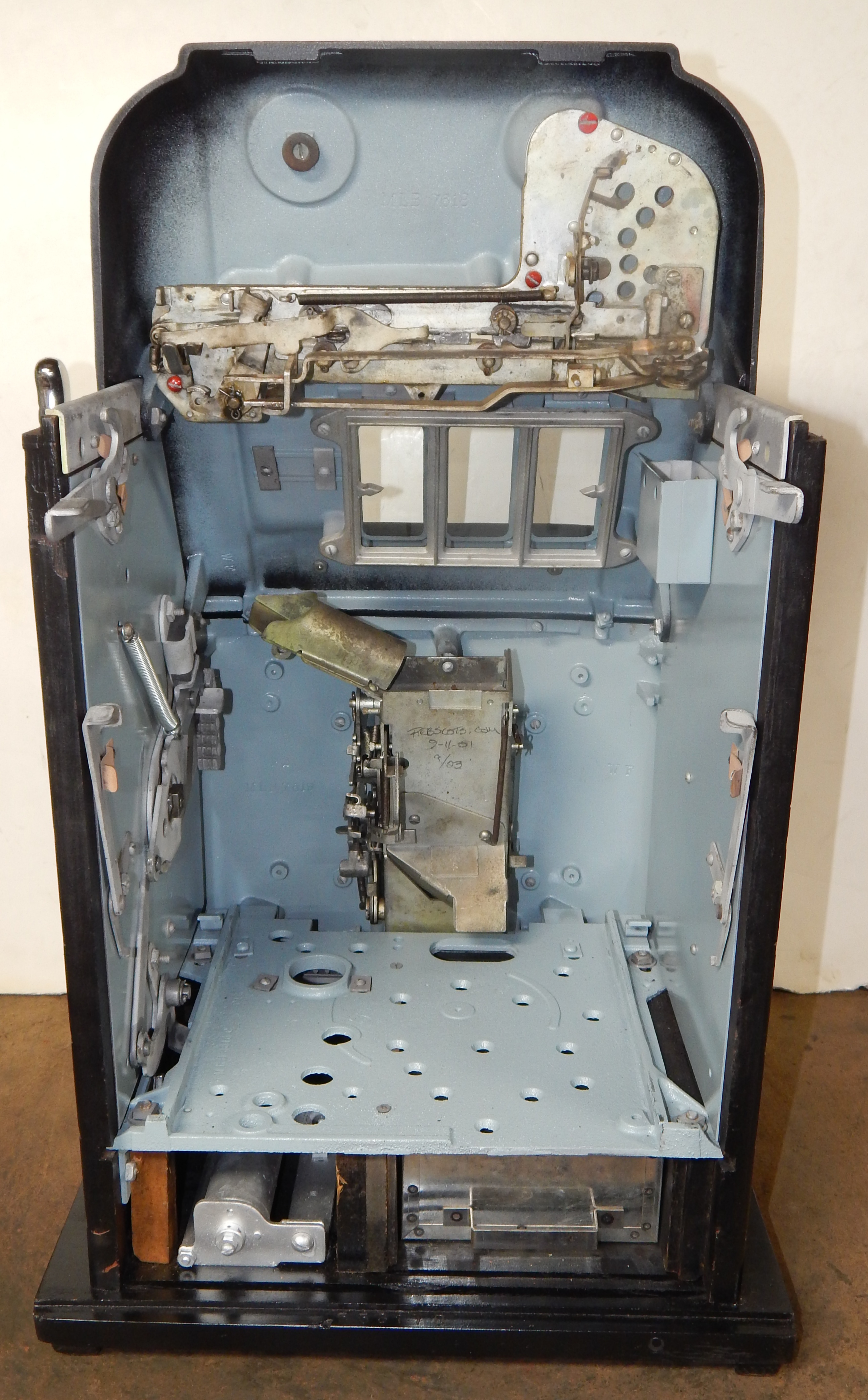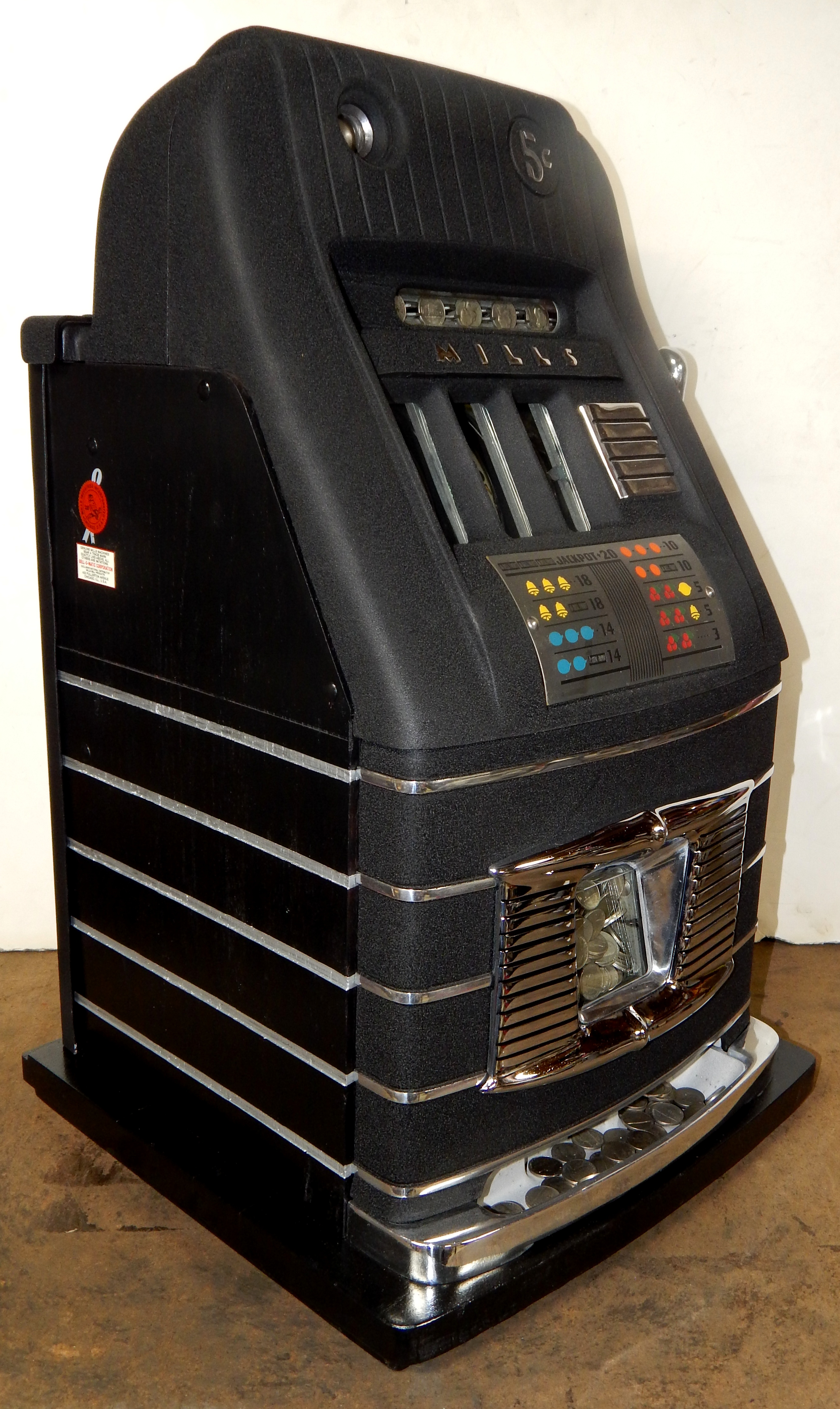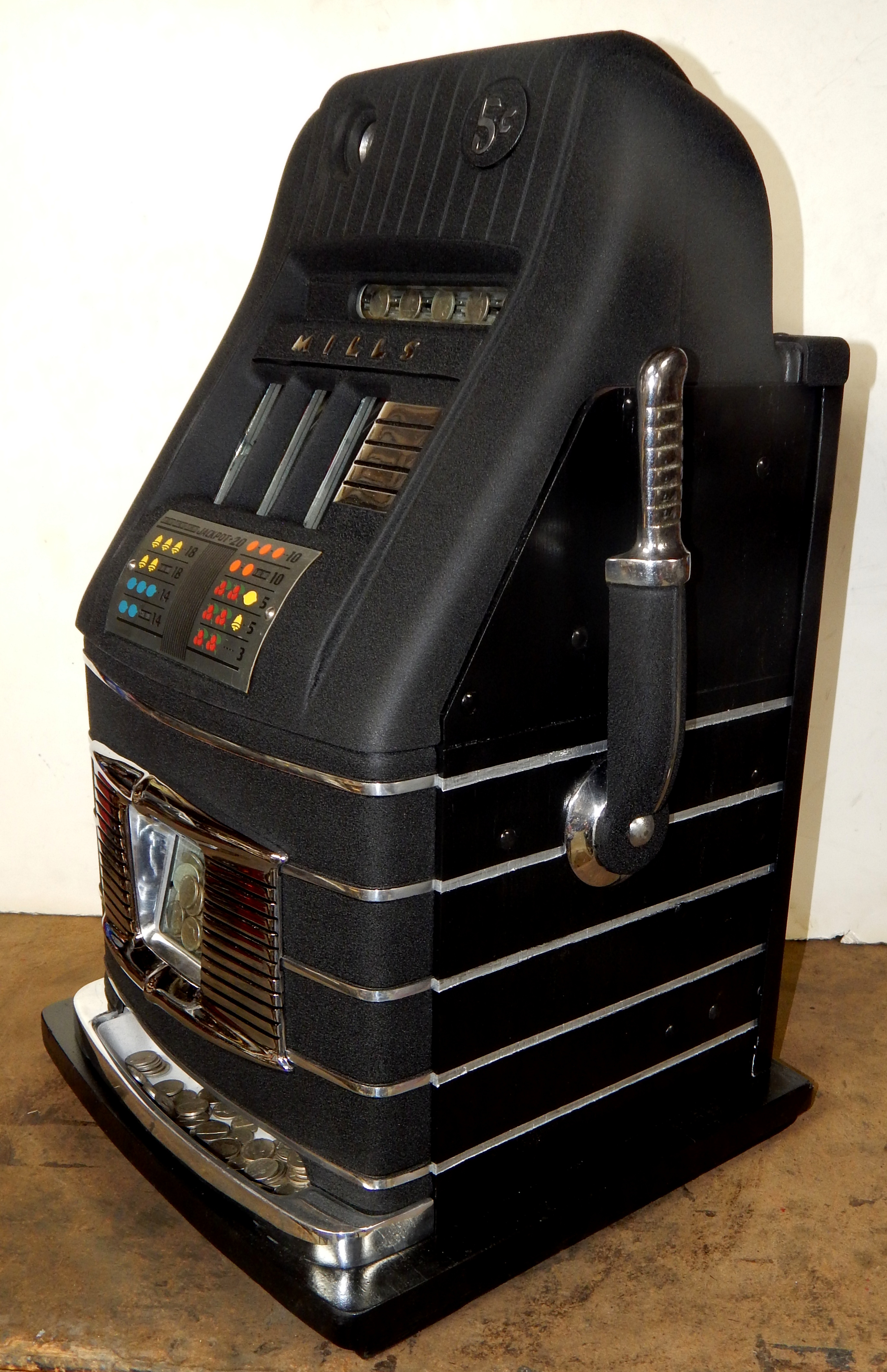 1947 Mills Jewel Bell Hi-Top 5 cent, This is a very nice restored machine. Painted wrinkle black. All the trim on this machine has been chrome plated to add a little flash to the black color. Mint condition original award card, Jackpot with reserve, original back door and lock with one key, original reel strips, new cash box. Plays very easy.