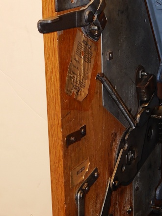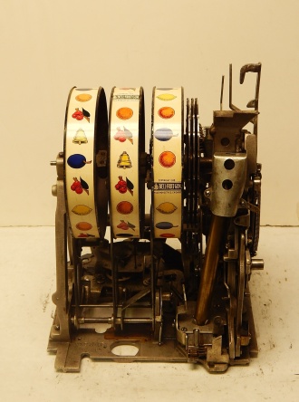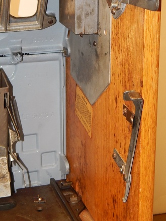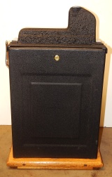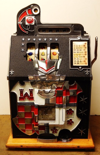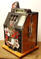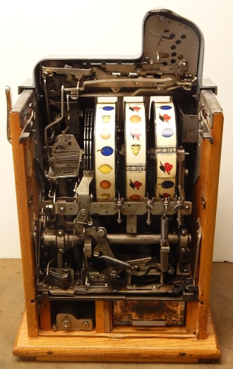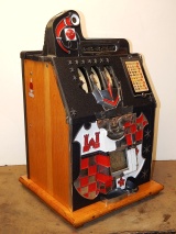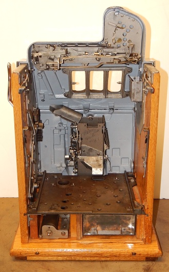 1934 Mills Castle Front 10 cent. Another very nice all original machine. Restored back to it's original colors, wrinkle black trimed in red and white. Jackpot with reserve, original reel strips, original back door, original Mills lock with one key, original cash box. Mint original oak cabinet. Still has the original paper work on the inside of the cabinet. This is the way you want to find them. Plays very easy, 3-5 payout.