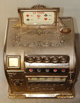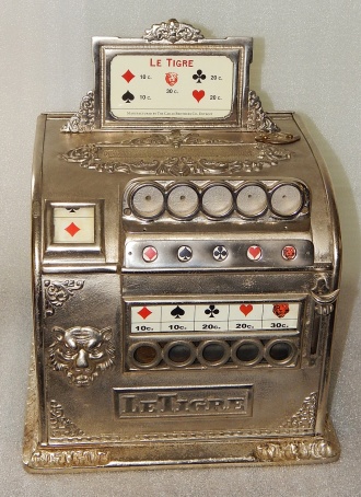 1911 Caille "Le Tigre". Made of cast iron and nickel plated. It was manufactured back in 1911 with a beautiful ornate design, the "Le Tigre" is Caille's French version of its "The Tiger" U.S. version one wheel slot machine. It can be played with large size 10c French coppers and pays out winning bet in French coins (both type of which are supplied) It is very scarce with 25 to 50 known to exist of this 100 plus years old machine.