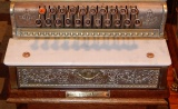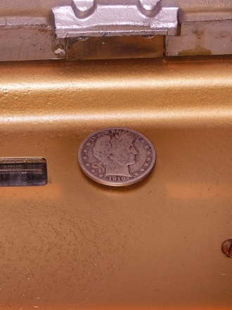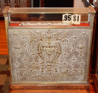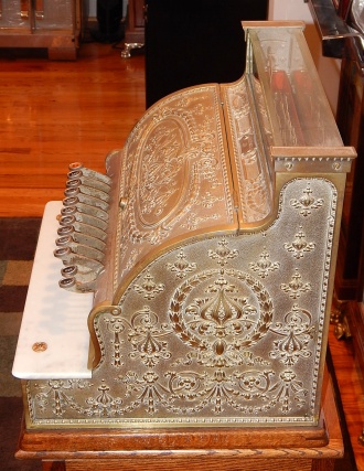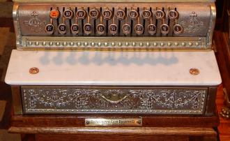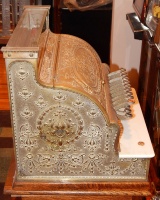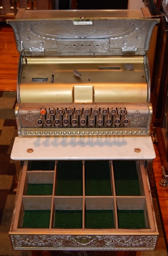 National Cash Register Model #333, very nice Brass National cash register, previously restored. 17"x17"x17" about 80 pounds. Has a 1910 quarter mounted under the top door. Everything works fine. What you see is what you get.