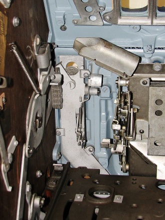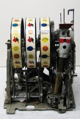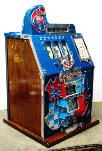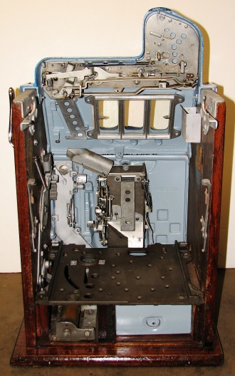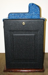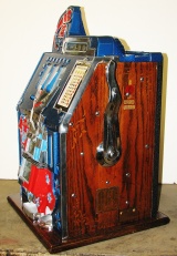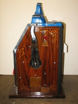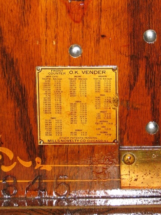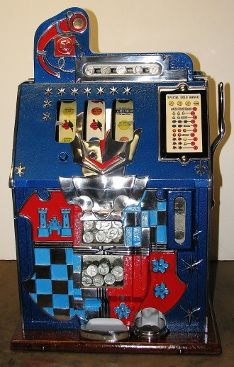 1938 Mills Castle Front with Gold Award, 5 cent. Castings have been restored back to the original colors. Jackpot and reserve, original fortune Reel Strips in mint condition, original back door, original lock with one key, original cash box. Also has the original Gold Award token vendor with four original Gold Award tokens. The cabinet on this machine has the origianl finish because, of the condition of the gold leaf, Mills decal, and Mills patent plate. Play and pays as it should, 3-5 pay out
