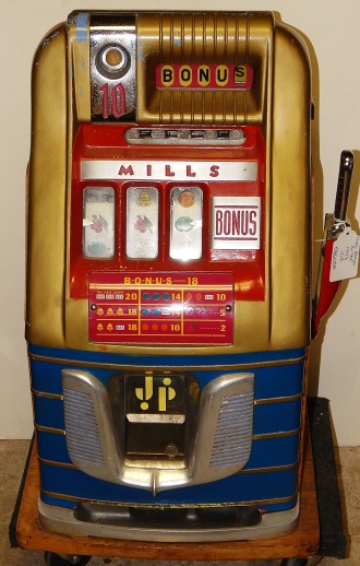 Mills 1948 Bonus Hi-Top 10 cent with the Hard to find Bonus feature. Previously restored, colors. Very nice original oak cabinet, jackpot with reserve, original reel strips. Original cash box, original back door, original Mills lock with one key.
