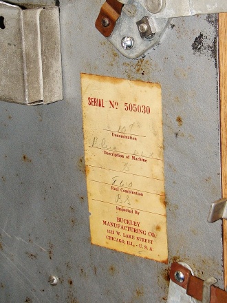 1948 Buckley Criss Cross Jackpot Bell 10 cent, comes with six original jackpot tokens, original extra large cash box, original reel strips, original award card, and original back door. Looking at the mechanism, this machine didn't see much service. The paint looks to be original also, a very nice machine inside and out. This machine also has the reserve play stopper for the coin entry hole so no one could play the machine while you were gone to get more coins. If you look close at the inspection tag on the inside of the cabinet, you will see its a 2/5 pay out with a 86% reel bundle. Play very easy and pays as it should. If you are looking for a very nice example of a Buckley Slot machine here you are.