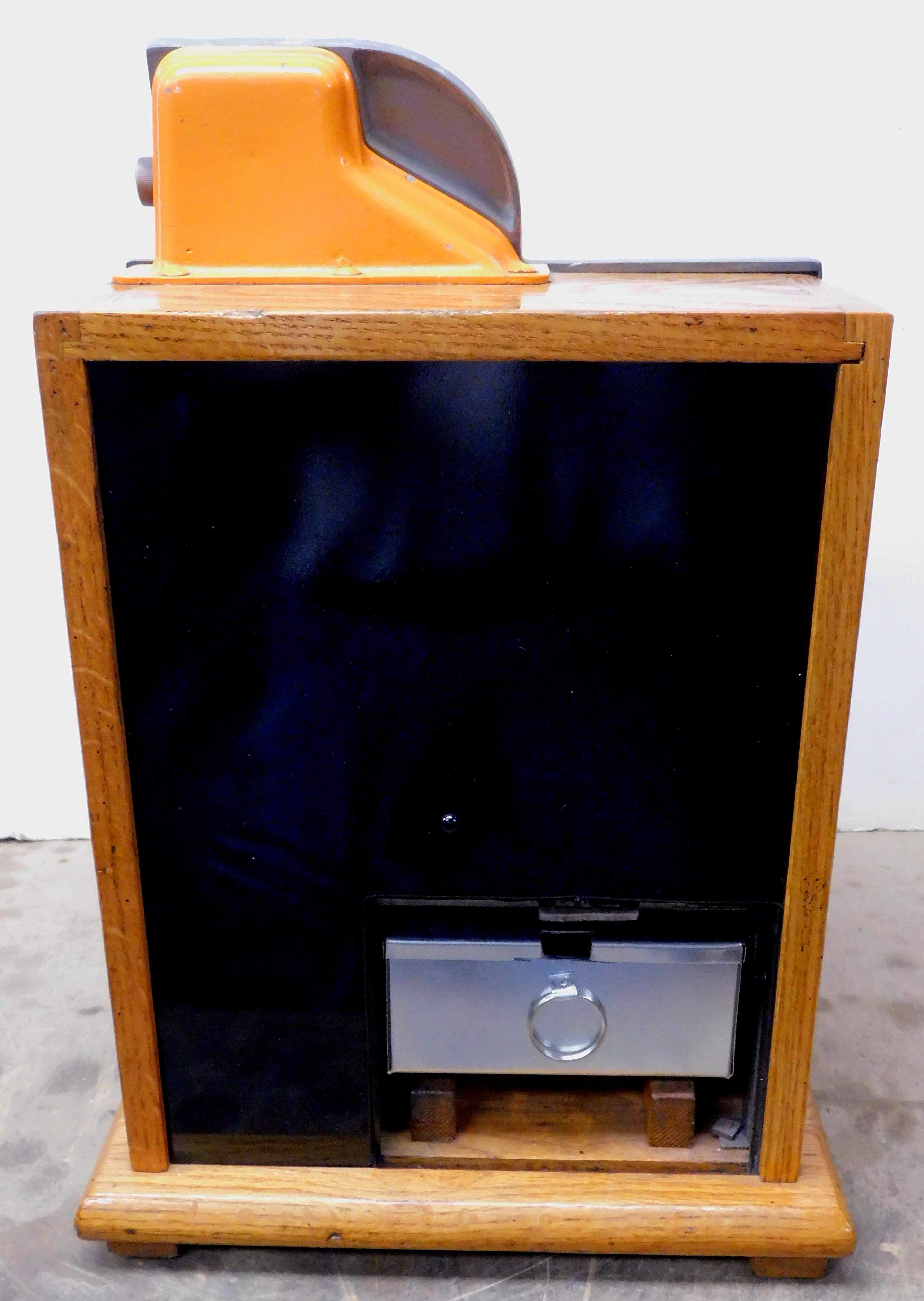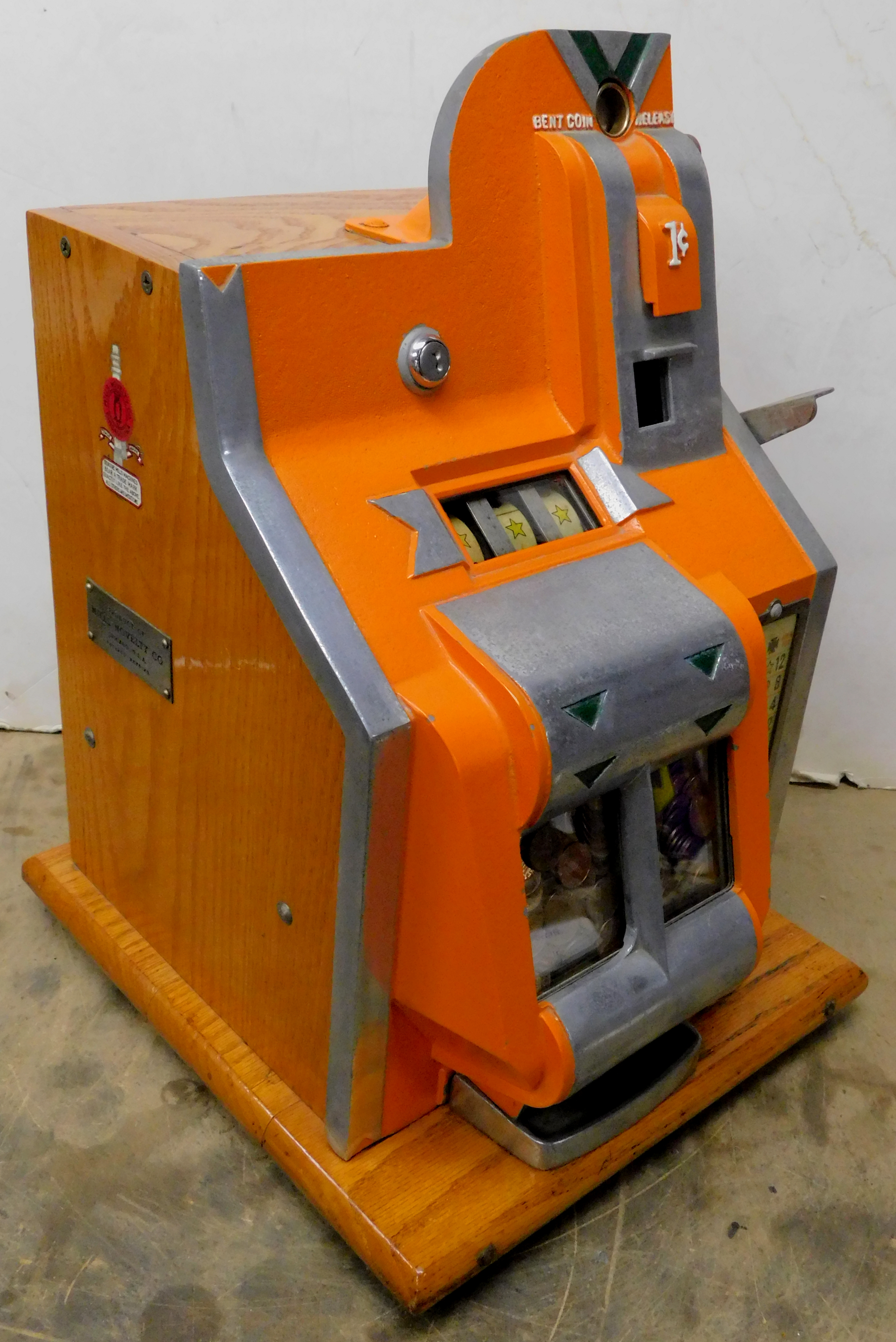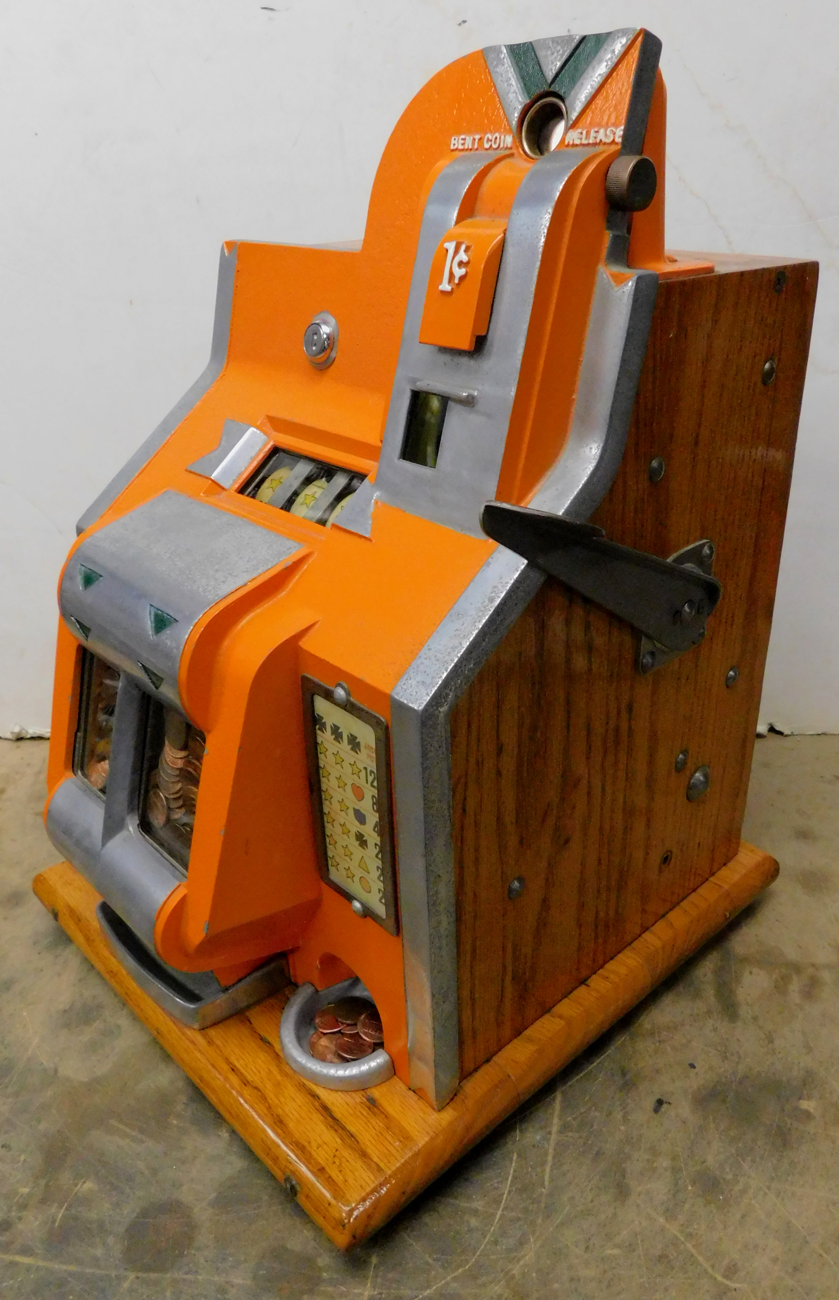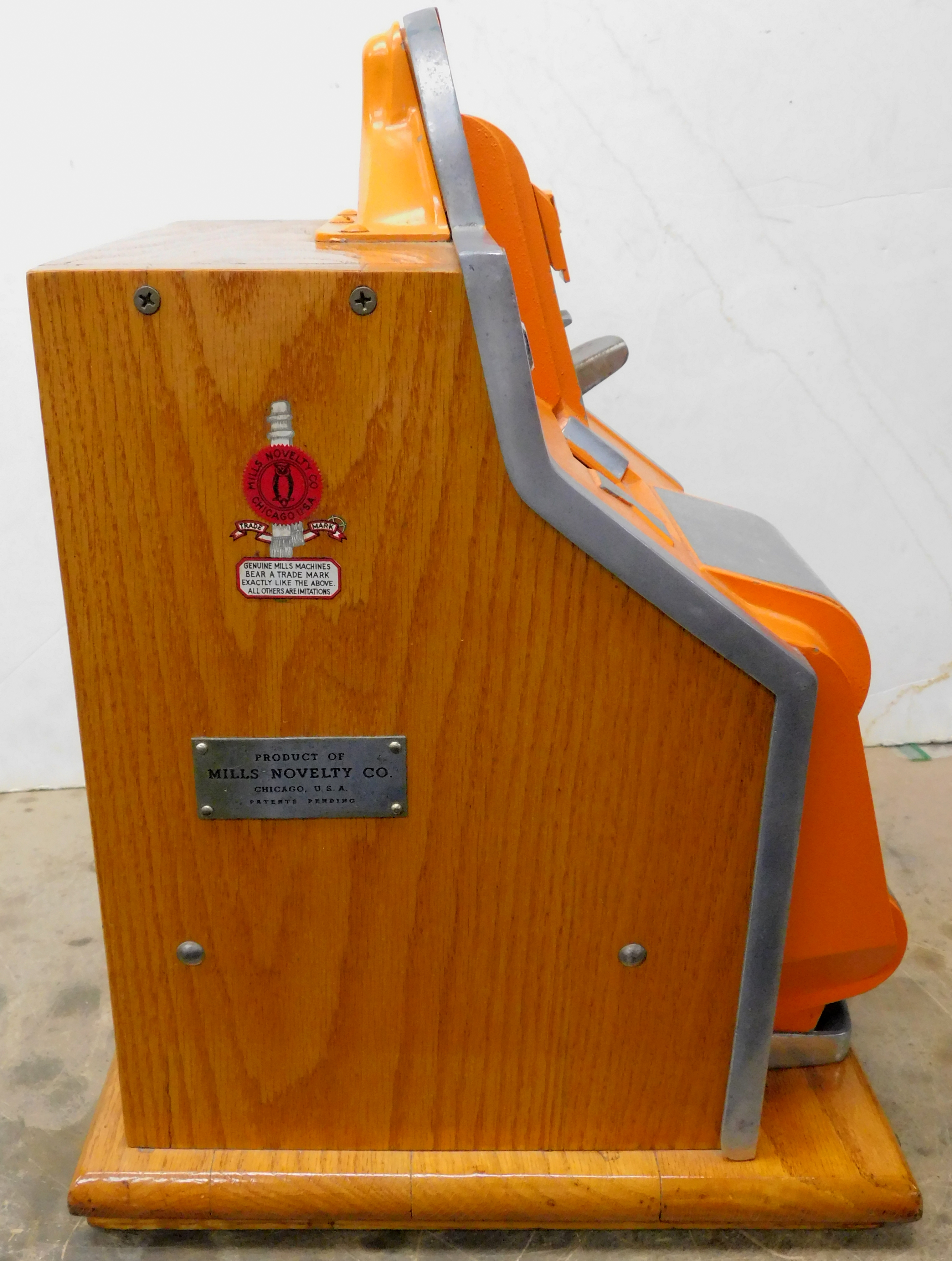 Mills 1935 QT "Chevron" Penny. Previously restored. Orange trimmed in green in color. Twin Jackpots, original reel strips, new cash box. Very nice Oak cabinet. Has a few small chips in the orange paint. Plays very easy.