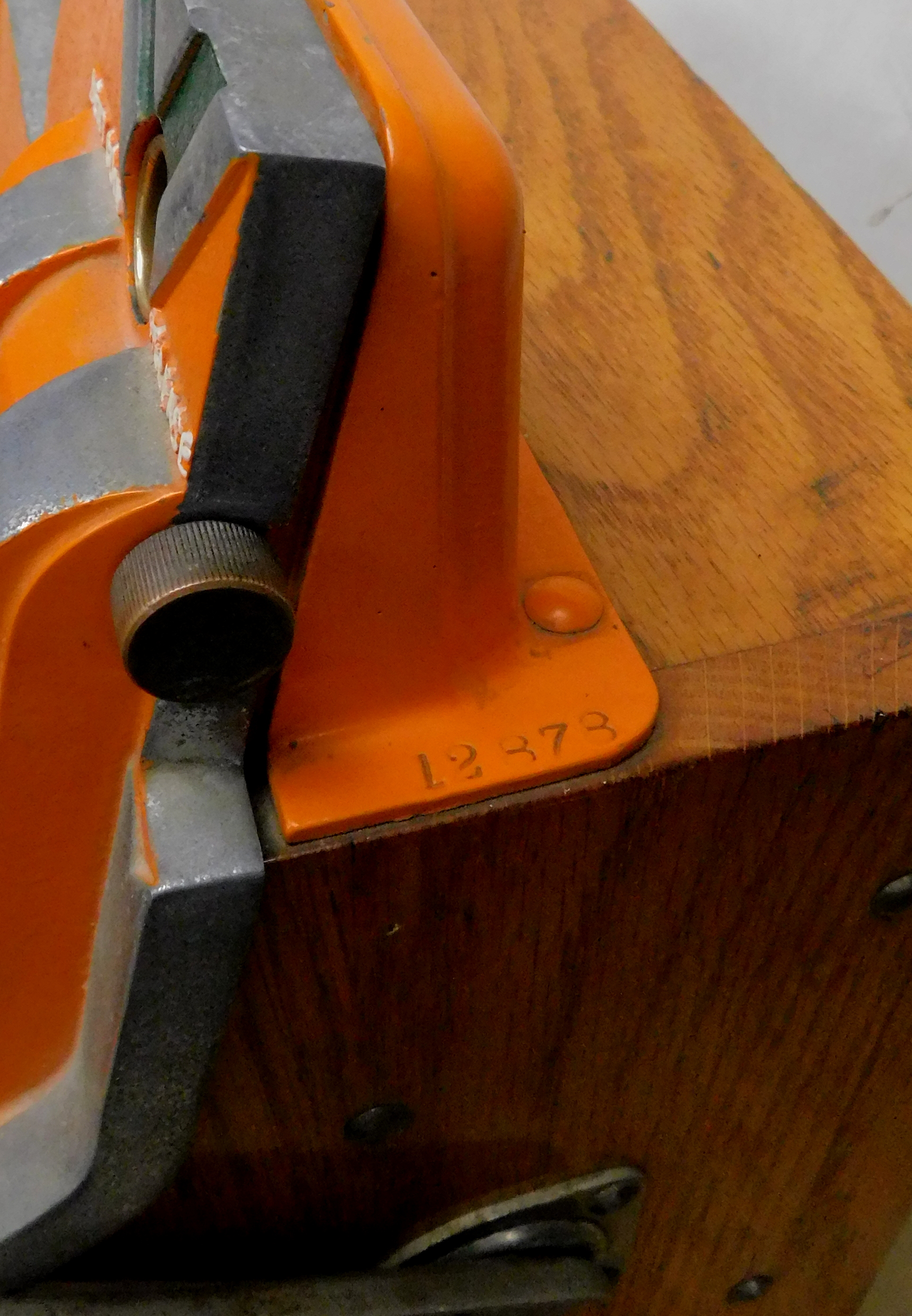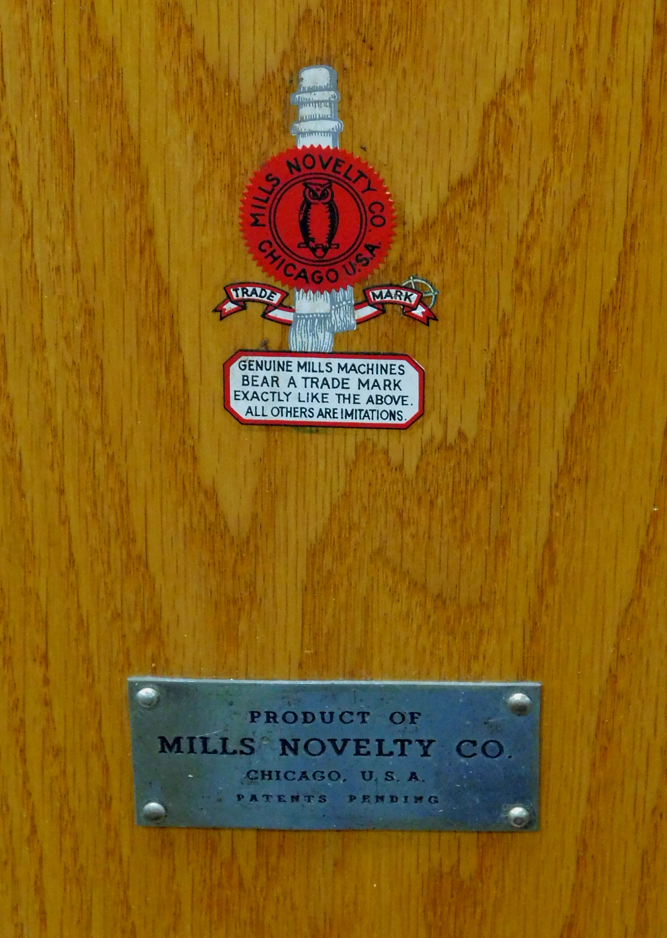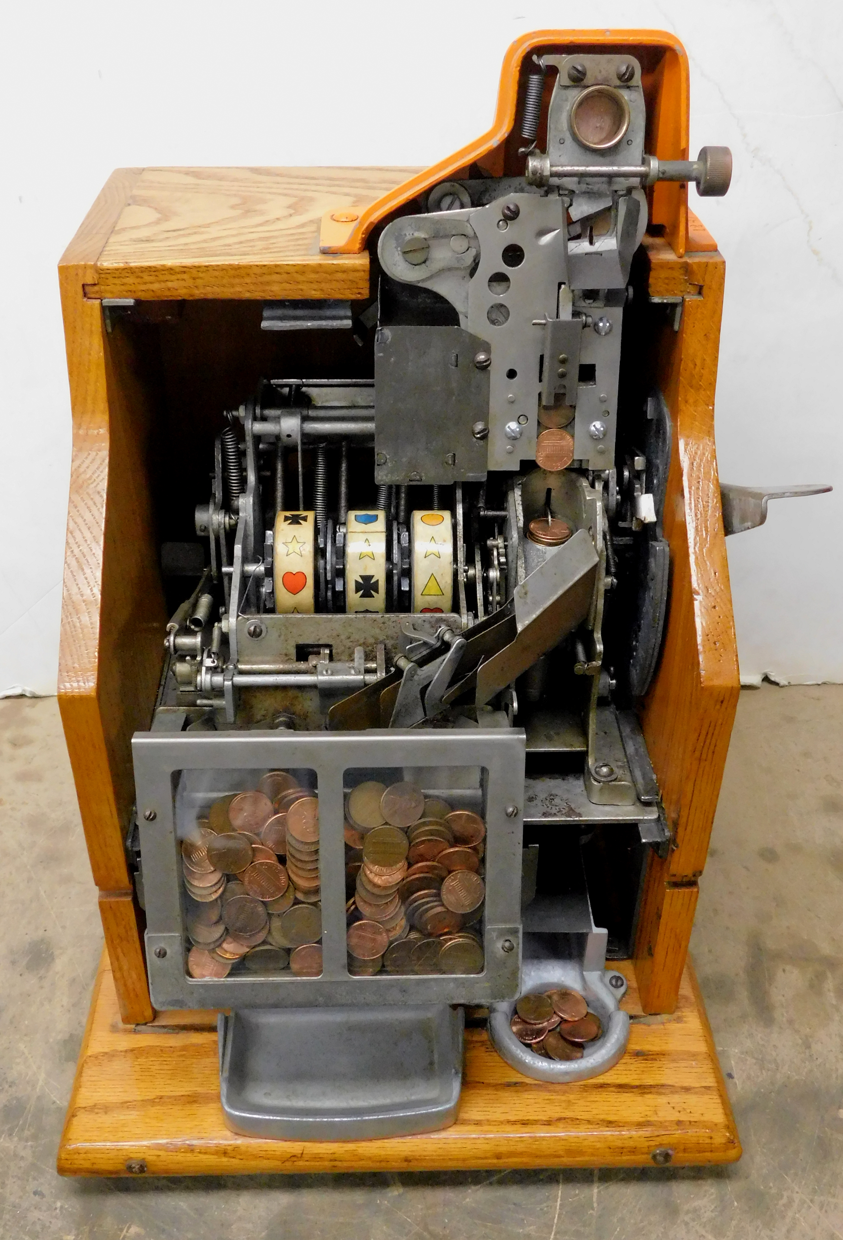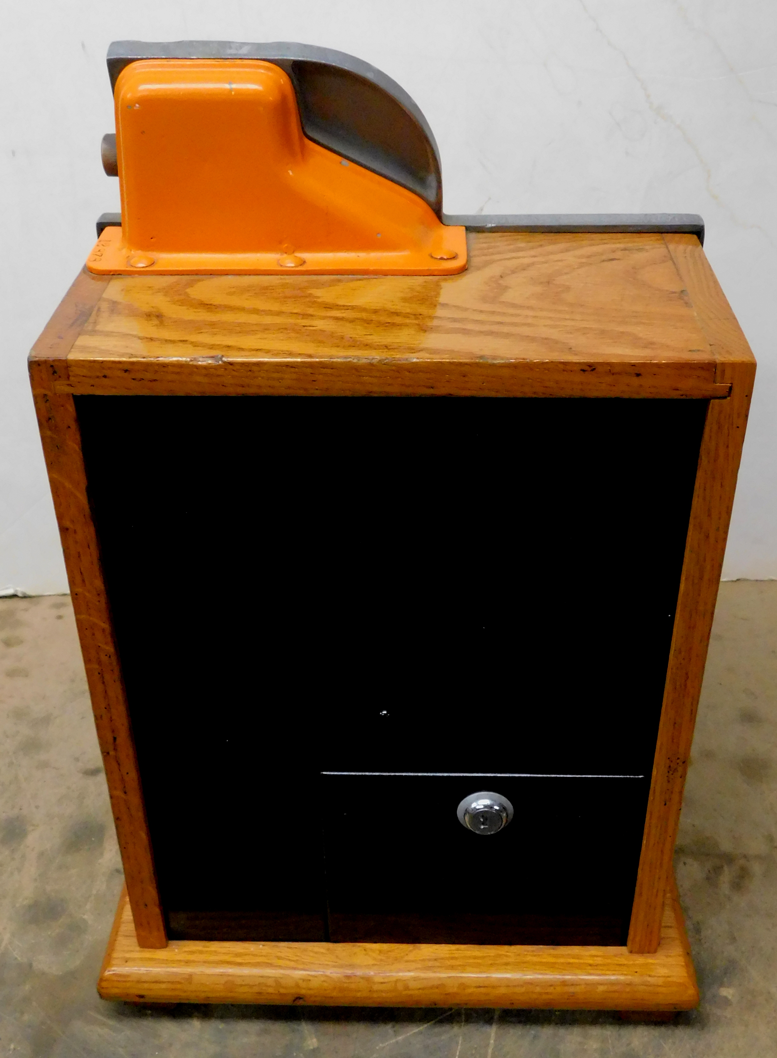 Mills 1935 QT "Chevron" Penny. Previously restored. Orange trimmed in green in color. Twin Jackpots, original reel strips, new cash box. Very nice Oak cabinet. Has a few small chips in the orange paint. Plays very easy.