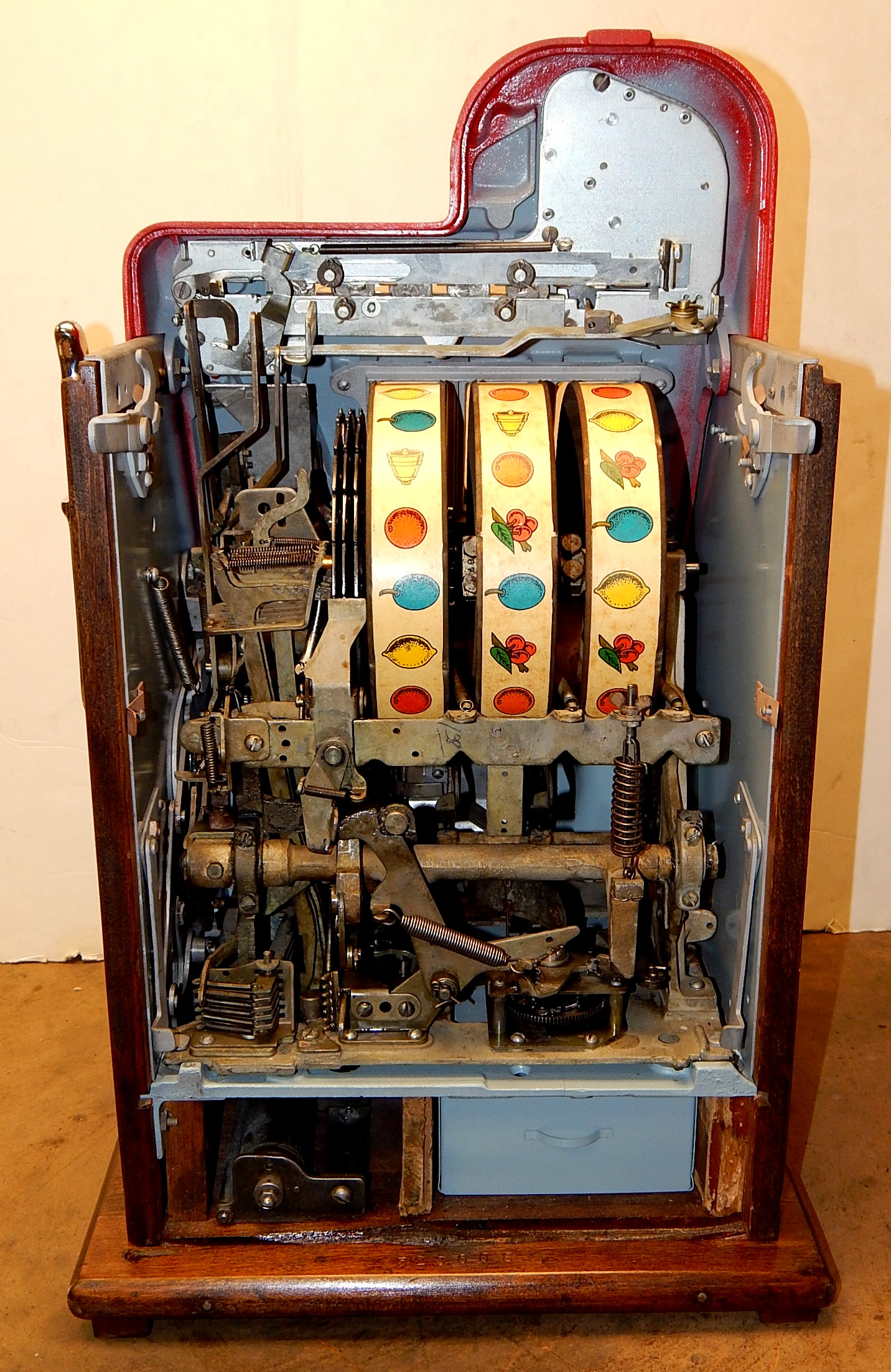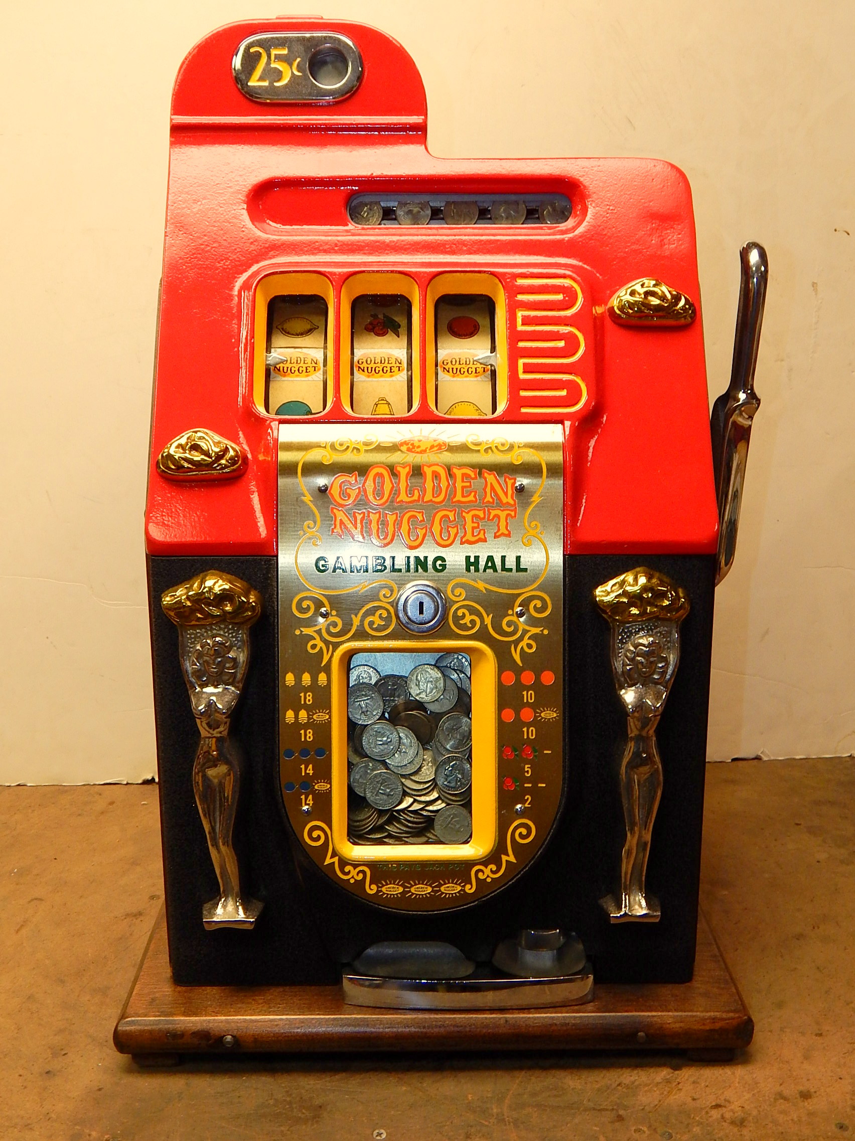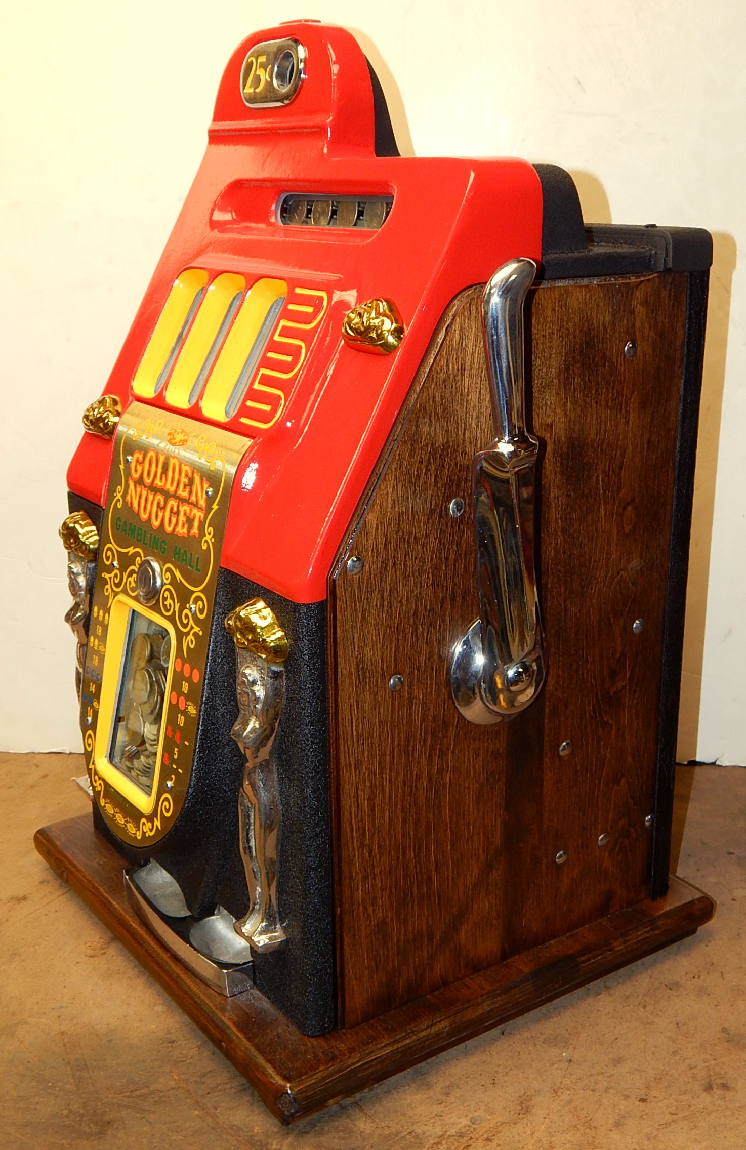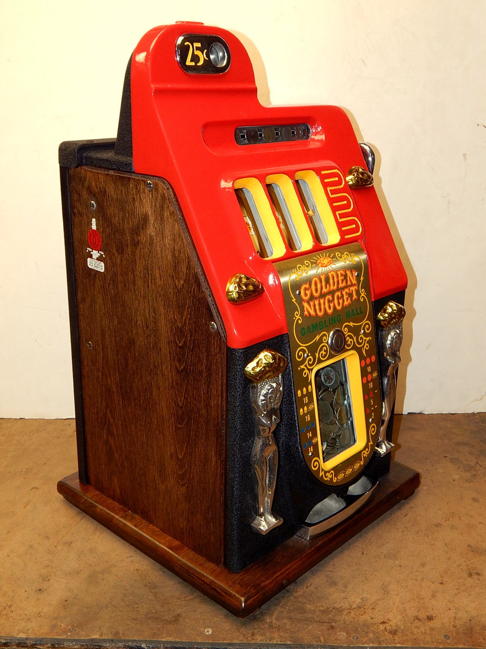 This machine was never in the Golden Nugget casino in Las Vegas. There were only a hundred or so Golden Nugget machines made for the casino back in the 50s. I don't want any one to think this is a original machine from the casino. The golden nugget kit was added to an original 1947 Black Cherry which only consist of two dolls, two nuggets, reel strips, and a award card. The machine it self is all original made by Mills